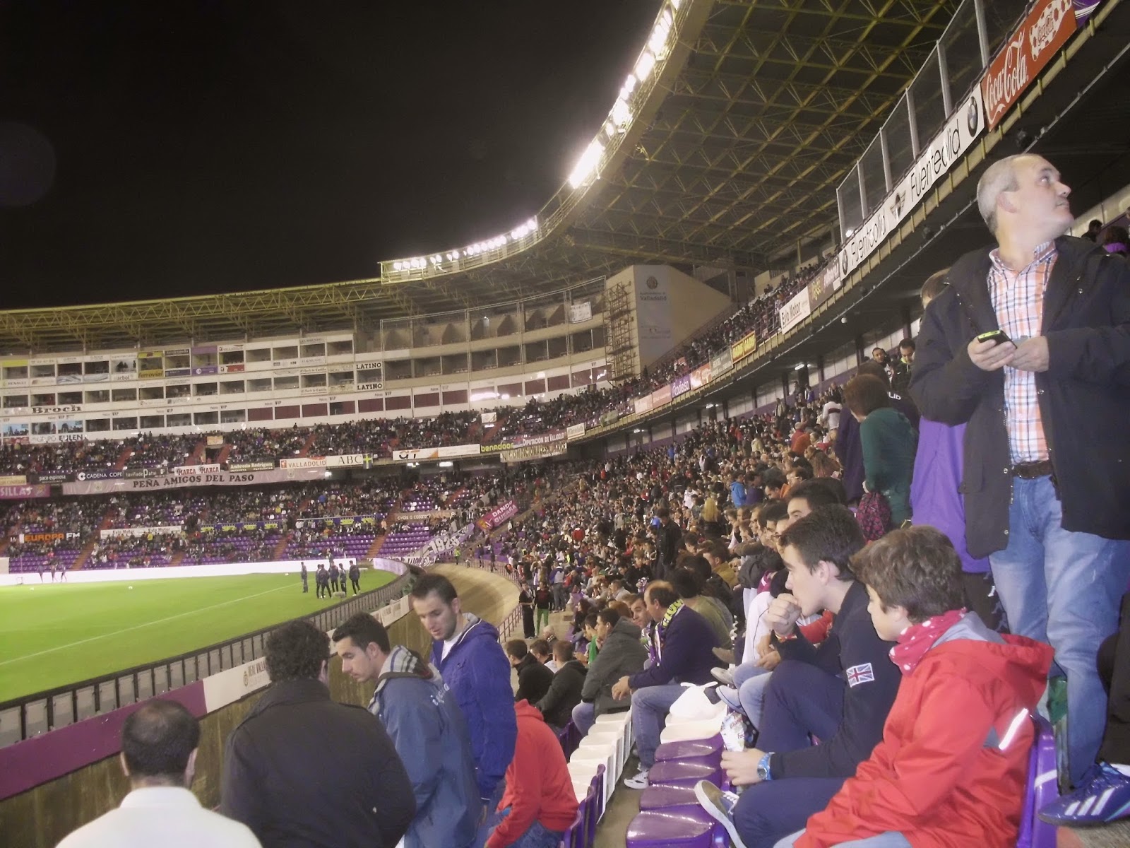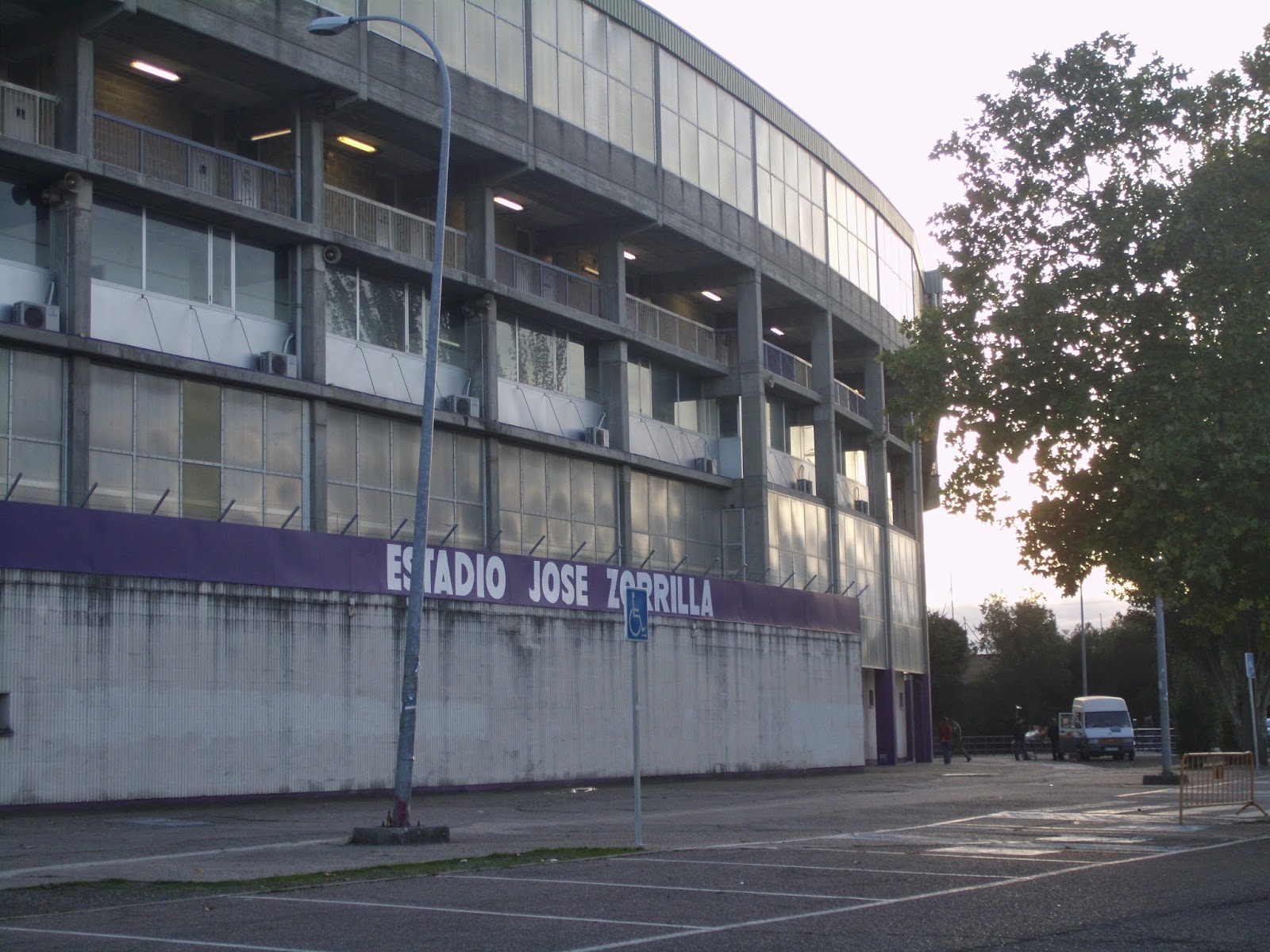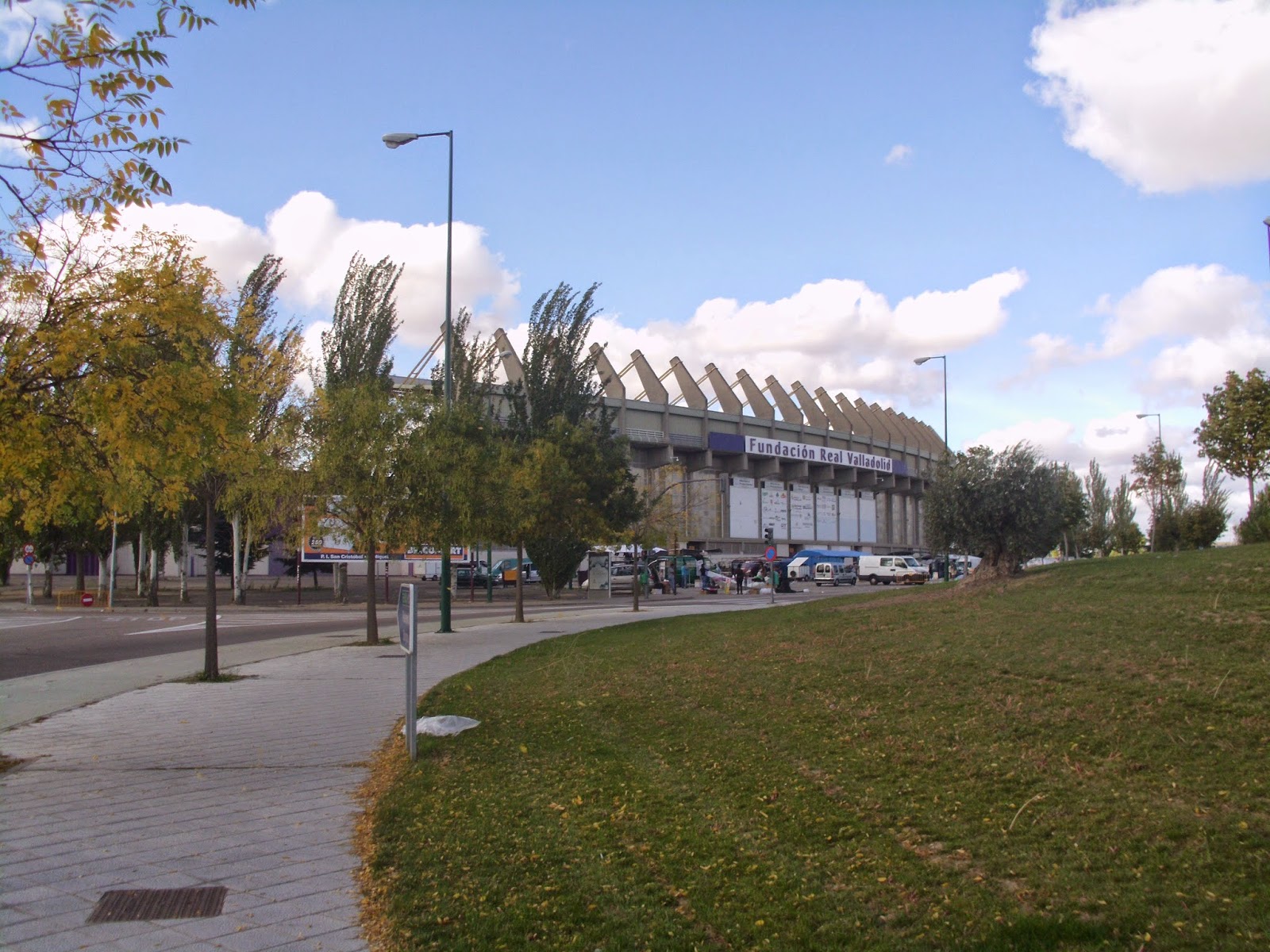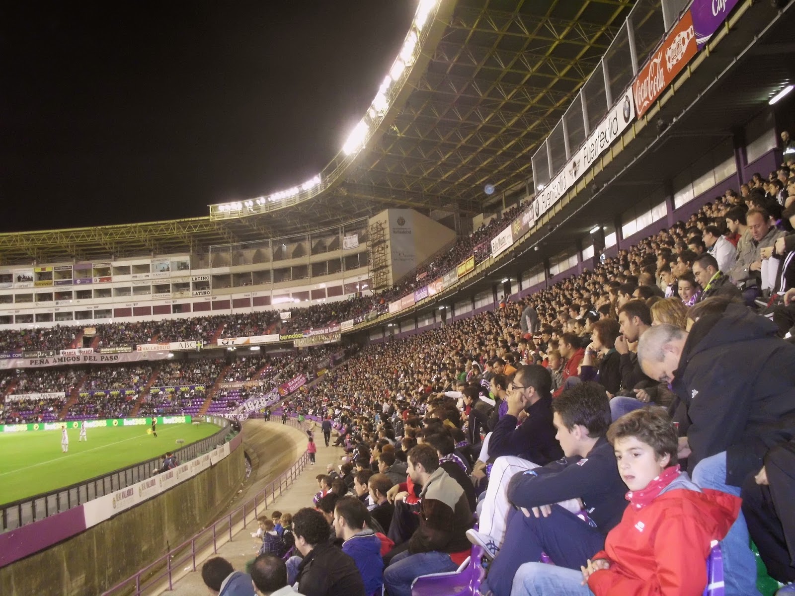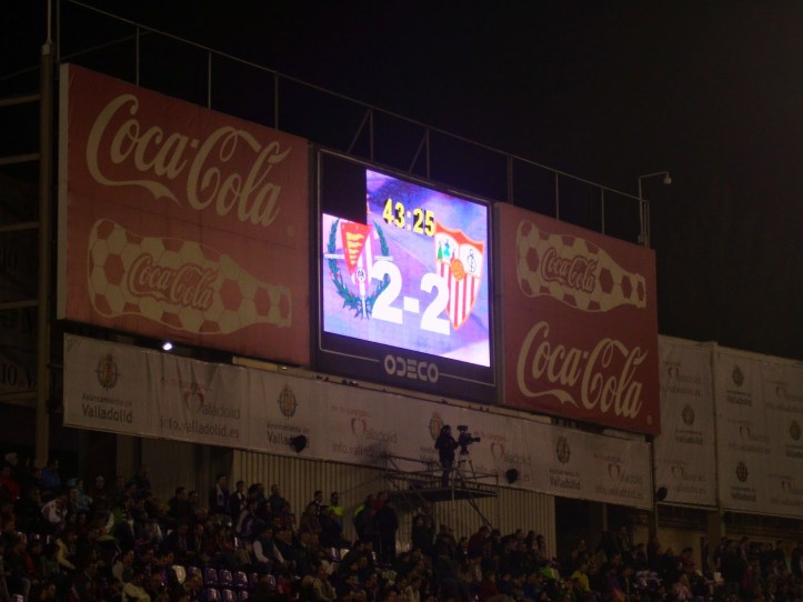 Für das sonntägliche Spiel der Primera Division begebe ich mich rund 180 km nordöstlich von Madrid. Das Nuevo Estadio Jose Zorrilla befindet sich rund vier Kilometer außerhalb des Stadtzentrums und ist schon sehr bald zu sehen, weil es sich auf einer Hügelkuppe befindet. Direkt daneben ist ein riesiges Einkaufszentrum, auf dessen Parkplatz entweder die Weihnachtsbeleuchtung bereits wieder hängt oder diese sicherheitshalber gar nie abgeräumt wurde. Zudem steht um die Ecke auch noch ein wohl vor der Immobilienkrise errichtetes schmuckes Kulturzentrum. Die Stadt selbst ist eher unauffällig, über weite Strecken reiht sich Plattenbau an Plattenbau. Etwas außerhalb der City sind dann einige neue Wohnblöcke errichtet worden, aufgrund des sehr schmalen Verkehrsaufkommens würde ich allerdings darauf tippen, dass nicht allzu viele Menschen hier auch tatsächlich leben.