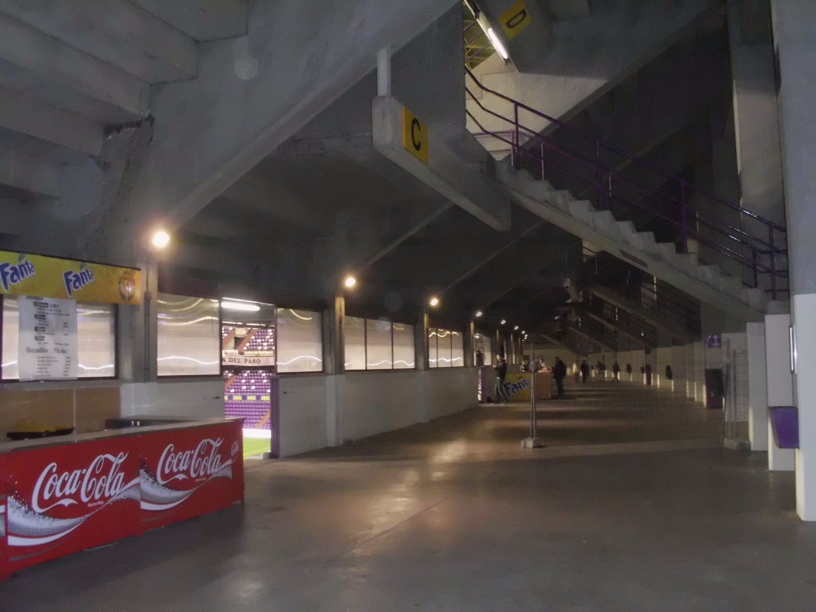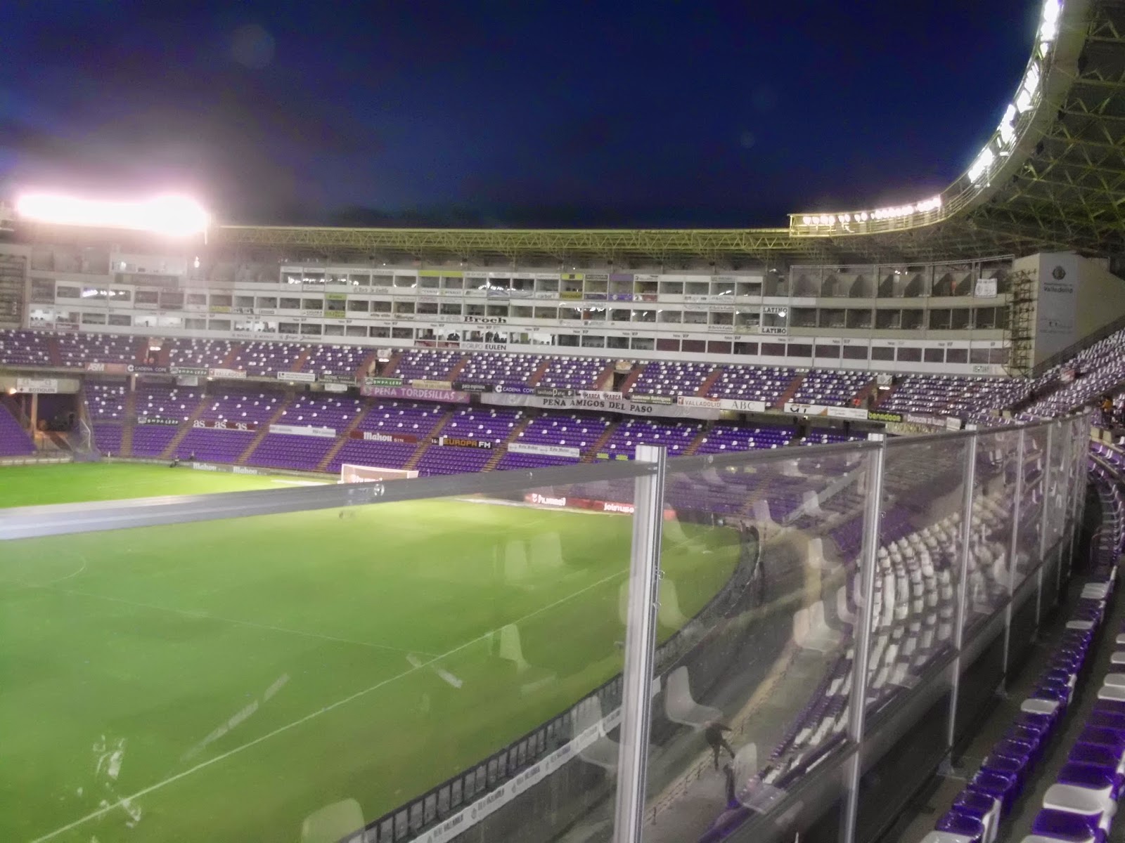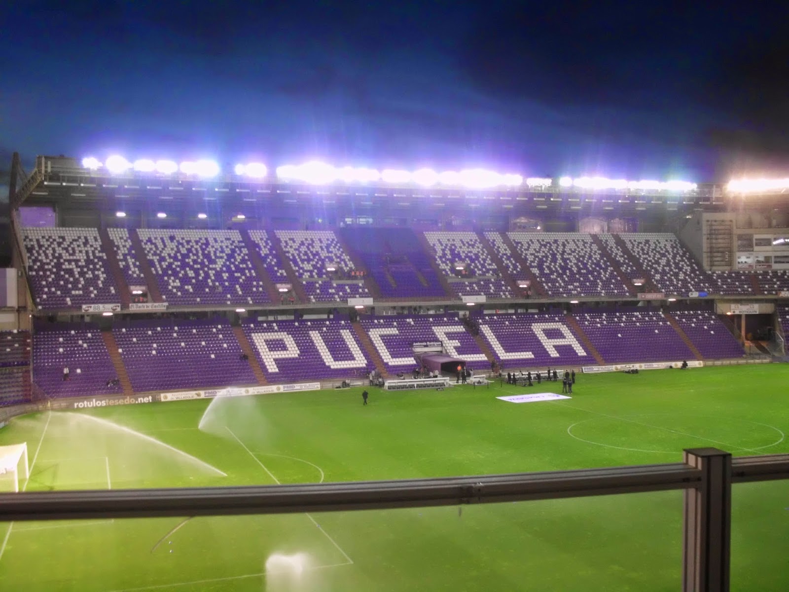Innen sind die Haupttribünen in Hufeisenform angeordnet, die Südkurve wurde erst später dazugebaut. Das durch die Farben der Sitze geformte „Pucela“ ist übrigens nichts anderes als der Spitzname der Stadt. In der Mitte der Doppelränge ragen die mächtigen VIP-Tribünen auf, zur einfacheren Crowdcontrol hat man rund um das Spielfeld einen Graben gezogen. Das Grün wirkt so fast wie eine schwimmende Insel in der Betonschüssel, die unteren Reihen befinden sich sogar unterhalb des Spielfeldniveaus. Während des Spiels kommen einem die Kicker meinem Eindruck nach fast irreal vor – noch dadurch verstärkt, dass die beiden Strafräume besonders gut ausgeleuchtet sind.