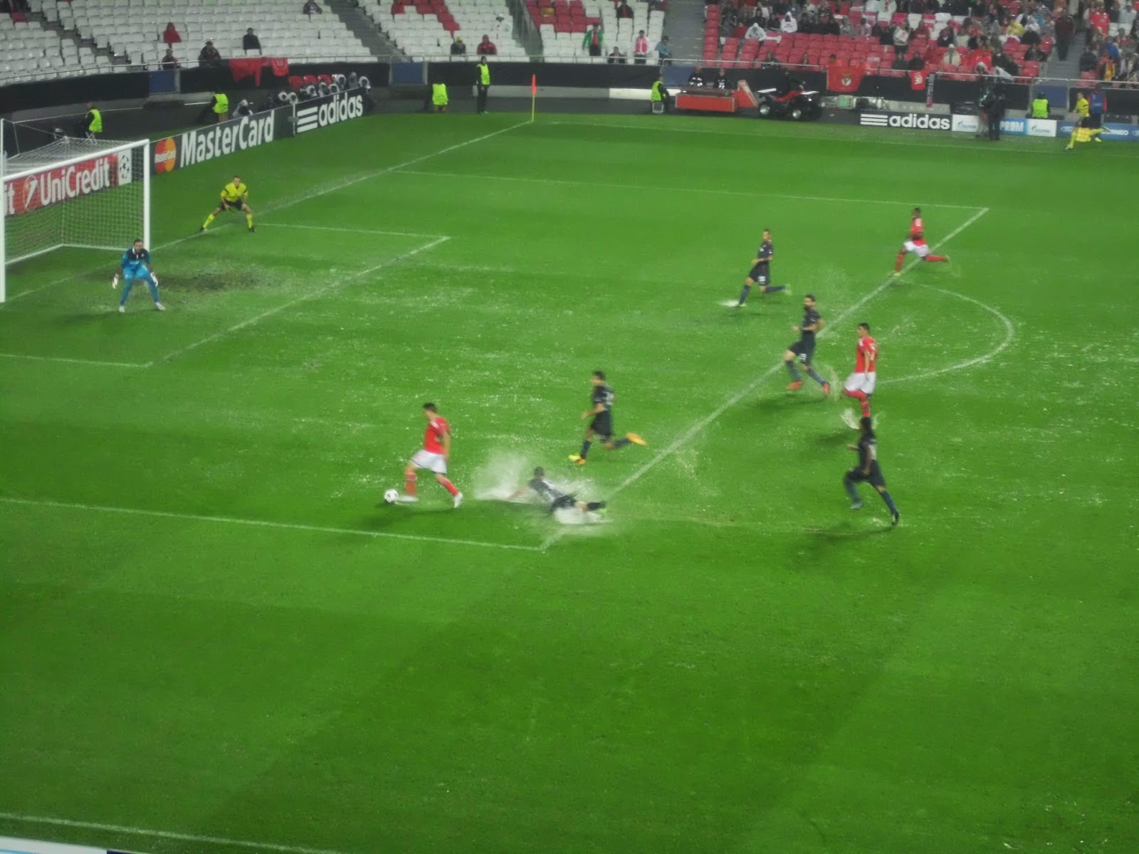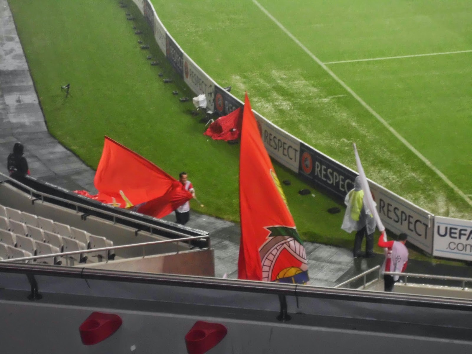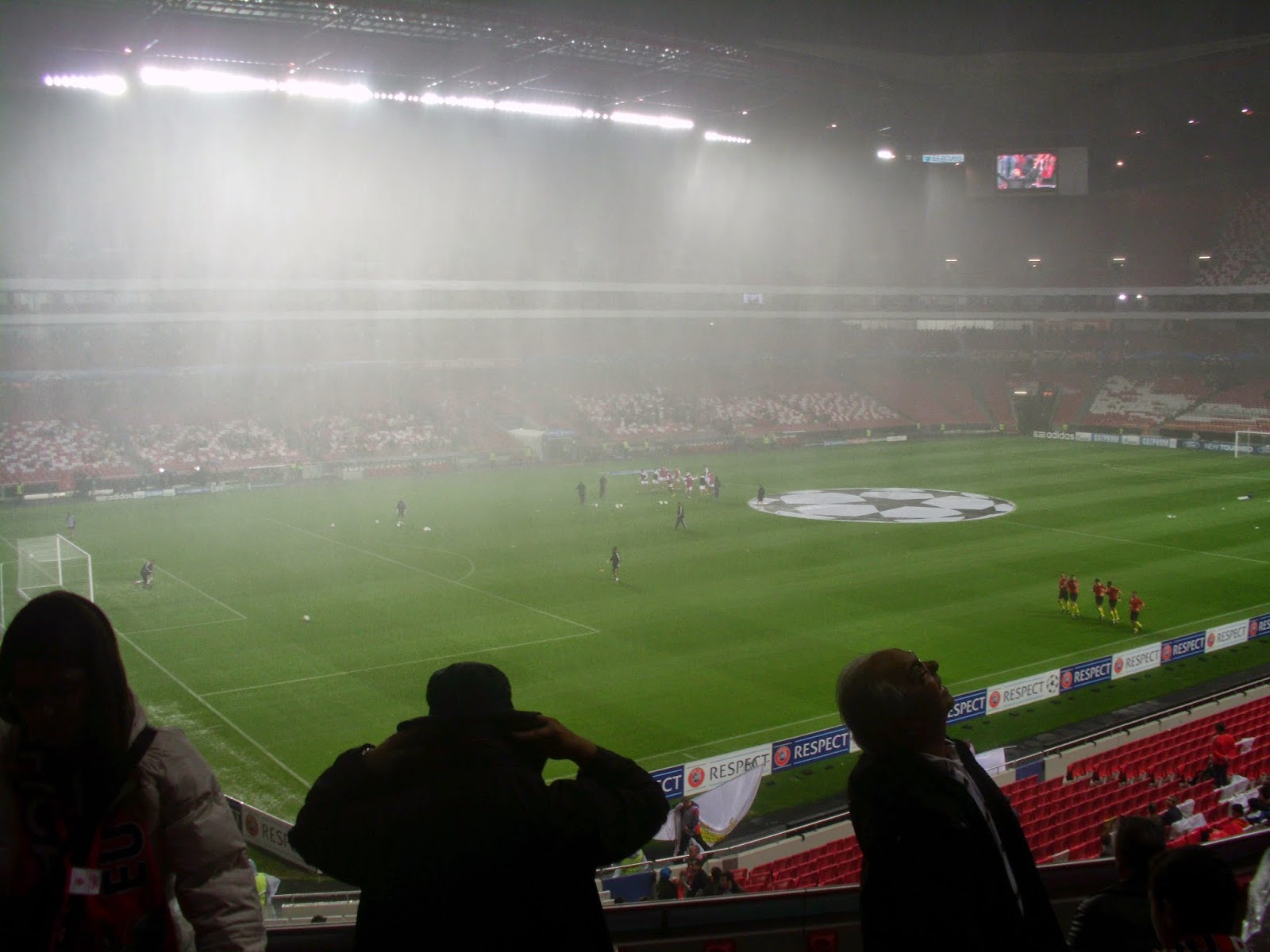 Vor dem Spiel zieht der Benfica-Adler seine Kreise durch die Arena, ehe er auf dem Logo des Klubs im Mittelkreis landet (siehe Extra-Foto, leider halt nicht die beste Qualität, aber die vom Flug sind noch schlechter) – schon ein durchaus beeindruckendes Schauspiel. Danach sorgen die Fans, auch hier auf zwei Blöcke aufgeteilt, für gute Stimmung, auch die rund 2.000 mitgereisten Griechen. Nach dem 0:1 zur Pause ist eigentlich wegen des verdammt tiefen Bodens nicht mehr mit einem Treffer zu rechnen, der Ball bleibt immer wieder bei den Angriffen stecken. Als zumindest doch wieder etwas Wasser abgeronnen ist, schießen die Roten allerdings doch noch ein und das Stadion bebt. Leider ist das Stadion nicht ausverkauft (knapp über 38.100 Zuschauer sind da), wär schön, die Stimmung bei voller Hütte mitbekommen zu haben.