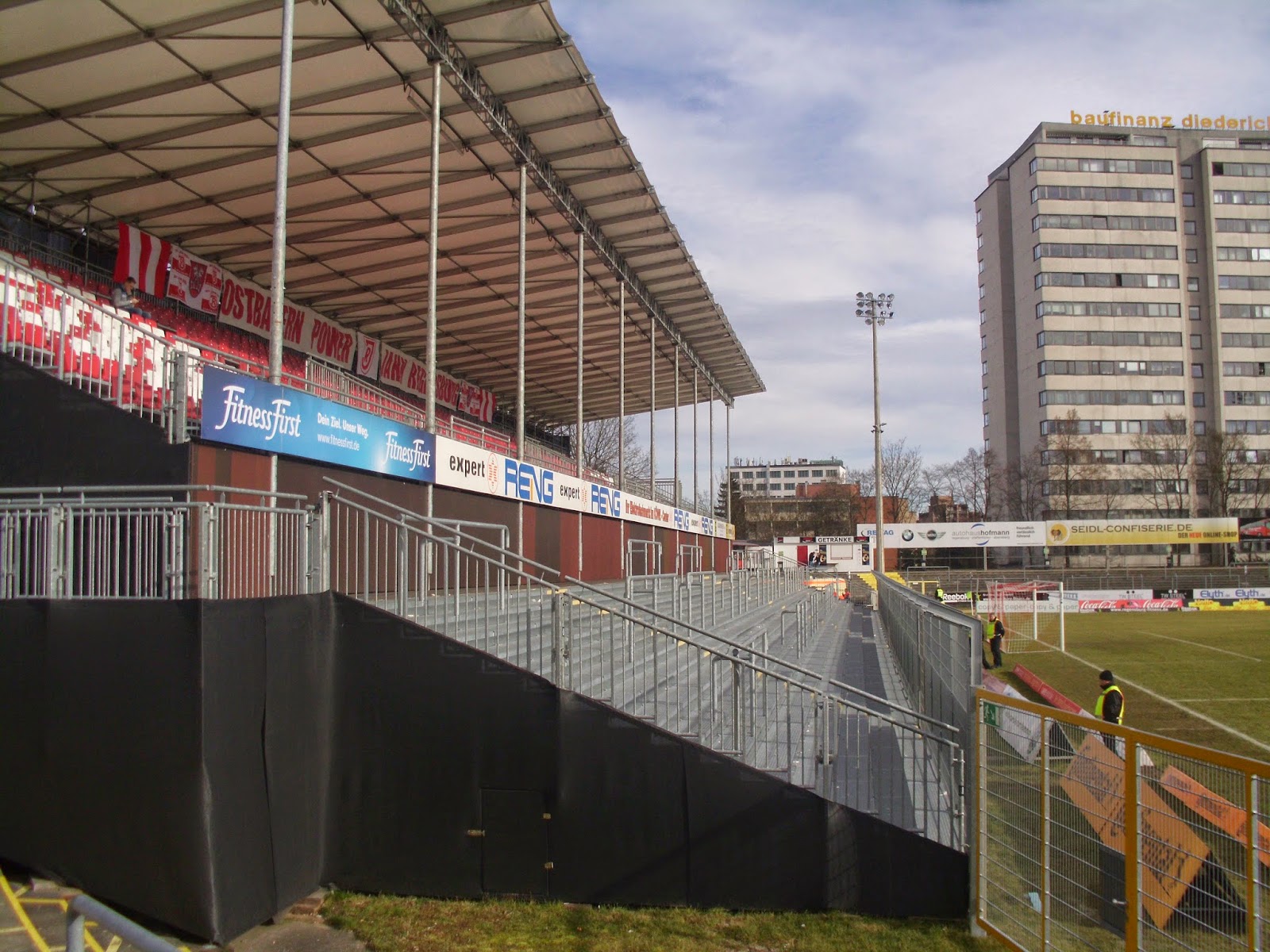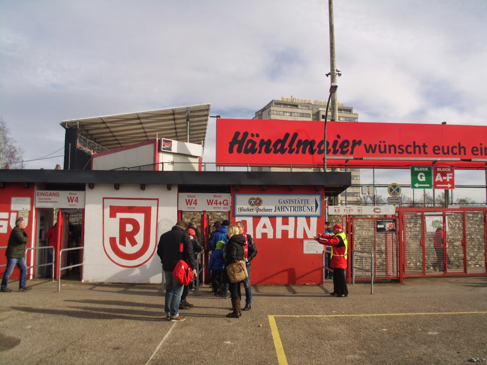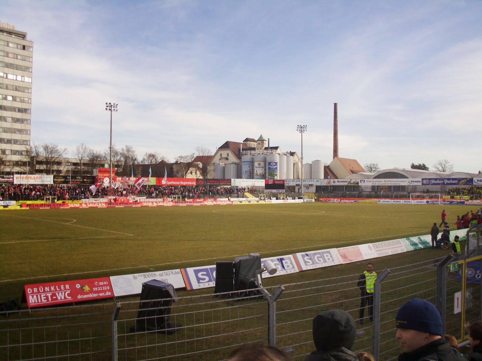 Eineinhalb Jahre bevor das neue Stadion von Jahn eröffnet wird, nütze ich die Chance, das altehrwürdige Jahnstadion zu Regensburg noch zu besichtigen. Die ehemalige Reichstagsstadt wurde im Zweiten Weltkrieg fast nicht beschädigt, daher findet sich in der Altstadt noch viel historische Bausubstanz, inklusive der „Judensau“ am Dom (einem antisemitischen Marker zum ehemaligen jüdischen Ghetto auf einem der Pfeiler).