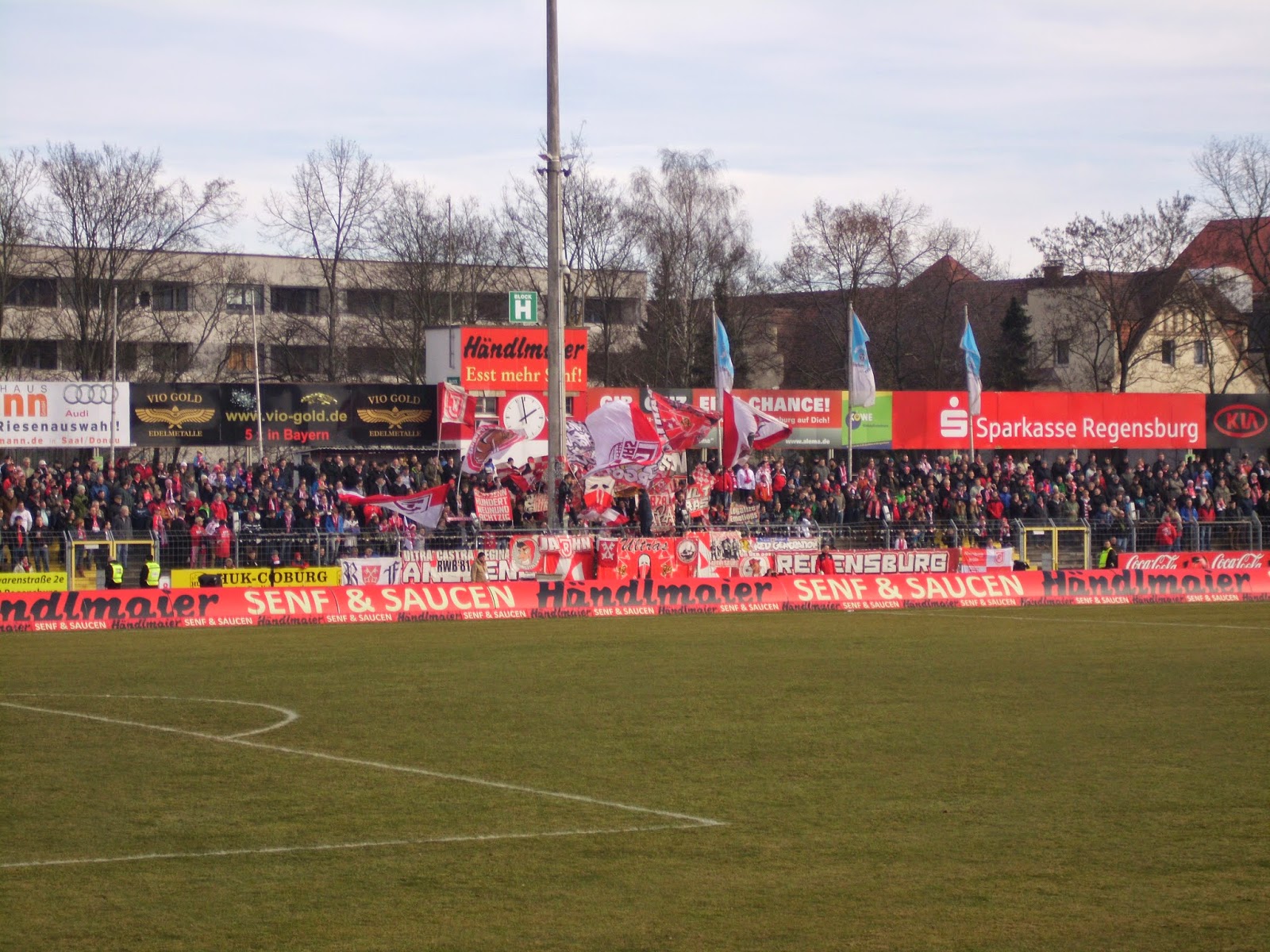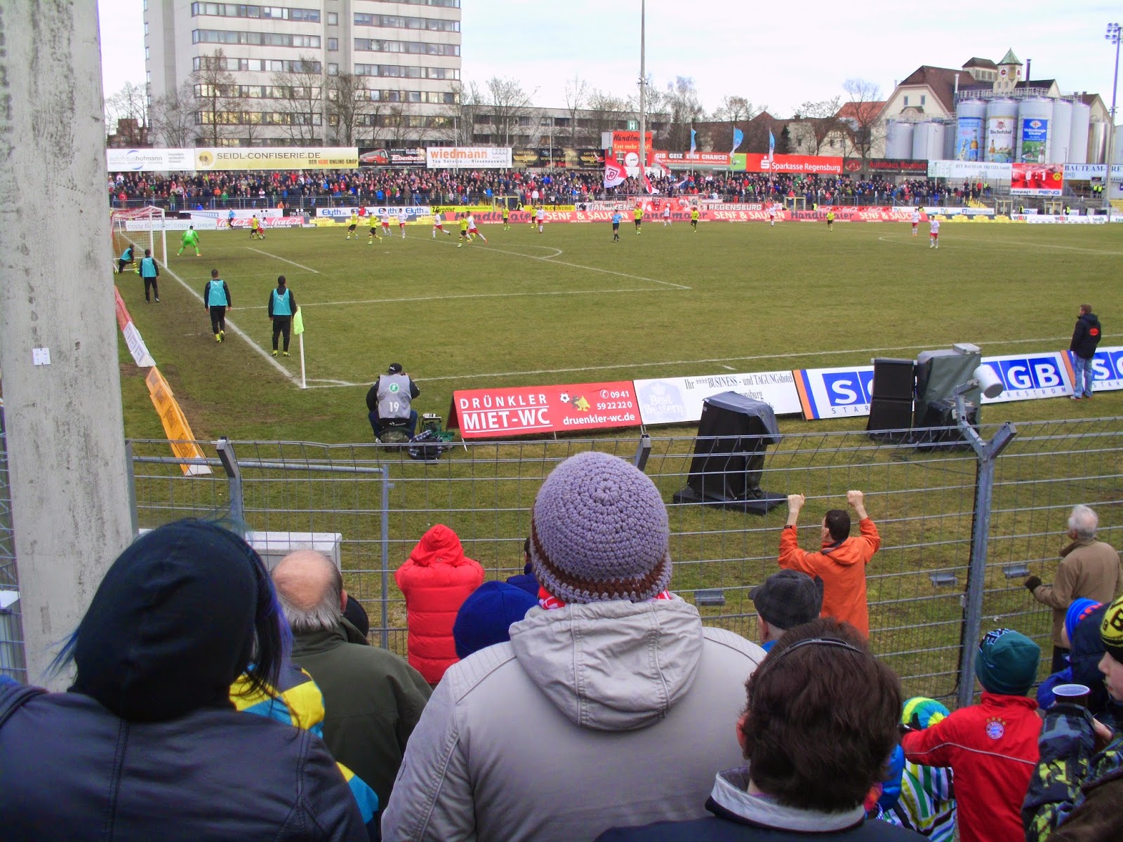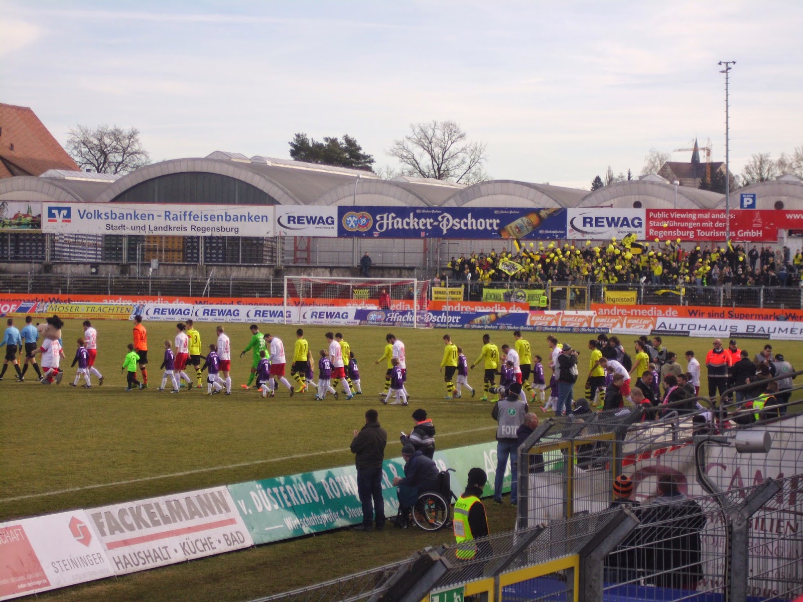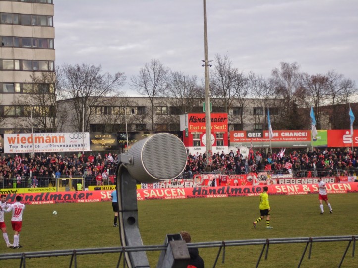 Knapp über 3.600 Zuschauer, davon überraschend viele Borussen (ca. 300, würd ich schätzen – laut den Transparenten vor allem aus Ingolstadt, München (!) und Regensburg selbst), bringen nicht wirklich viel Stimmung, zumindest über die gesamten 90 Minuten gesehen. Die Dortmunder sind zu Beginn („In Europa kennt euch keine Sau“ und klassische BVB-Lieder) und beim 1:0-Führungstor relativ laut, die rund 200 Hardcore-Ultras der Heimmannschaft singen durchaus durch, sind aber an meinem „Verbannungsort“ zumindest nicht mehr eindrucksvoll zu hören.