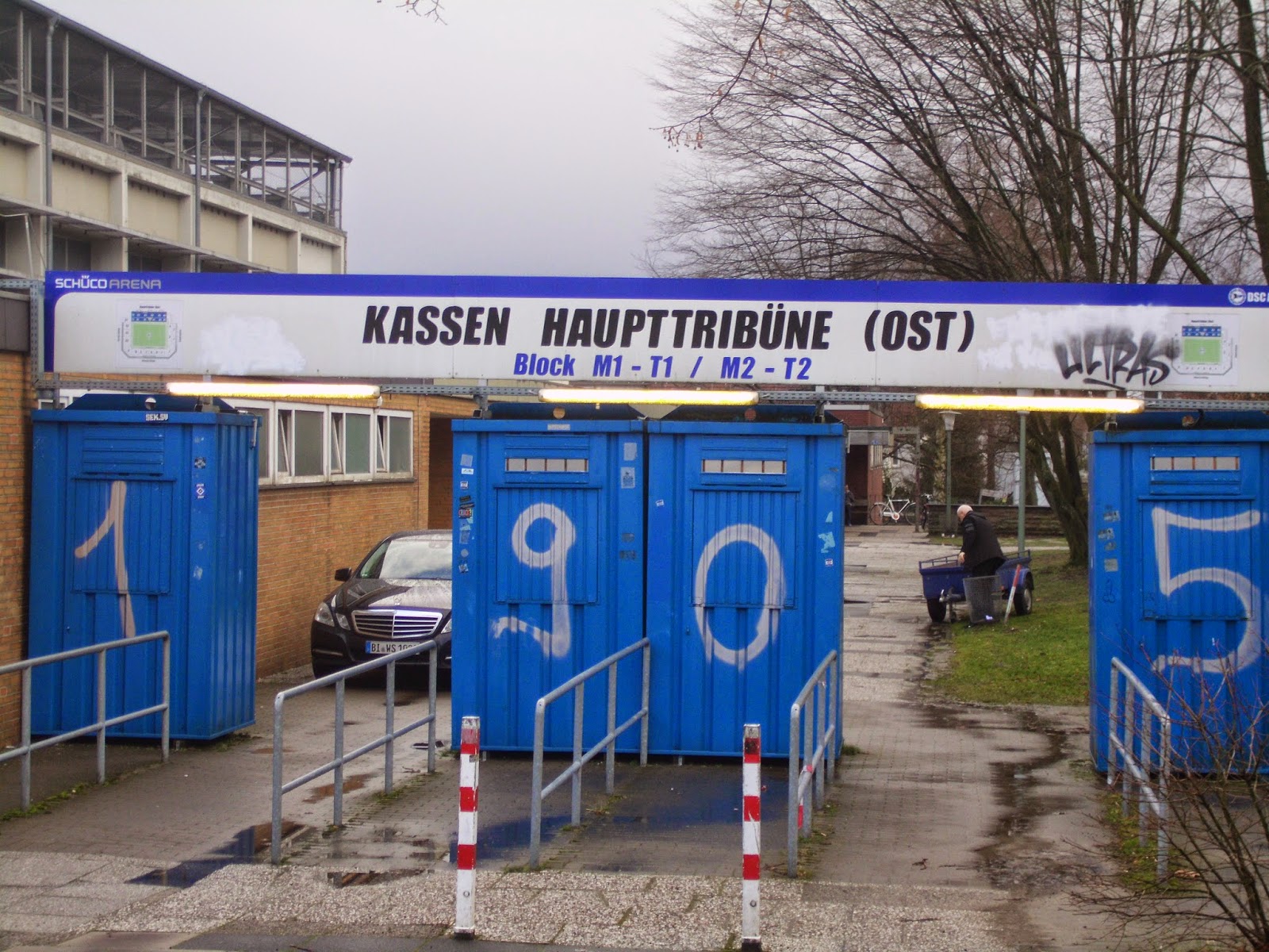 Vor dem Stadion mit seinen noch geschlossenen Kassen mache ich mit einem Phänomen Bekanntschaft, von dem ich schon öfter gelesen habe, mit dem ich aber noch nie wirklich in Berührung gekommen bin: den Sammlern von Pfandflaschen (und -dosen). Dutzende wetteifern vor dem Eingang um die leeren Getränkebehälter der eintreffenden Fans. Mit einem von ihnen komme ich ins Gespräch, er ist extra aus Hannover (ca. 170 km entfernt) angereist und behauptet, an guten Tagen bis zu 200 Euro mit dieser Arbeit machen zu können.