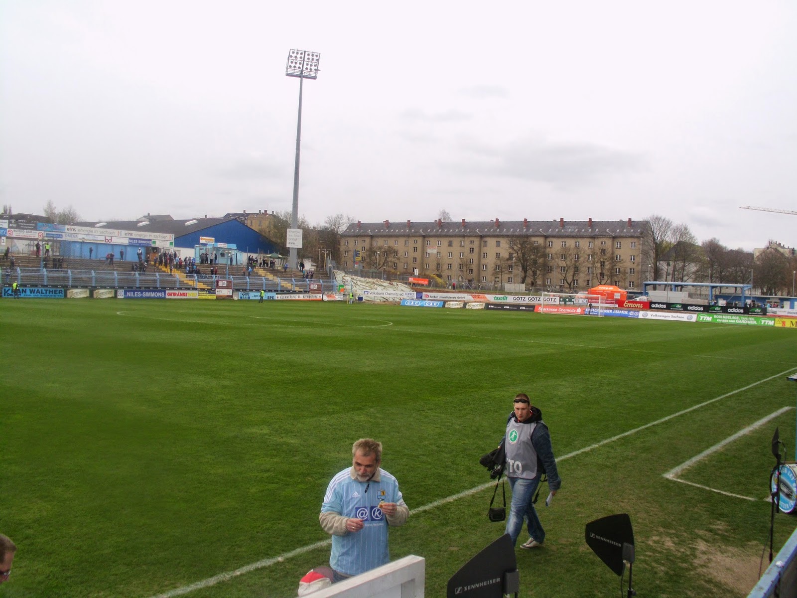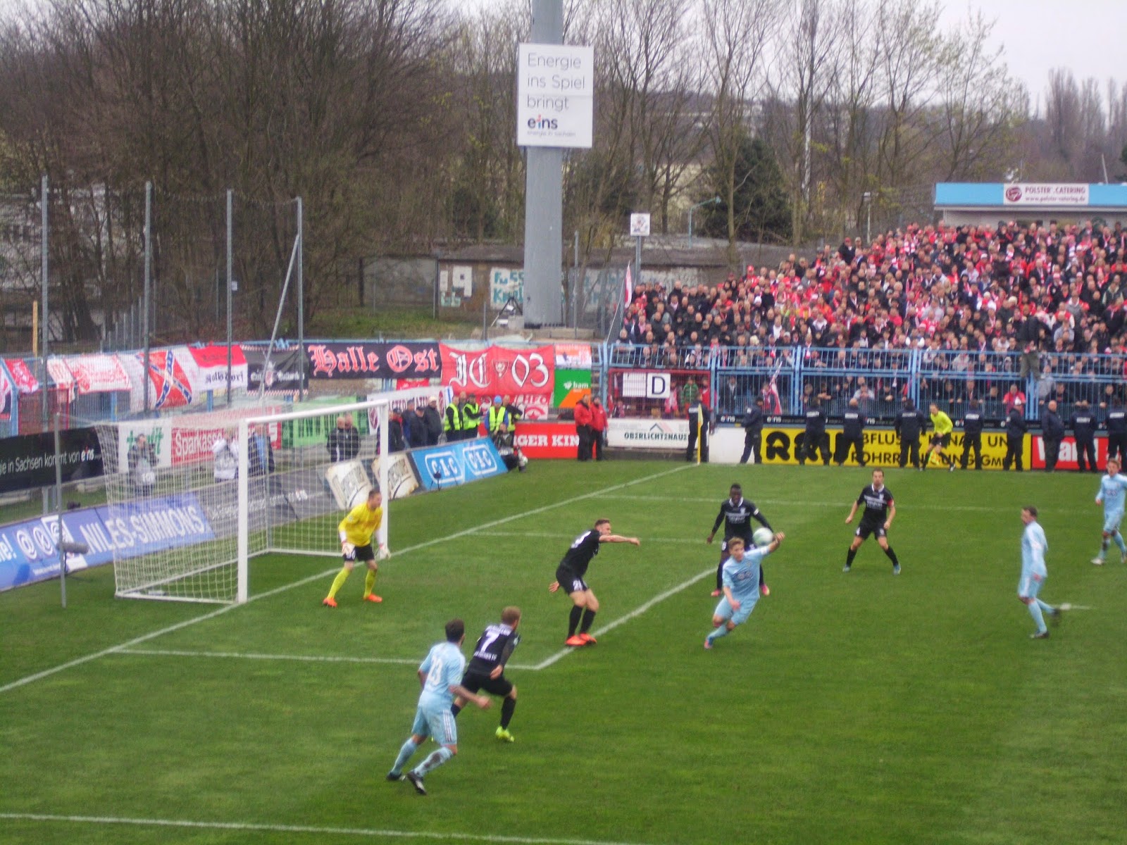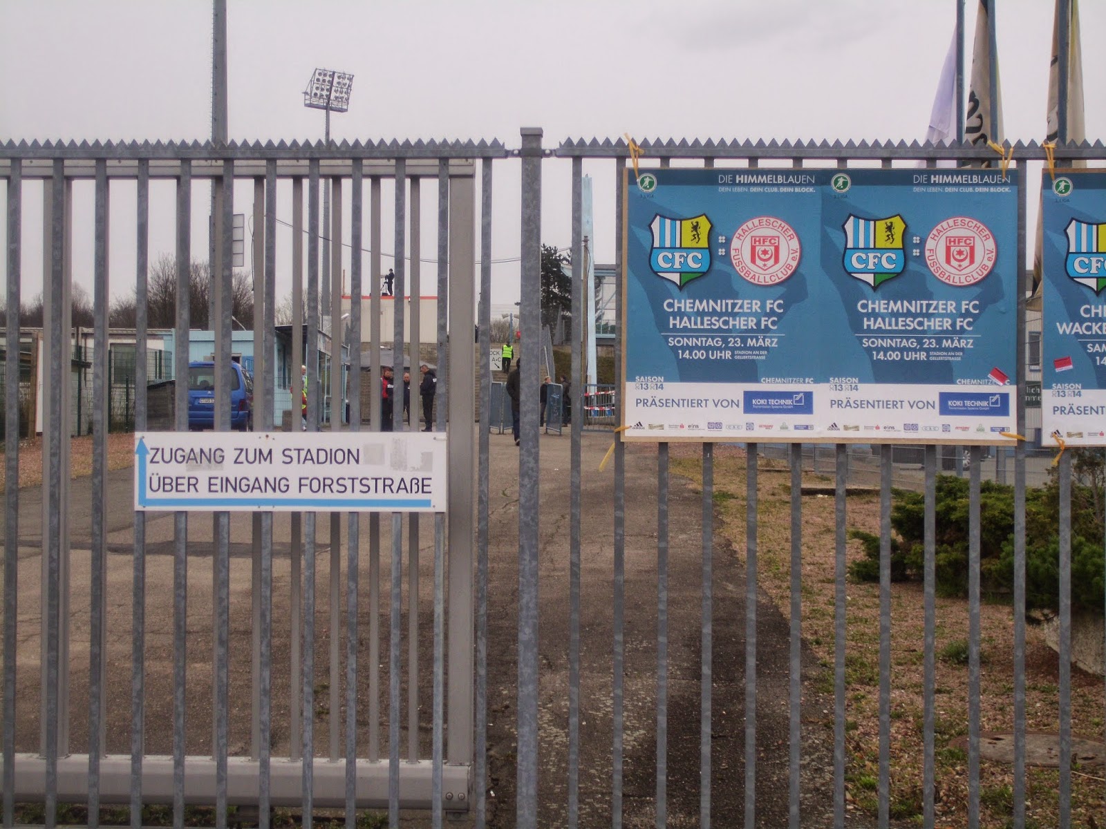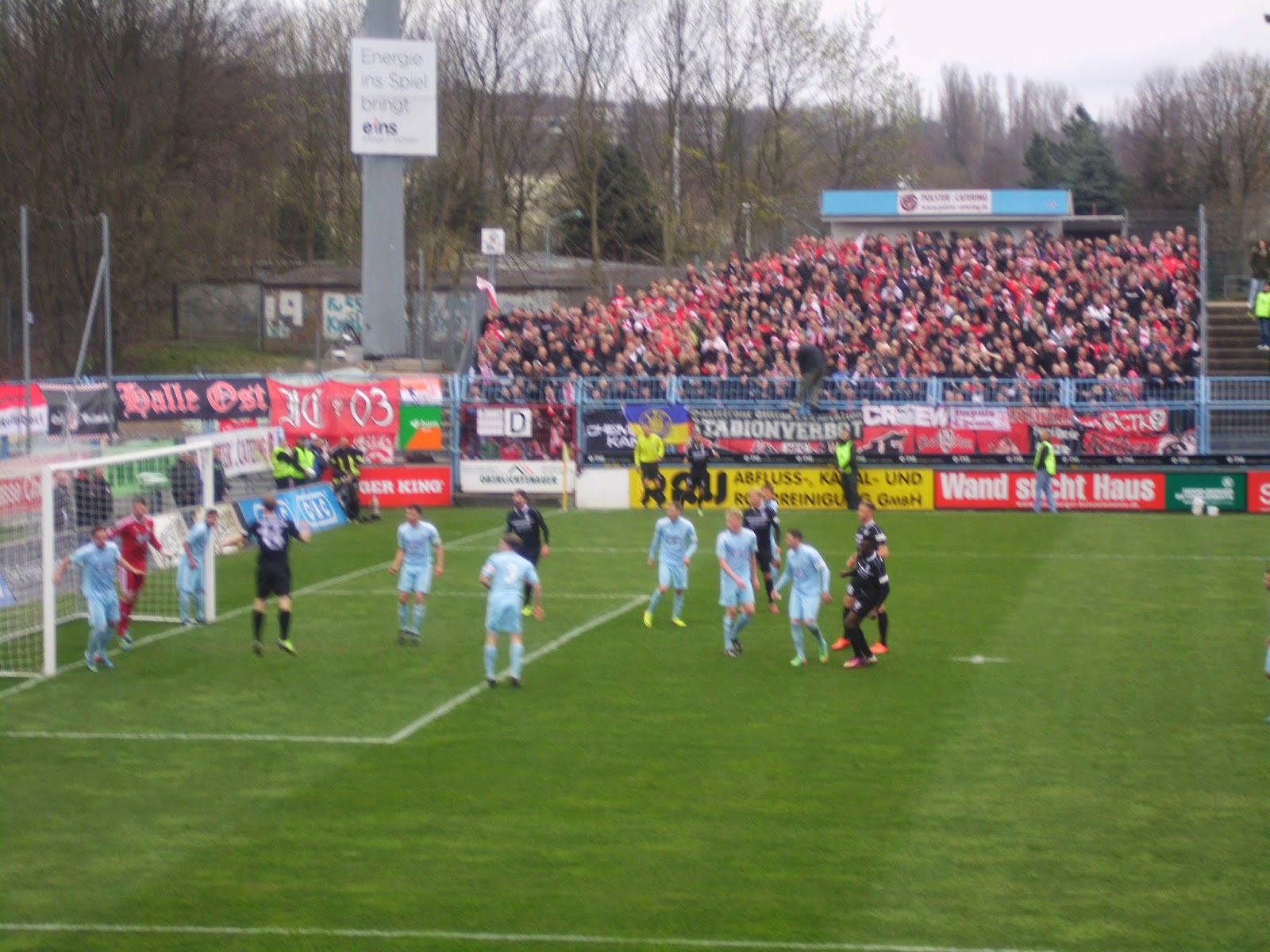 Das Stadion an der Gellertstraße befindet sich nur knapp einen Kilometer Fußweg vom Bahnhof entfernt und ist gerade in vollem Unbau befindlich. Die beiden Kurven wurden bereits weggerissen, bis 2015 soll hier eine moderne Arena für 15.000 Zuschauer entstehen. 6.085 Anhänger füllen heute das Rest-Stadion ganz ordentlich, die 600 Karten für den HFC waren laut Stadionsprecher binnen 20 Minuten ausverkauft. Auch deswegen nehmen auf der Haupttribüne zum nicht unstolzen Preis von 21 Euro viele Hallesche Platz.
