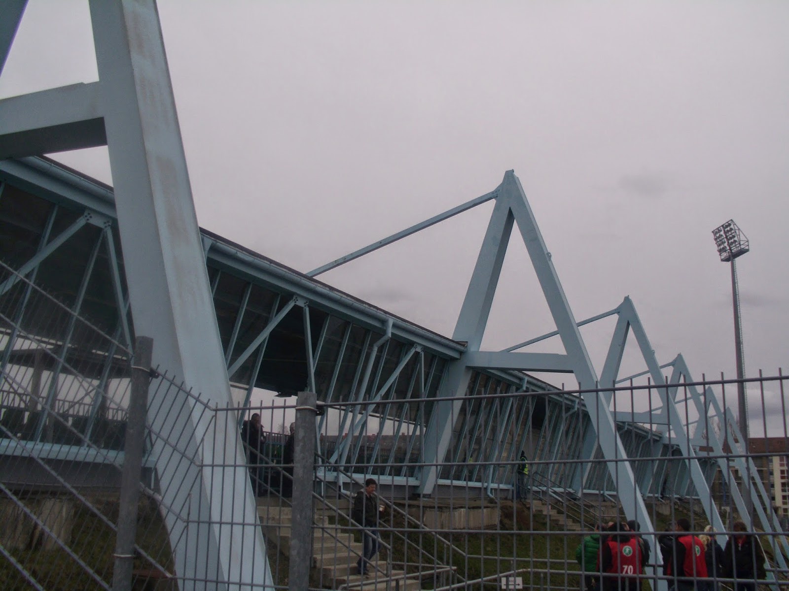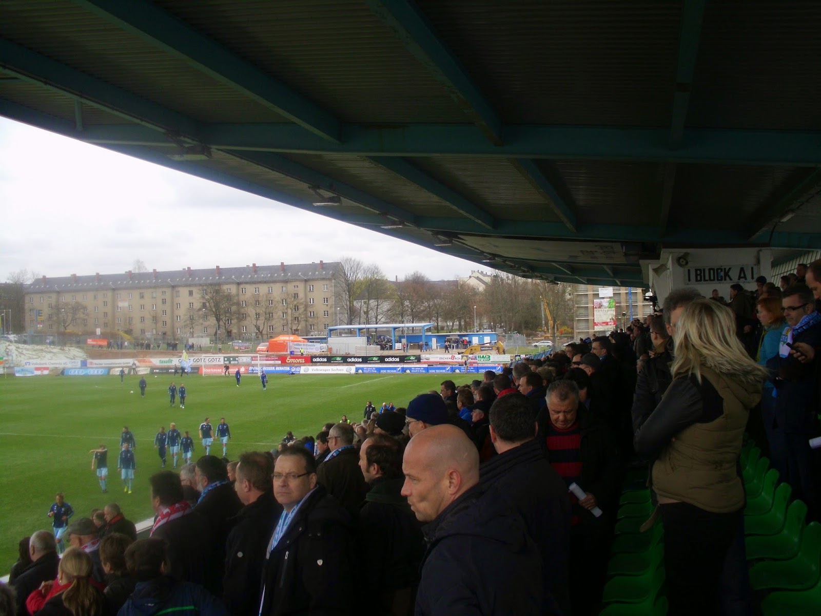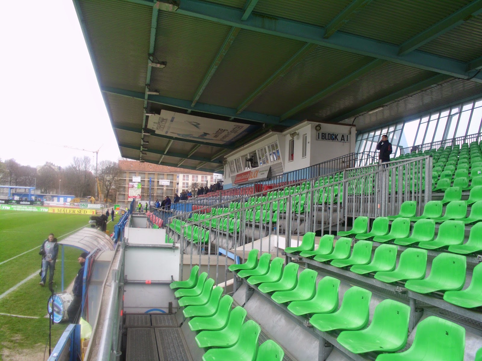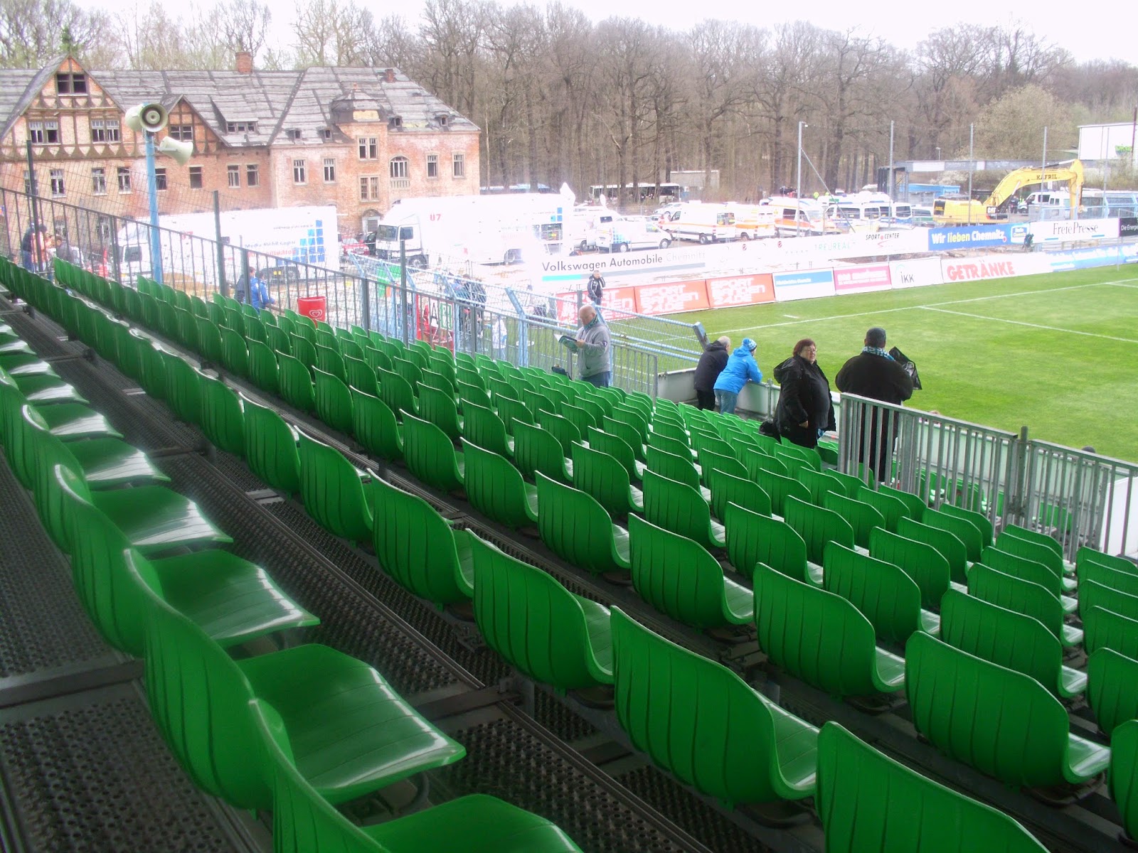 Das Stadion an der Gellertstraße befindet sich nur knapp einen Kilometer Fußweg vom Bahnhof entfernt und ist gerade in vollem Unbau befindlich. Die beiden Kurven wurden bereits weggerissen, bis 2015 soll hier eine moderne Arena für 15.000 Zuschauer entstehen. 6.085 Anhänger füllen heute das Rest-Stadion ganz ordentlich, die 600 Karten für den HFC waren laut Stadionsprecher binnen 20 Minuten ausverkauft. Auch deswegen nehmen auf der Haupttribüne zum nicht unstolzen Preis von 21 Euro viele Hallesche Platz.