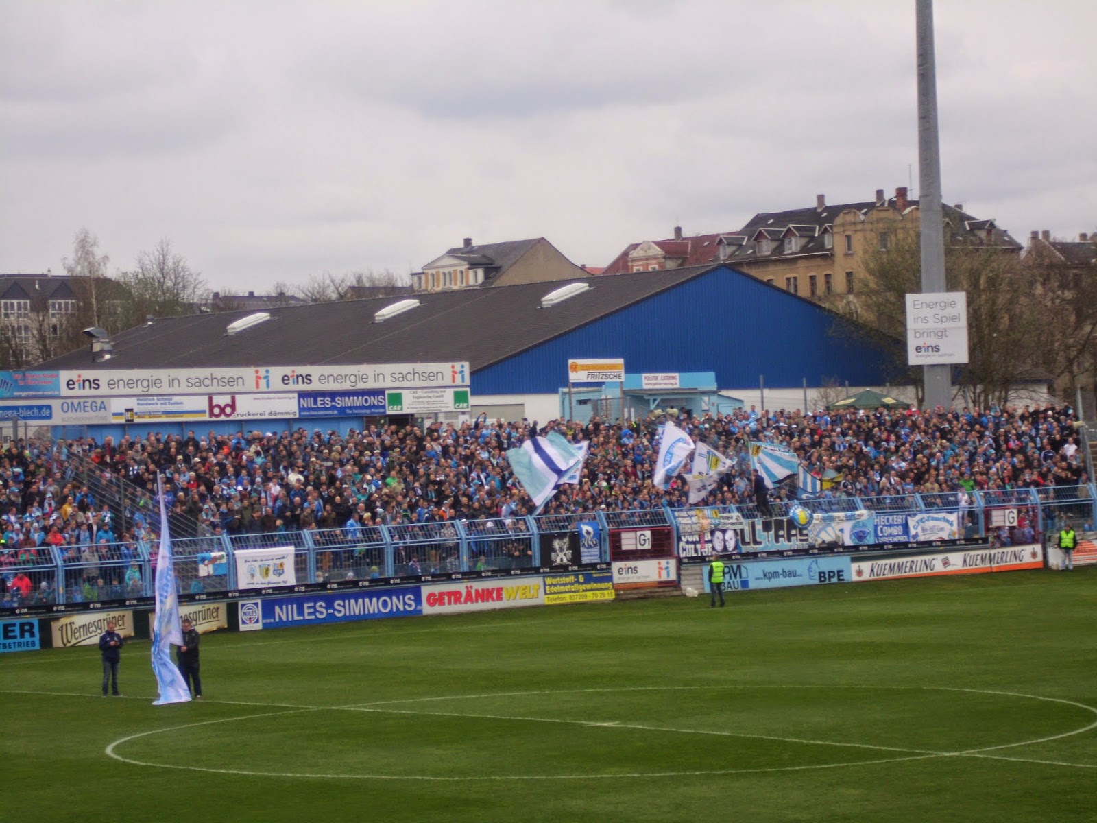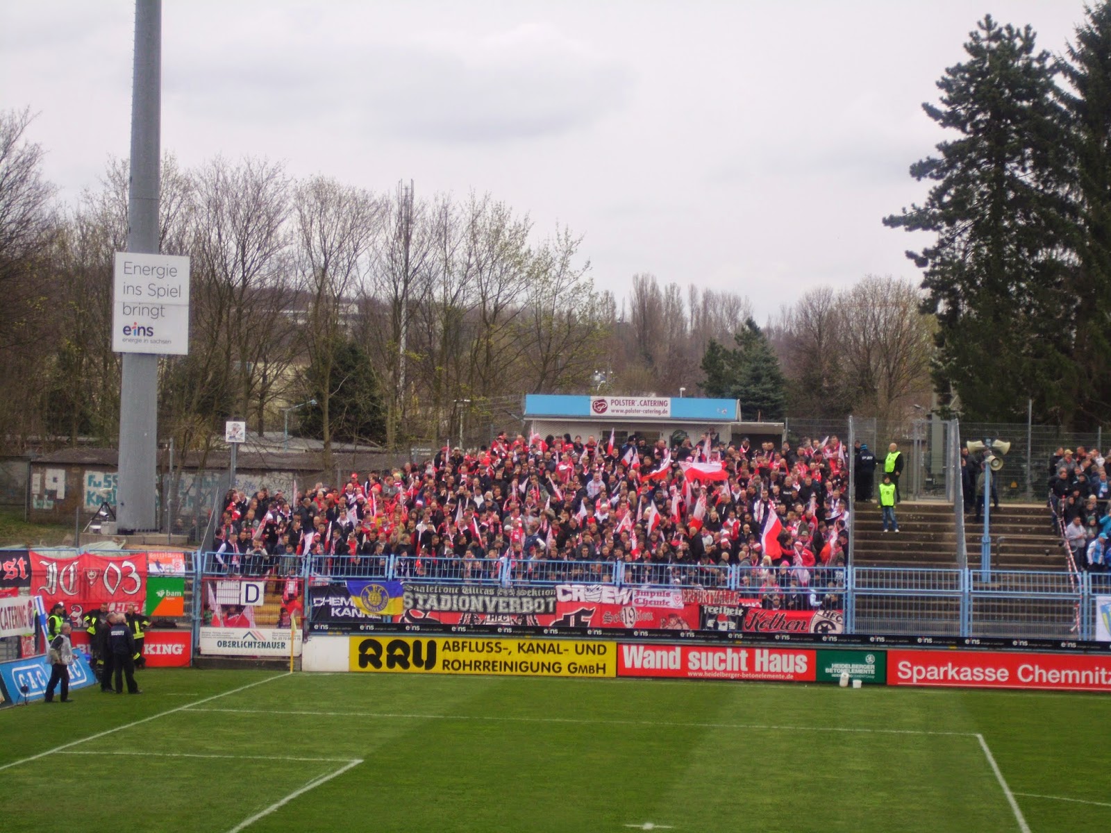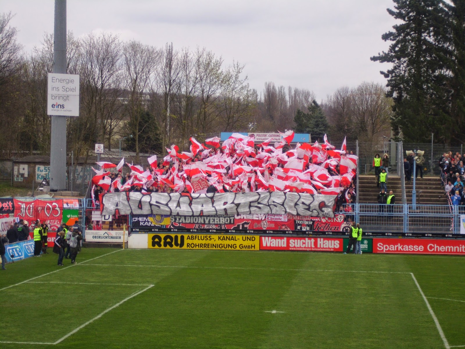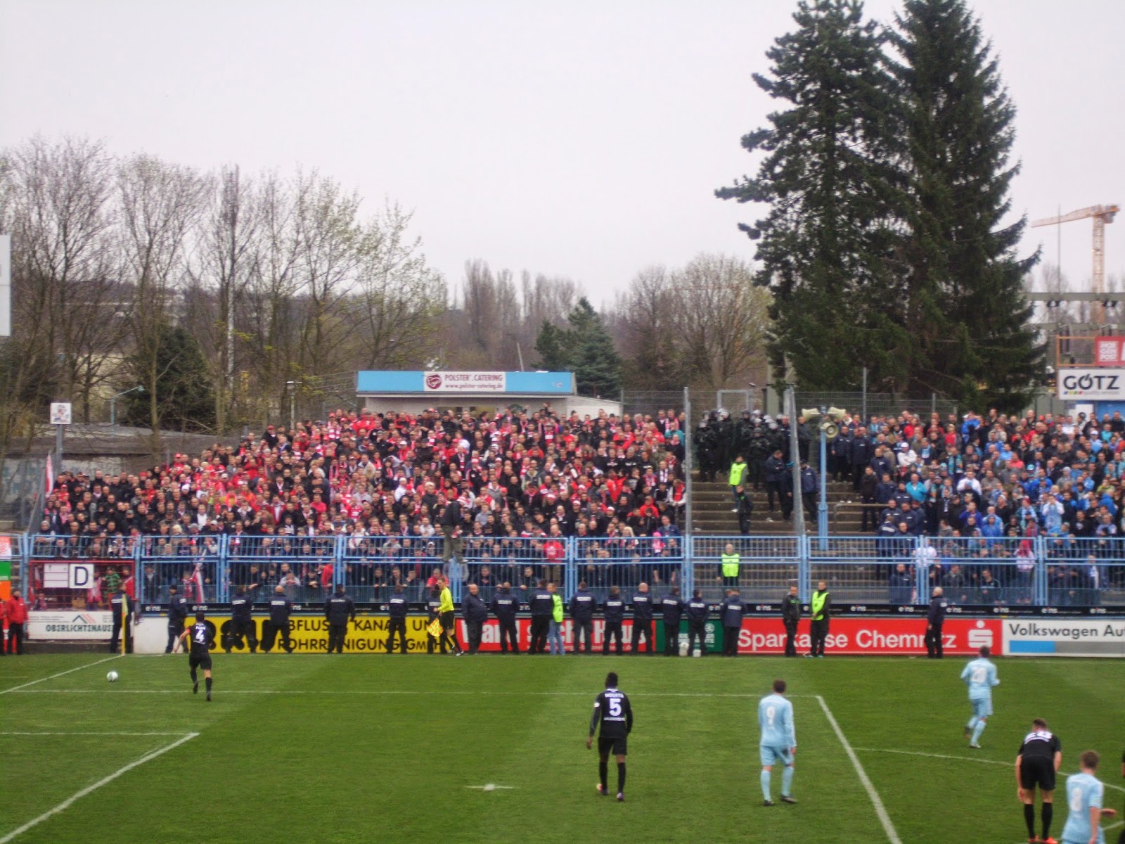 Die Spielkultur ist hier nicht unbedingt auf höchstem Niveau, der Hass dafür umso mehr. Zu Beginn der zweiten Halbzeit fliegen Rauchbomben aus dem Gästesektor in die Fanzone der Himmelblauen, der versuchte Sektorsturm gelingt aber nicht. Nach Spielende „revanchieren“ sich dafür die Chemnitzfans und versuchen über den Rasen zu den Gästefans zu gelangen, auch sie werden aber rasch von der Polizei zurückgedrängt. Bereits kurz nach dem 1:0 für die Gastgeber sieht es nach dem für dieses Wochenende so typischen 1:1 aus, der Treffer wird aber aberkannt. Erst kurz vor Ende der, durch die Unterbrechungen enorm ausgeweiteten, Nachspielzeit fällt der Ausgleich unter dem lautstarken Jubel der Rot-Weißen – offiziell in der 99. Spielminute (!!).
