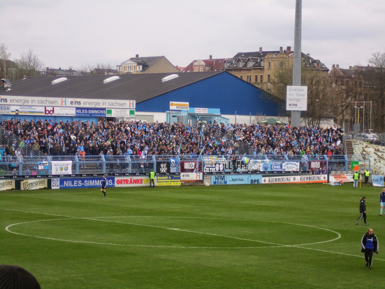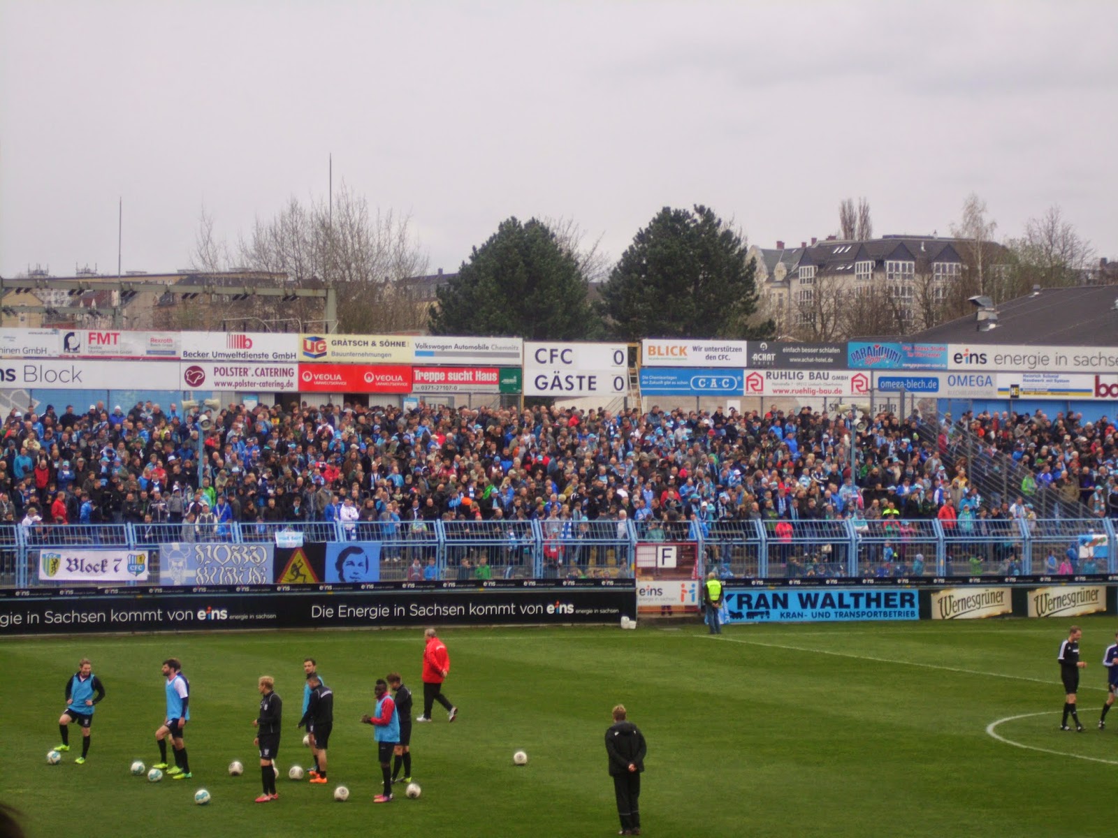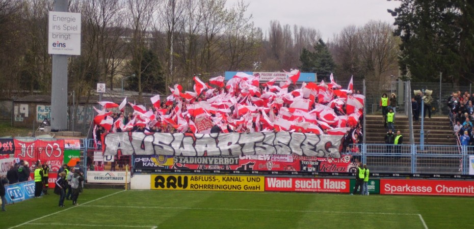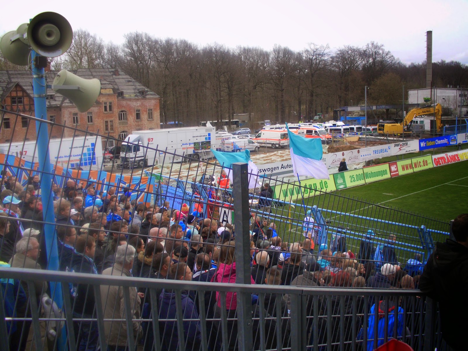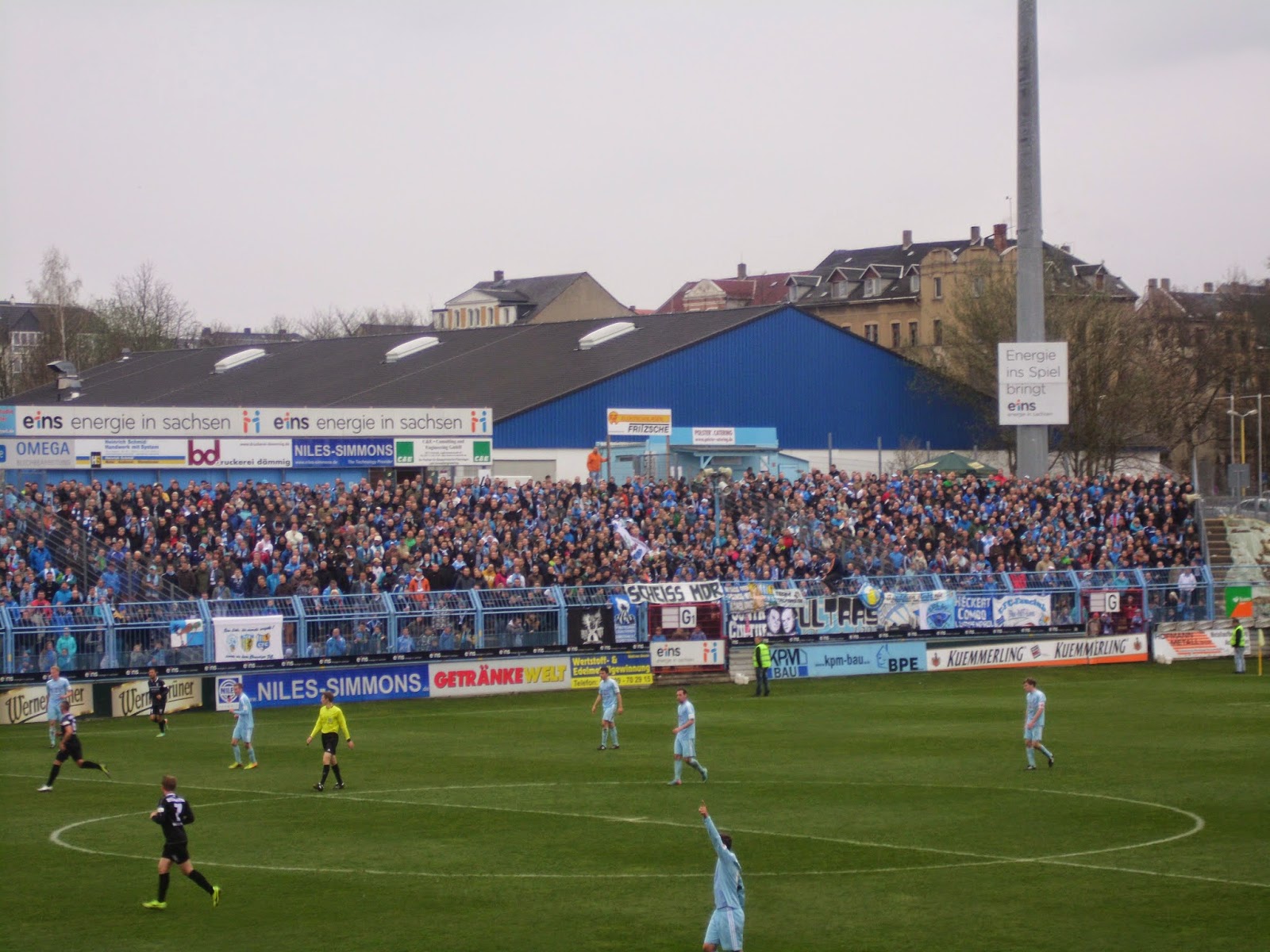 Die Spielkultur ist hier nicht unbedingt auf höchstem Niveau, der Hass dafür umso mehr. Zu Beginn der zweiten Halbzeit fliegen Rauchbomben aus dem Gästesektor in die Fanzone der Himmelblauen, der versuchte Sektorsturm gelingt aber nicht. Nach Spielende „revanchieren“ sich dafür die Chemnitzfans und versuchen über den Rasen zu den Gästefans zu gelangen, auch sie werden aber rasch von der Polizei zurückgedrängt. Bereits kurz nach dem 1:0 für die Gastgeber sieht es nach dem für dieses Wochenende so typischen 1:1 aus, der Treffer wird aber aberkannt. Erst kurz vor Ende der, durch die Unterbrechungen enorm ausgeweiteten, Nachspielzeit fällt der Ausgleich unter dem lautstarken Jubel der Rot-Weißen – offiziell in der 99. Spielminute (!!).