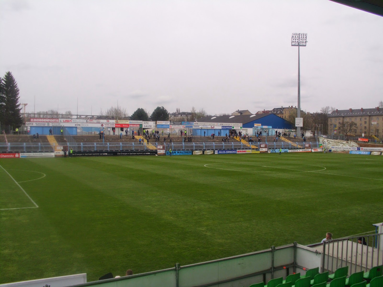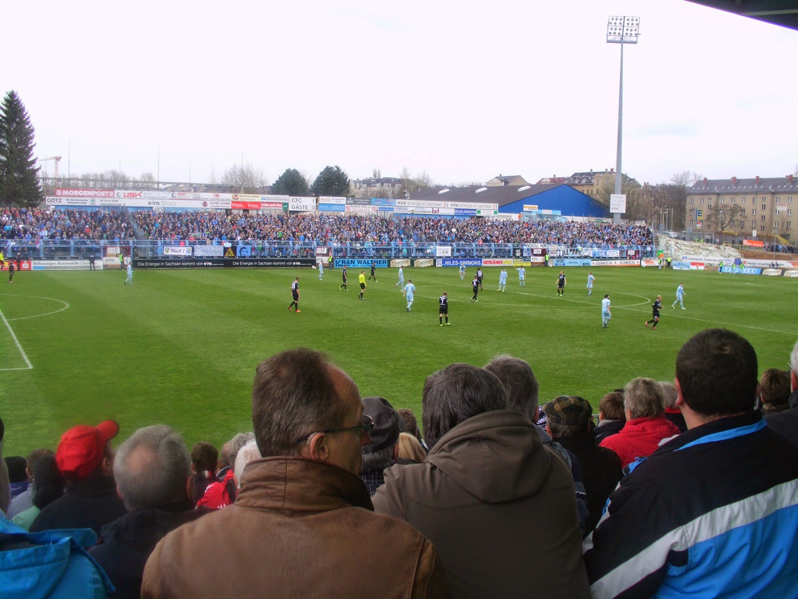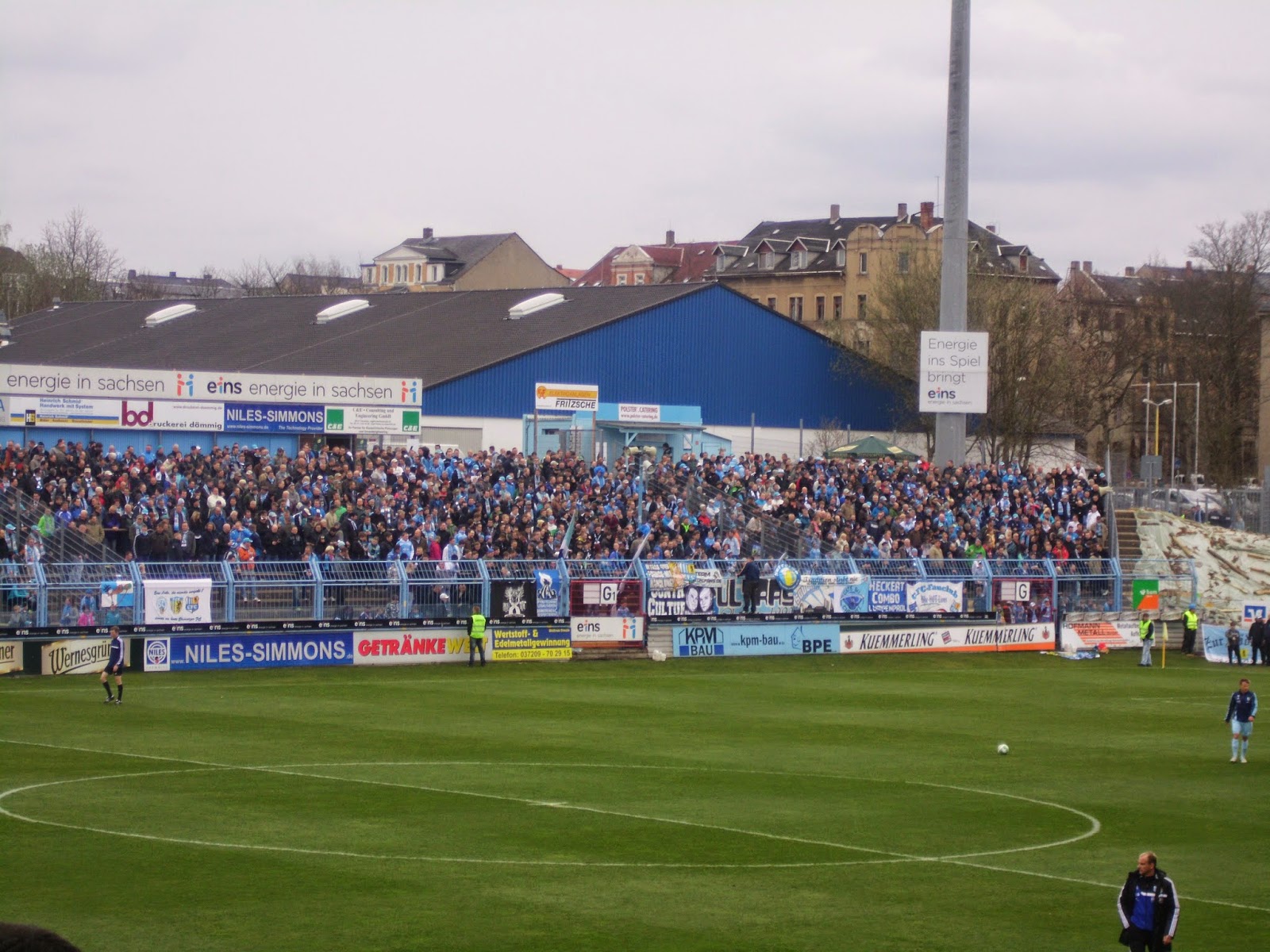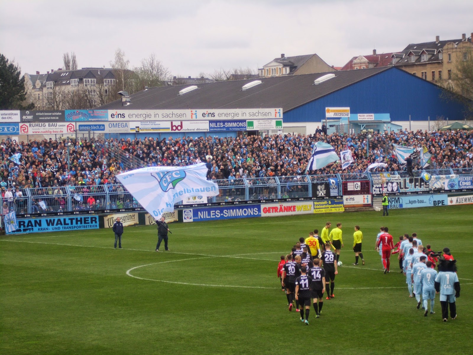 Die Spielkultur ist hier nicht unbedingt auf höchstem Niveau, der Hass dafür umso mehr. Zu Beginn der zweiten Halbzeit fliegen Rauchbomben aus dem Gästesektor in die Fanzone der Himmelblauen, der versuchte Sektorsturm gelingt aber nicht. Nach Spielende „revanchieren“ sich dafür die Chemnitzfans und versuchen über den Rasen zu den Gästefans zu gelangen, auch sie werden aber rasch von der Polizei zurückgedrängt. Bereits kurz nach dem 1:0 für die Gastgeber sieht es nach dem für dieses Wochenende so typischen 1:1 aus, der Treffer wird aber aberkannt. Erst kurz vor Ende der, durch die Unterbrechungen enorm ausgeweiteten, Nachspielzeit fällt der Ausgleich unter dem lautstarken Jubel der Rot-Weißen – offiziell in der 99. Spielminute (!!).