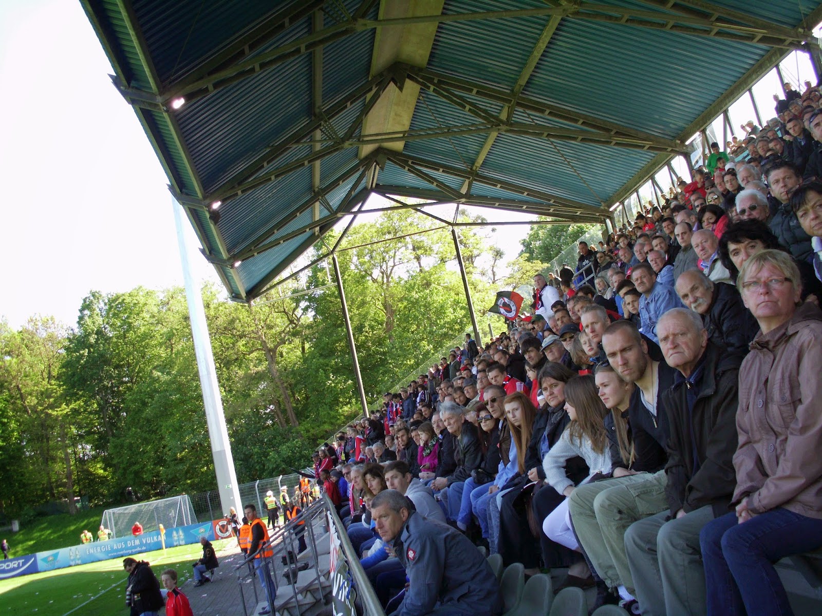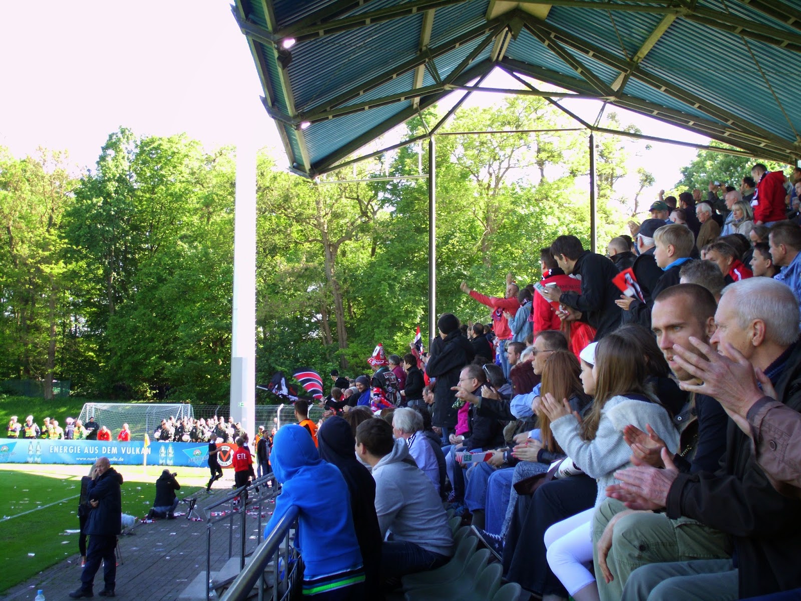 Rund um das Stadion herrscht prächtige, entspannte Stimmung, auch Dutzende, bereits in der Stadt angekommene Pauli-Fans nutzen das samstägliche Vorspiel, um Fußballluft zu schnuppern. Im Stadion sind laut Durchsagen angeblich nur 3.400 Zuschauer, ganz glauben kann man das aber nicht, denn das 6.200 Fans fassende Stadion ist eigentlich ganz gut gefüllt, vor allem die große Haupttribüne ist so gut wie voll. Stimmungsmässig ist das ganze aber eher lau. Zwar sind die Fortuna-Fans zahlreich und farbenpächtig vertreten und man hört bereits bei der Annäherung an das Stadion ihre Gesänge, während dem Spiel enttäuschen sie aber – bis auf die schöne Fahnenchoreo – eher. Die nur rund eine Handvoll Viktoria-Hardcores stechen sie aber dennoch locker aus.