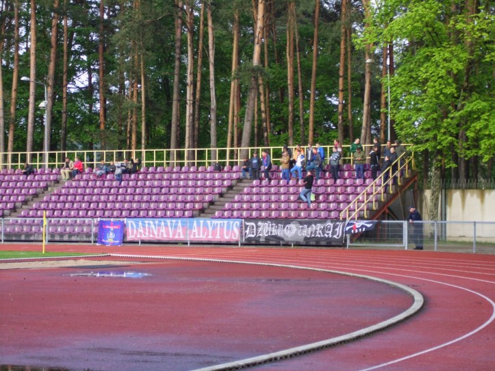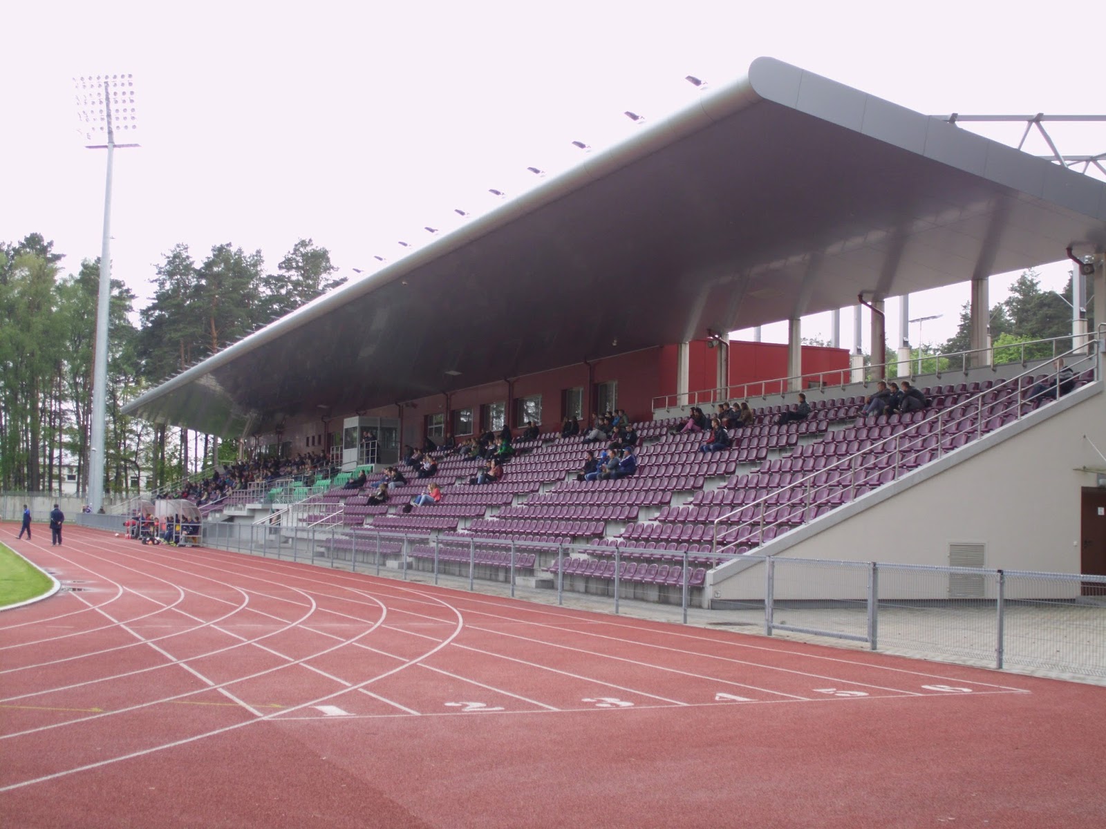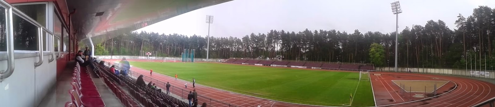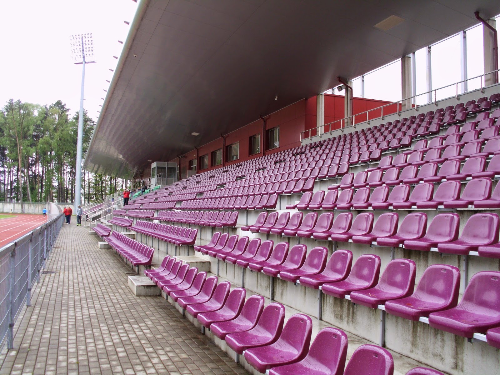 Das städtische Stadion liegt unweit des Zentrums, mitten in einem Park und dürfte ziemlich neu sein. Etwas erstaunt bin ich, weil man für das Spiel offensichtlich keinen Eintritt verlangen will. Auch die Sicherheitsvorkehrungen sind de facto nicht vorhanden, was doch etwas ungewöhnlich für ein Erstligaspiel ist. Die überdachte Haupttribüne ist echt ganz nett, was nicht zuletzt an den violetten Sitzen liegt. Gegenüber befindet sich auch noch eine kleine Gerade, die jedoch ohne Dach auskommen muss. Im Inneren der Haupttribüne sind die blau beleuchteten Männertoiletten das absolute Highlight.