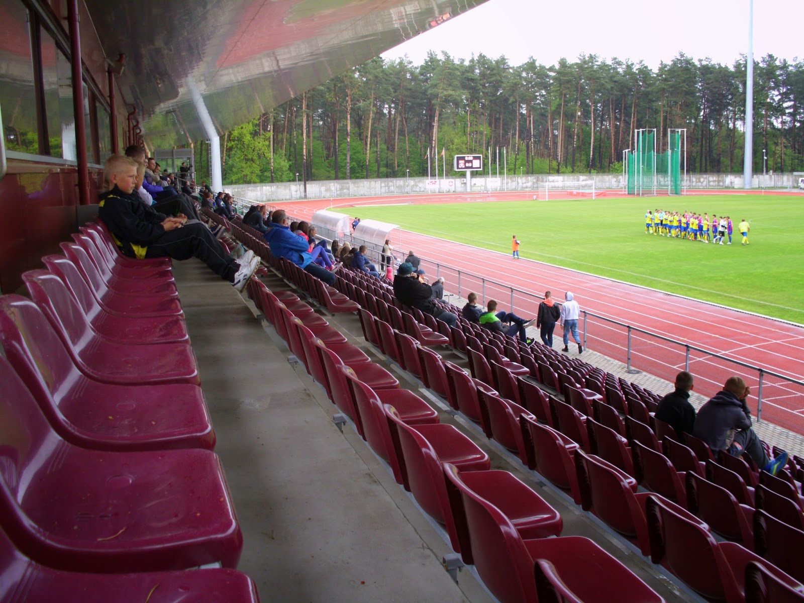 Einige Gästefans fiebern beim Spiel auf der Haupttribüne mit, auf der Gegengeraden gibt es einen, gar nicht so unaktiven, Heimblock. Recht viel mehr als 20 Leut sind das aber nicht. Dennoch singen diese auch beim Stand von 0:5 noch – recht viel anderes bleibt ihnen bei den traurigen Ergebnissen der letzten Zeit ja sowieso nicht übrig…
