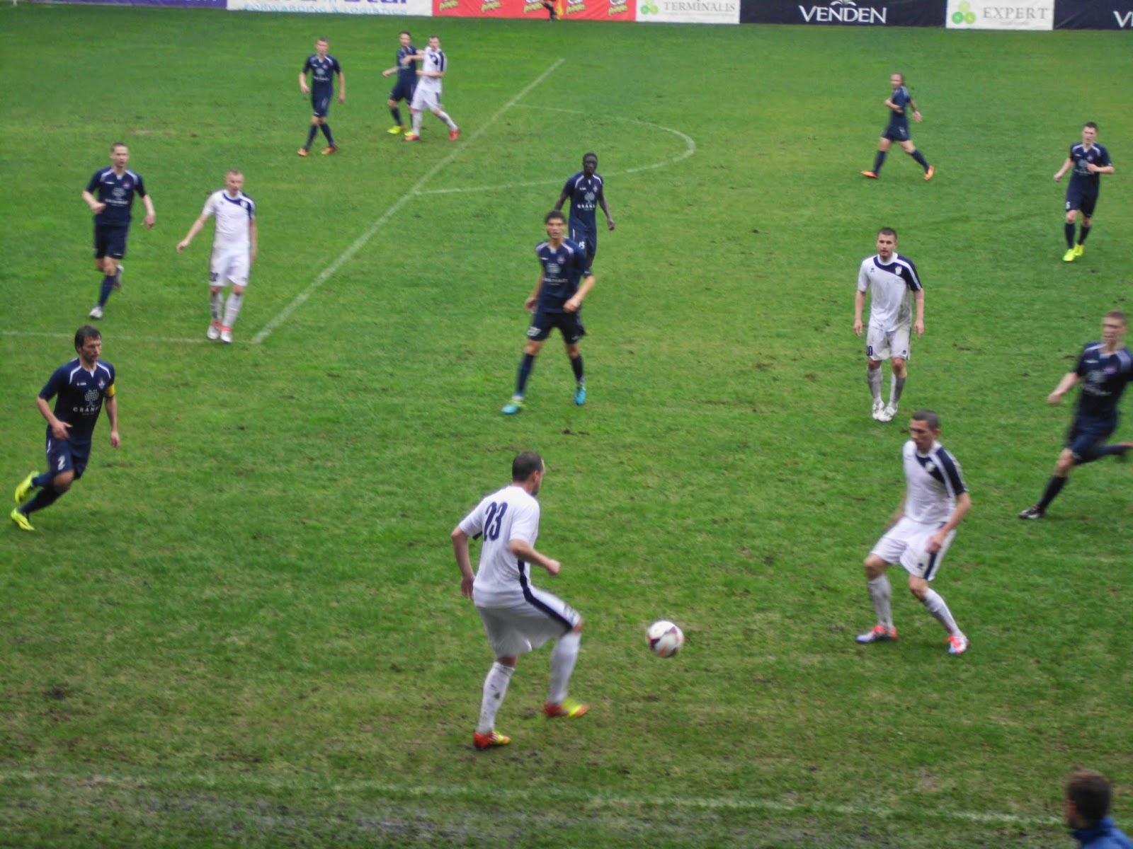 Danach ist das Spiel stimmungsmässig erträglich, das Niveau lässt aber eher zu wünschen übrig – was wohl vielleicht auch am strömenden Regen und am schlechten Zustand des Rasens liegen kann. Skonto geht sehr schnell 2:0 in Führung, die Gäste schaffen noch kurz vor der Pause den Anschlusstreffer. Recht viel mehr gibt es zu dem Spiel dann aber wirklich nicht zu sagen.