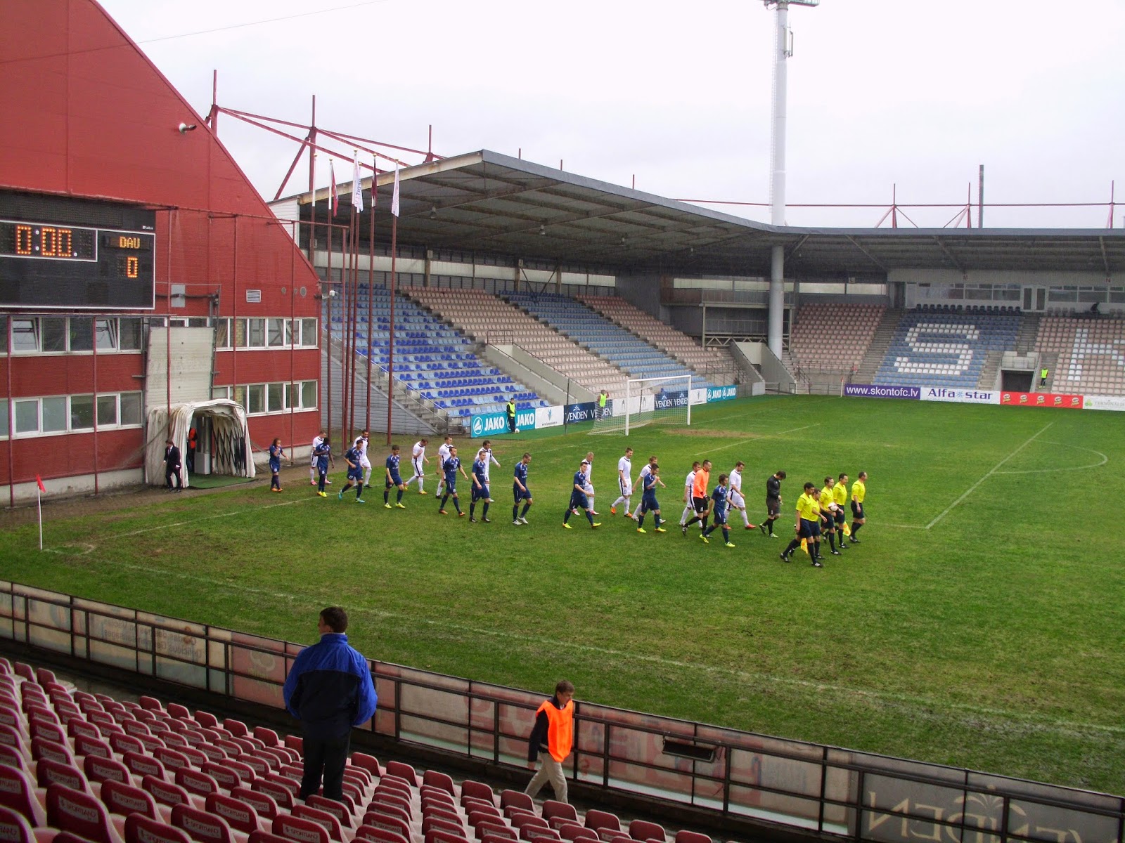 75 Minuten später geht es im Skonto-Stadion mit einem Erstligakick weiter. Das Stadion ist an einer Seite zur Stadt offen, sonst aber echt ganz nett und im britischen Stil errichtet. Ziegelmauern und niedrige, aber relativ steile Tribünen geben dem Ding doch speziellen Charme. Erstaunlich ist, dass das Stadion erst im Jahr 2000 errichtet wurde, dennoch schon sehr große Abnützungserscheinungen zeigt. Die Karte um lediglich 2 Euro bekommt man, nicht gerade leicht erkennbar, aber durch etwas herumfragen herausfindbar, bereits im Bauch des Stadions. Zu meinem großen Glück sind alle Sitzplätze überdacht, denn kurz vor Spielbeginn wird aus dem bis dahin leichtem Schauer ein extremer Sintflutregen.