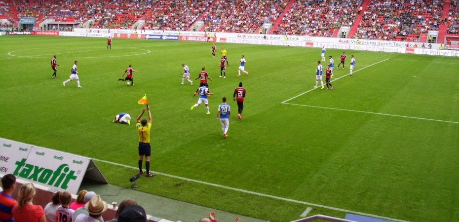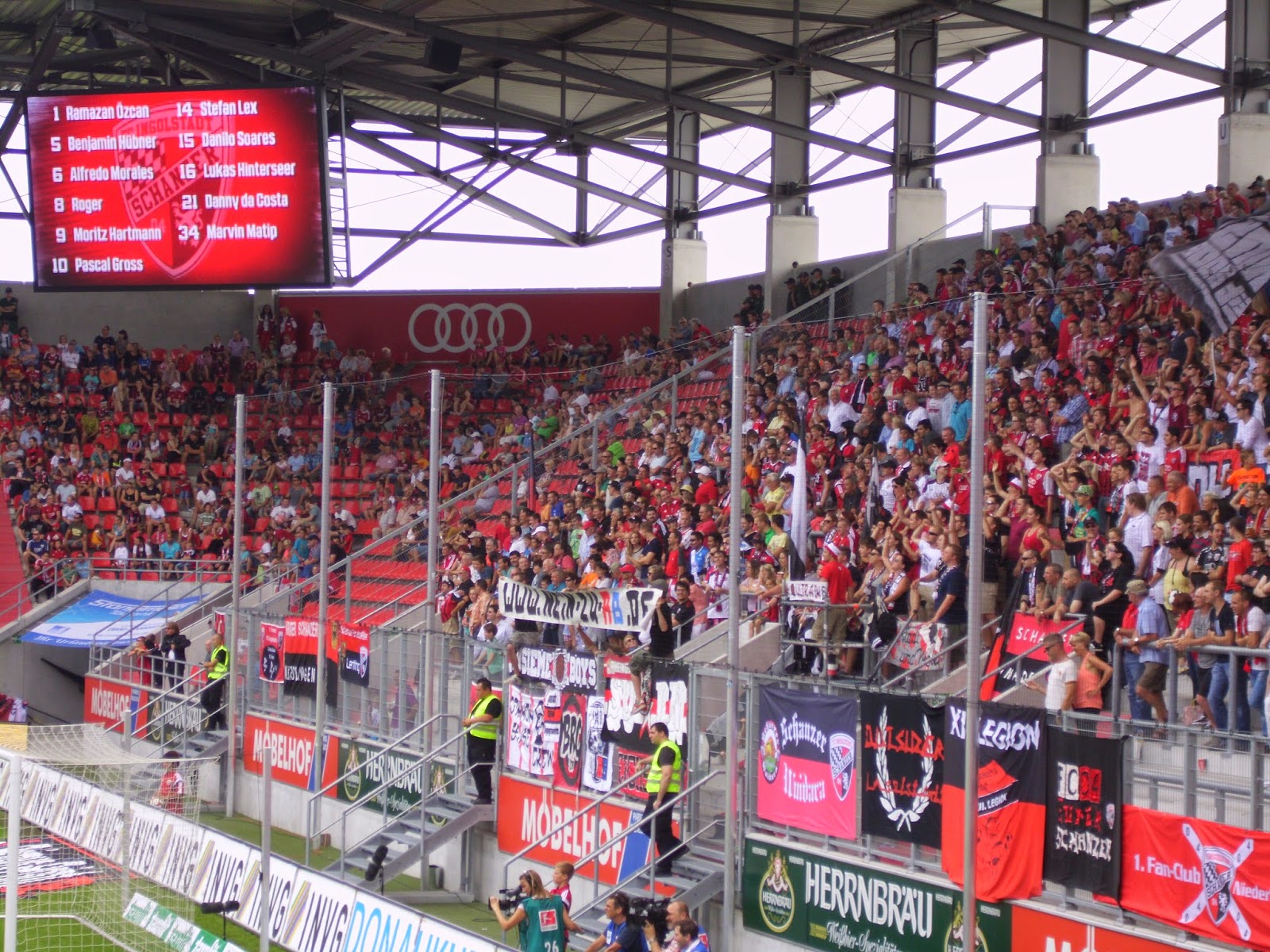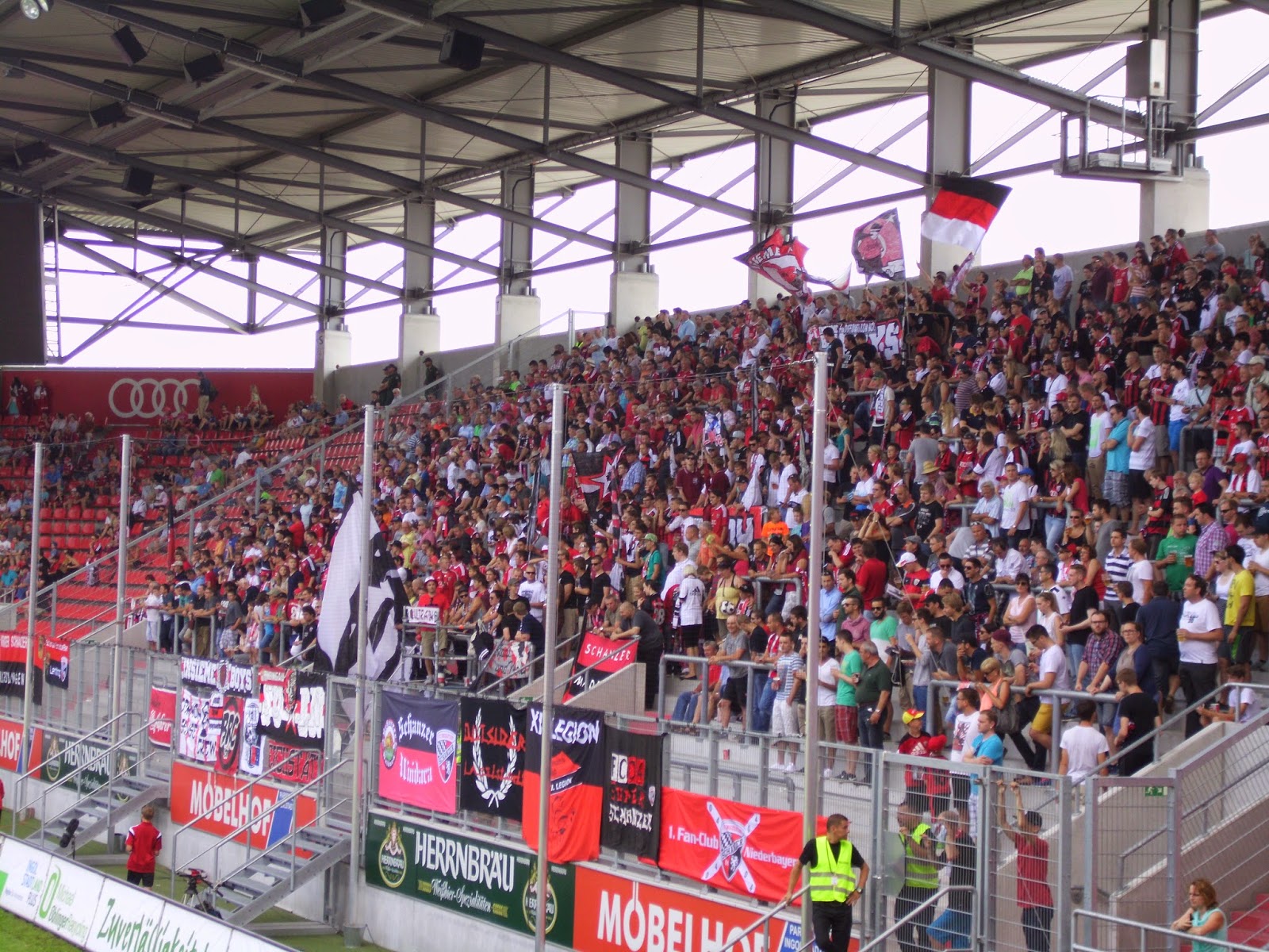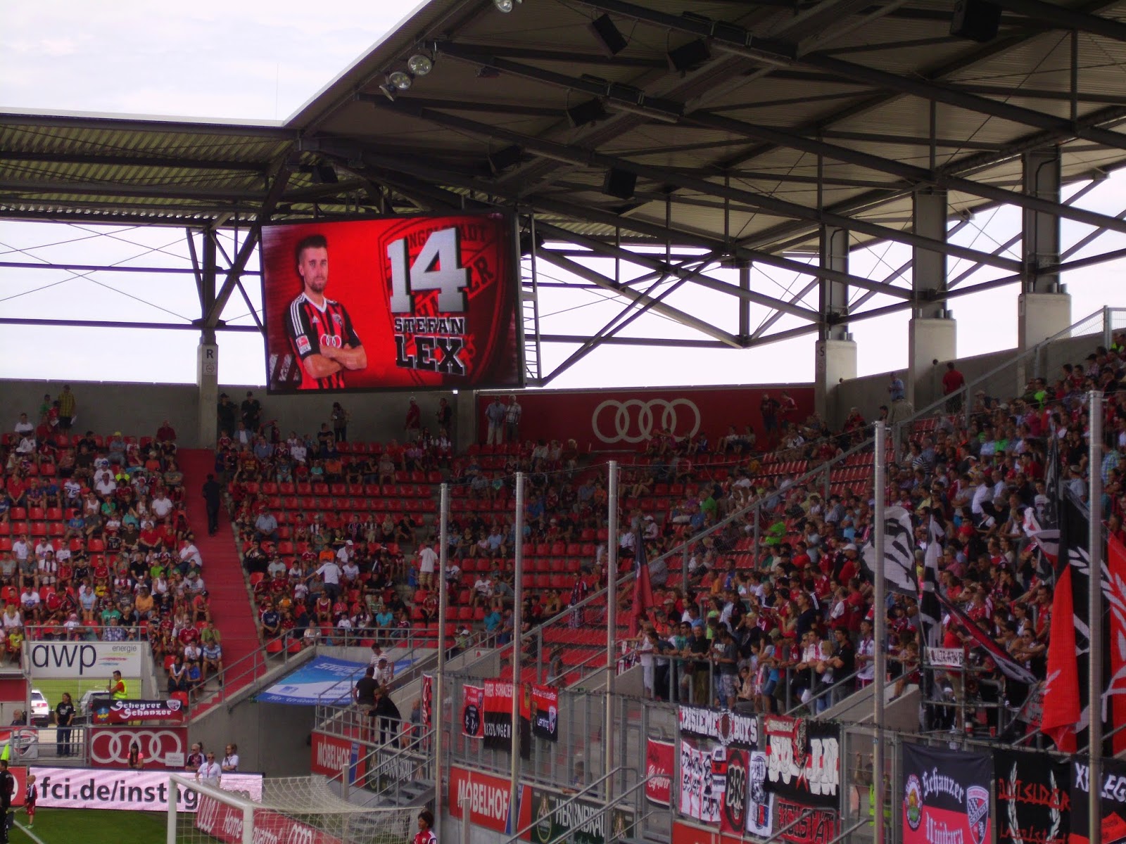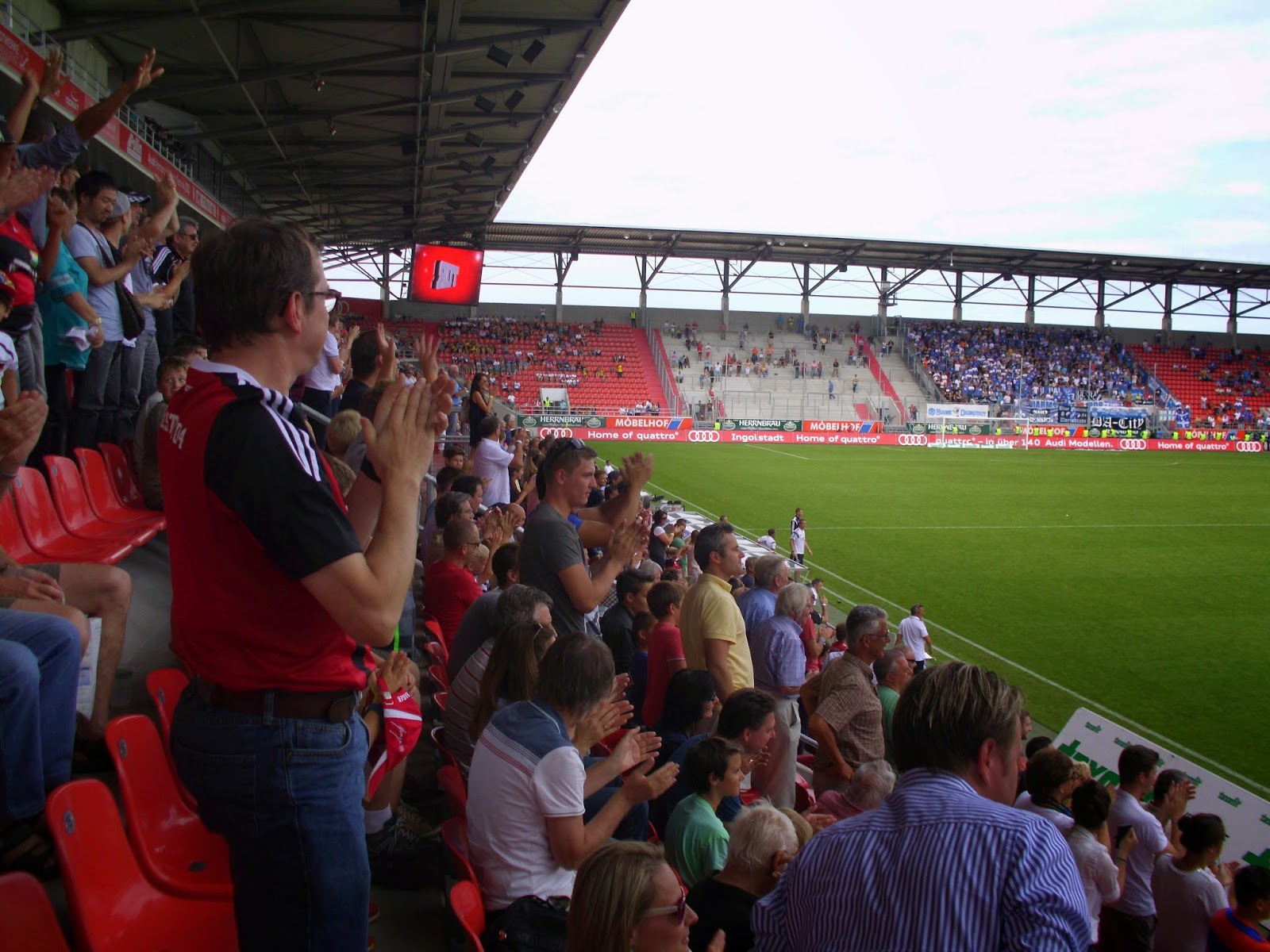 Eine knappe Viertelstunde Spezialführung endet dann am Audi Sportpark, einer Allerweltsarena im Ingolstädter Nirgendwo. Der FC – erst 2004 durch Ausgliederung der Fußballabteilung von zwei Ingolstädter Vereinen entstanden – spielt hier seit der Saison 2010/11. Außen mehr als unauffällig, wird es innen nicht viel besser. Hinter beiden Toren befinden sich im Stadion Stehplatzbereiche, der Rest der 15.000 Plätze besteht aus Sitzen. 9.000 Zuschauer kommen zu diesem Spiel gegen den Aufsteiger – ein nicht kleiner Teil durch Freikarten an Jugend-Meistermannschaften aus Bayern. Rund 1.000 Darmstädter haben zudem auf den Weg nach Ingolstadt gemacht.