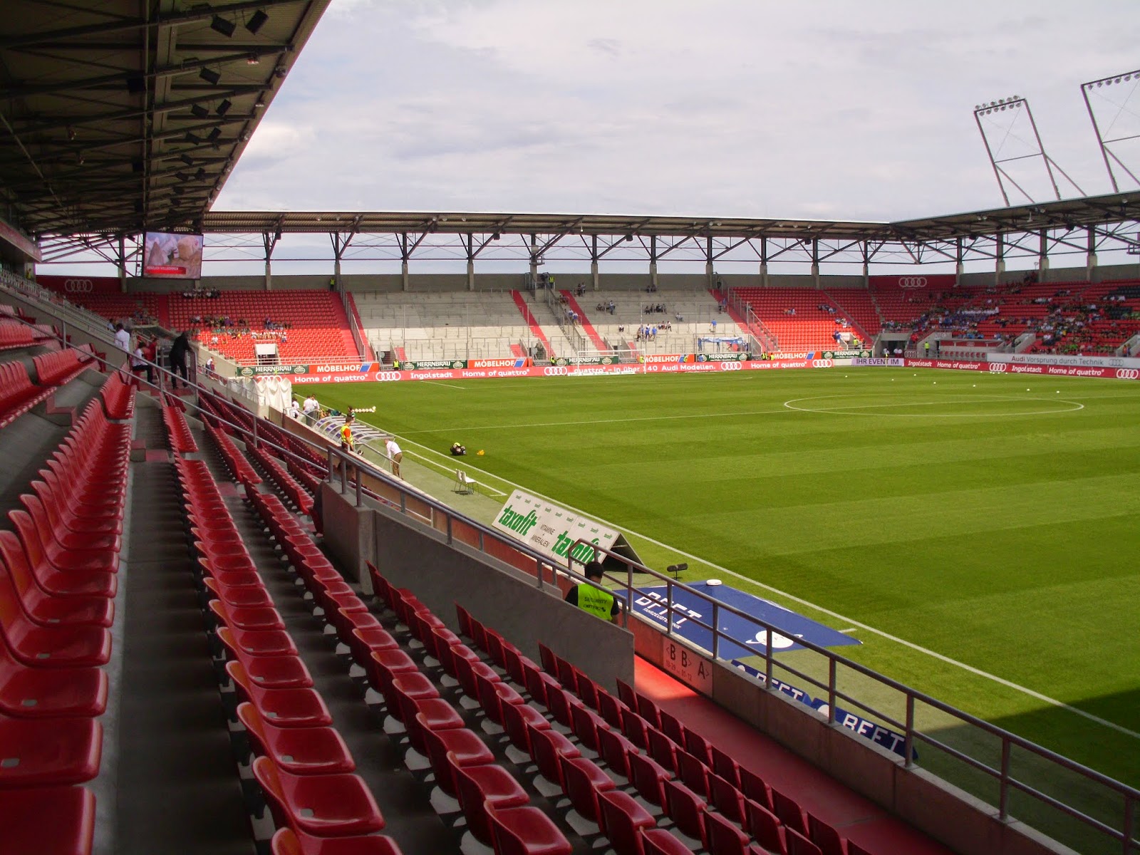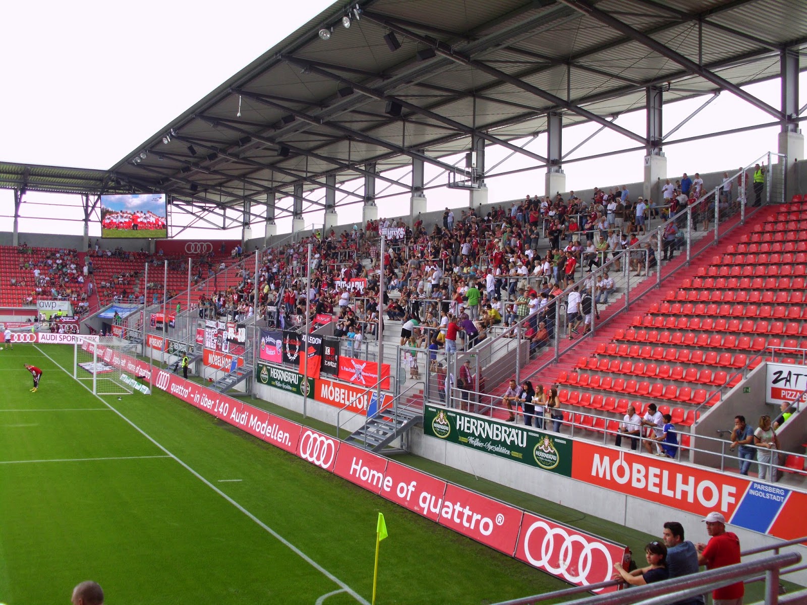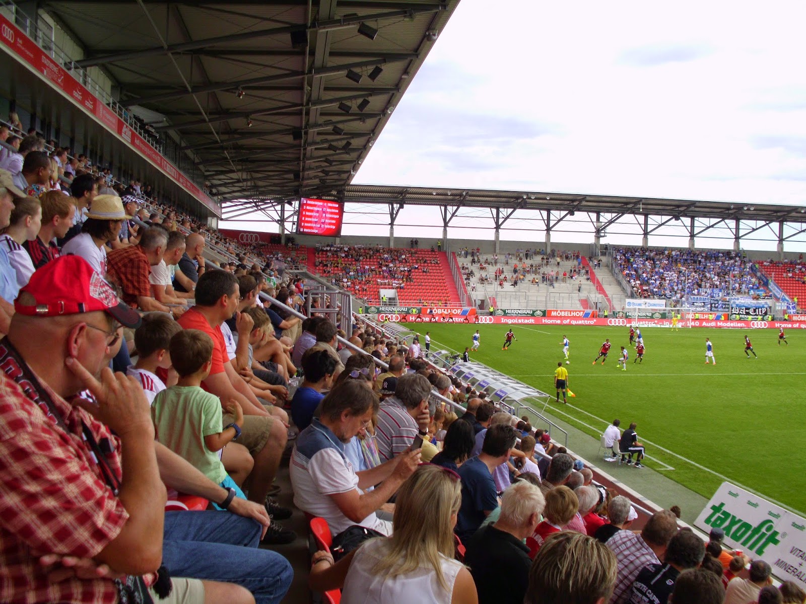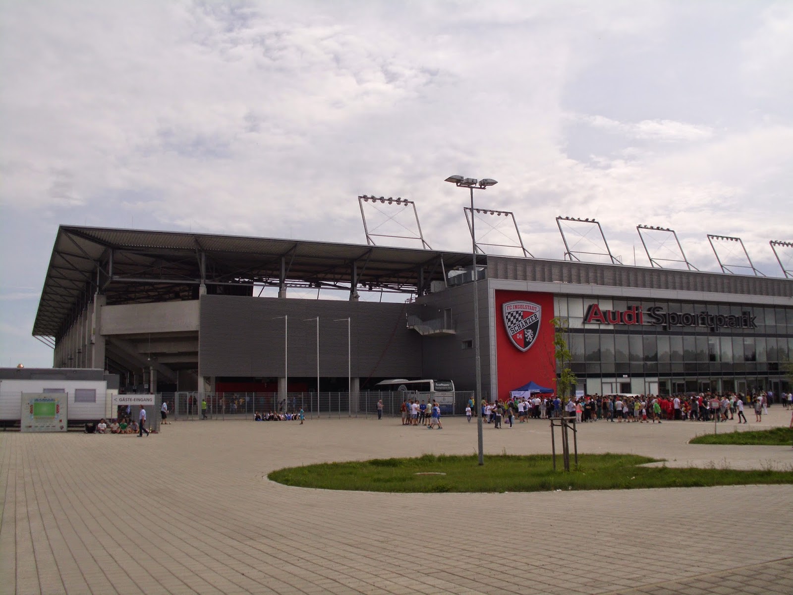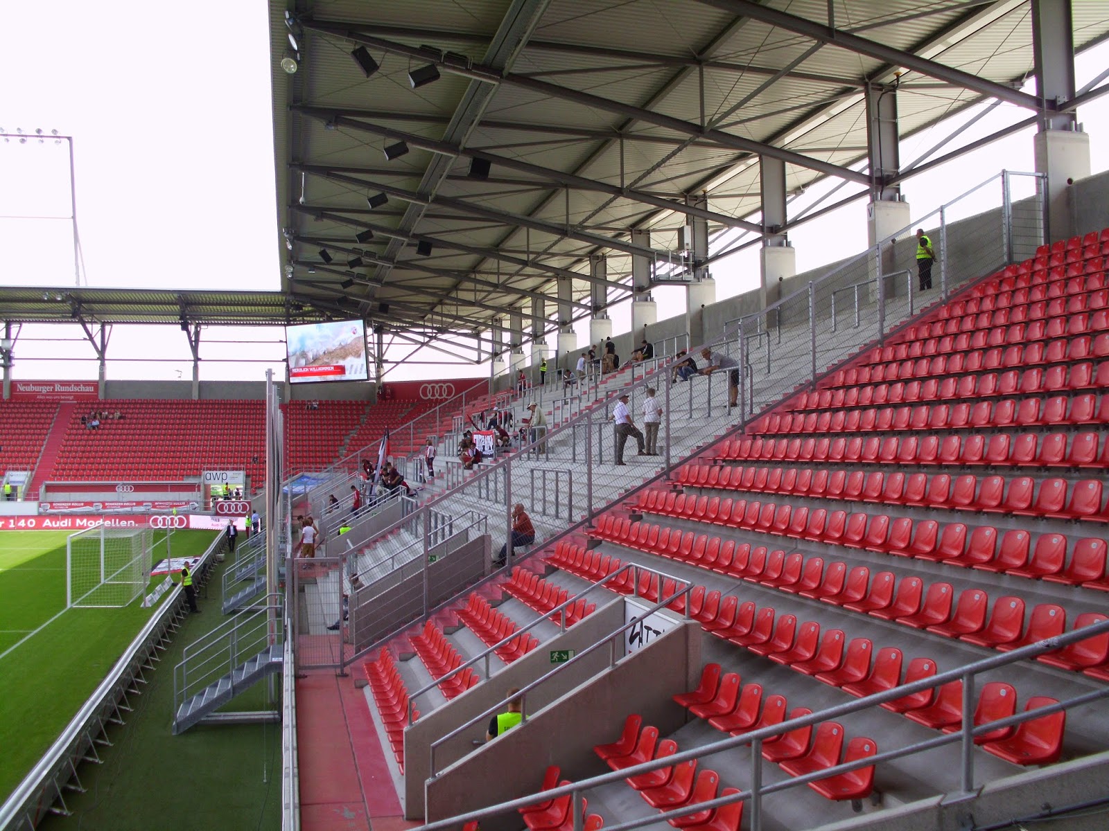 Eine knappe Viertelstunde Spezialführung endet dann am Audi Sportpark, einer Allerweltsarena im Ingolstädter Nirgendwo. Der FC – erst 2004 durch Ausgliederung der Fußballabteilung von zwei Ingolstädter Vereinen entstanden – spielt hier seit der Saison 2010/11. Außen mehr als unauffällig, wird es innen nicht viel besser. Hinter beiden Toren befinden sich im Stadion Stehplatzbereiche, der Rest der 15.000 Plätze besteht aus Sitzen. 9.000 Zuschauer kommen zu diesem Spiel gegen den Aufsteiger – ein nicht kleiner Teil durch Freikarten an Jugend-Meistermannschaften aus Bayern. Rund 1.000 Darmstädter haben zudem auf den Weg nach Ingolstadt gemacht.