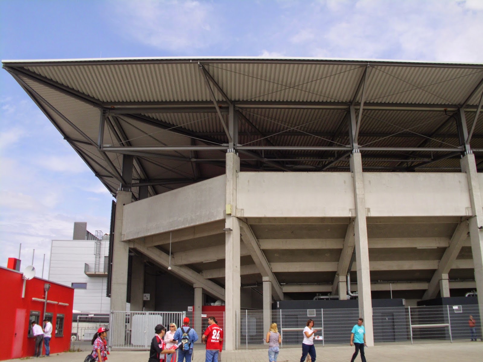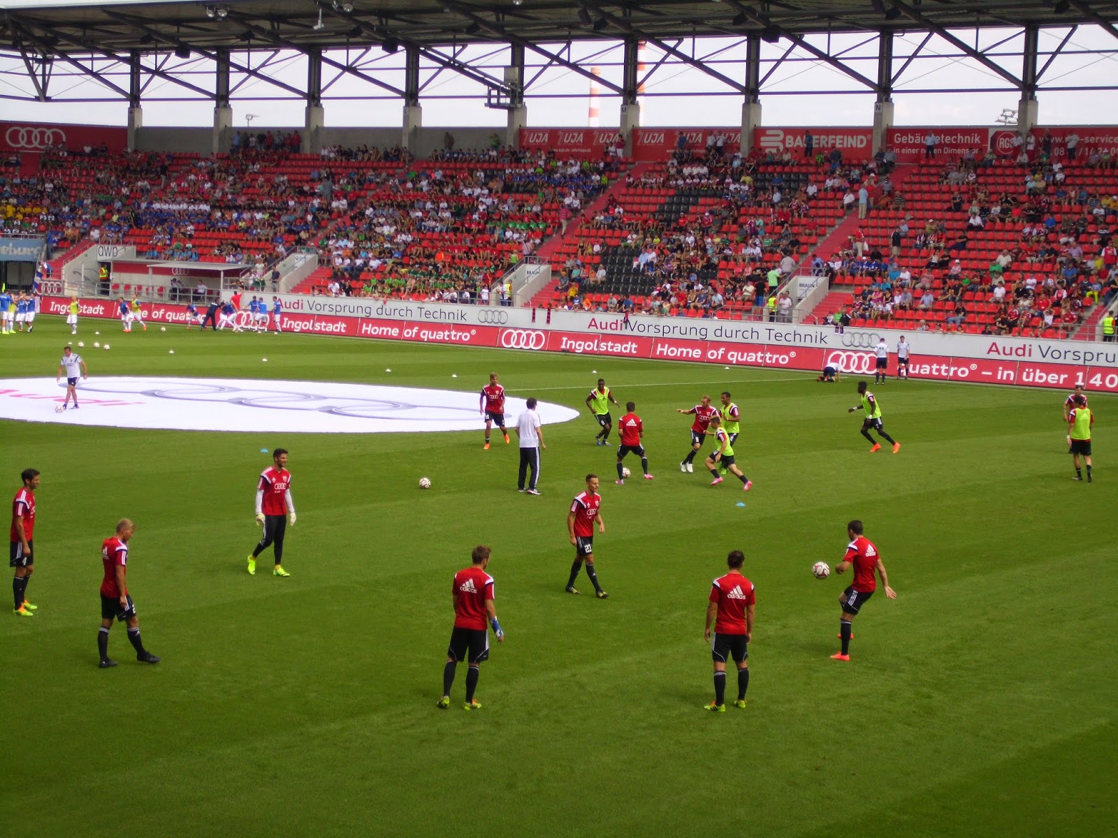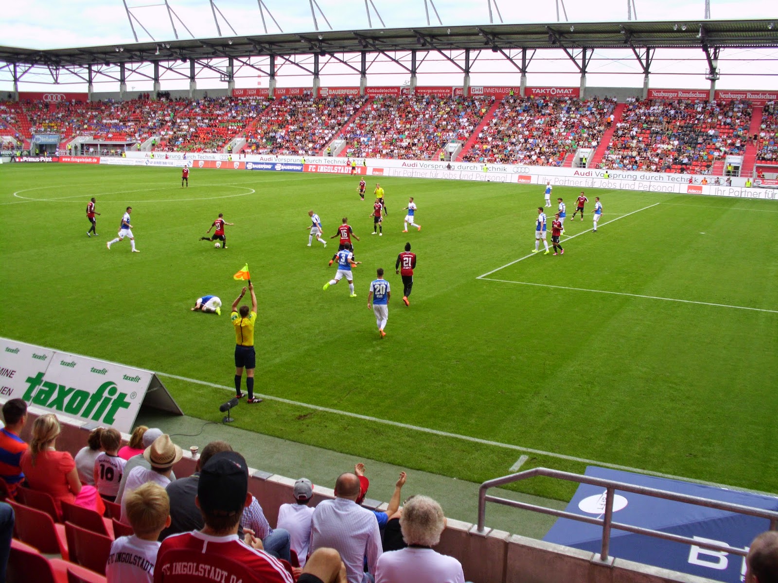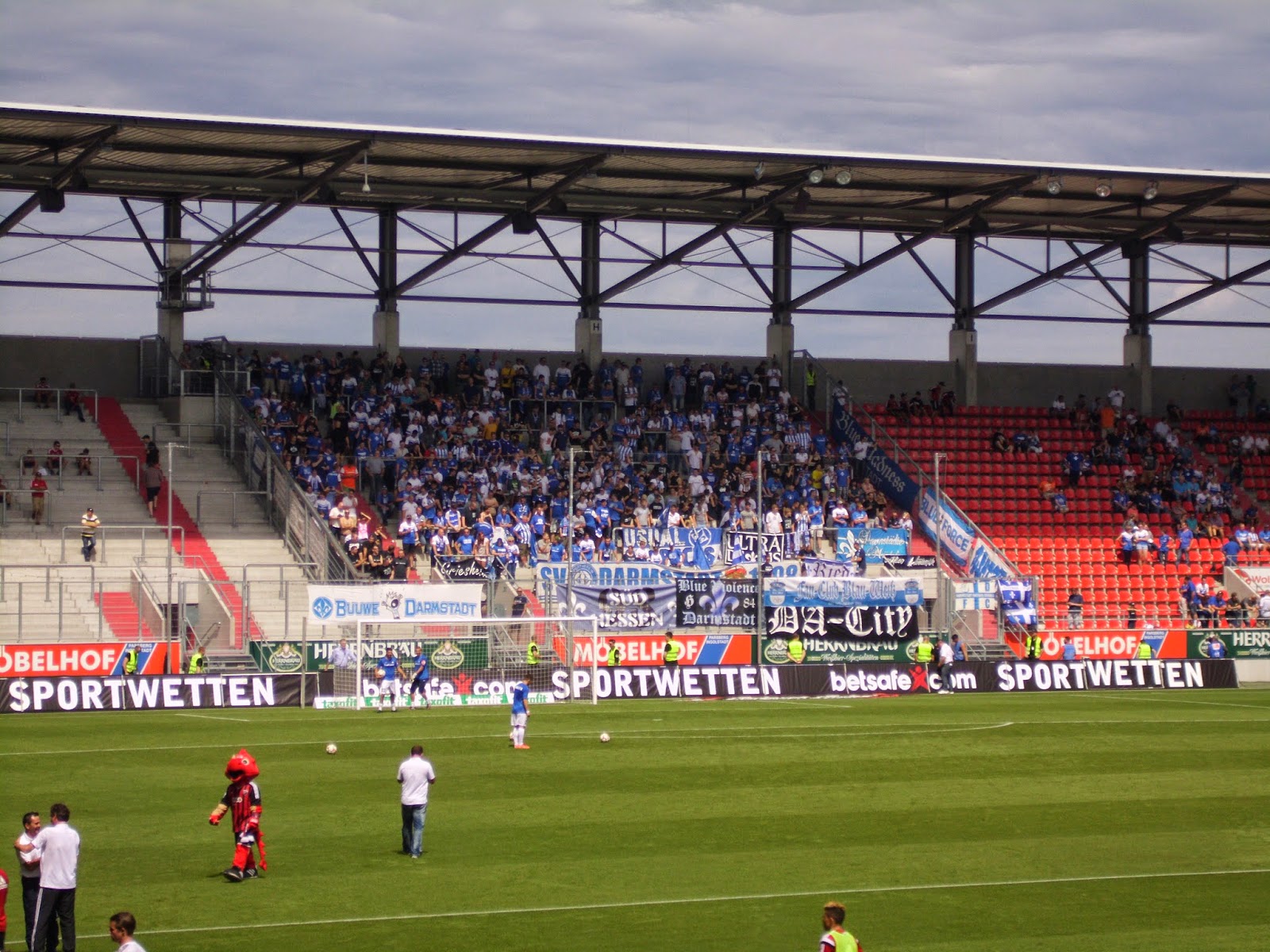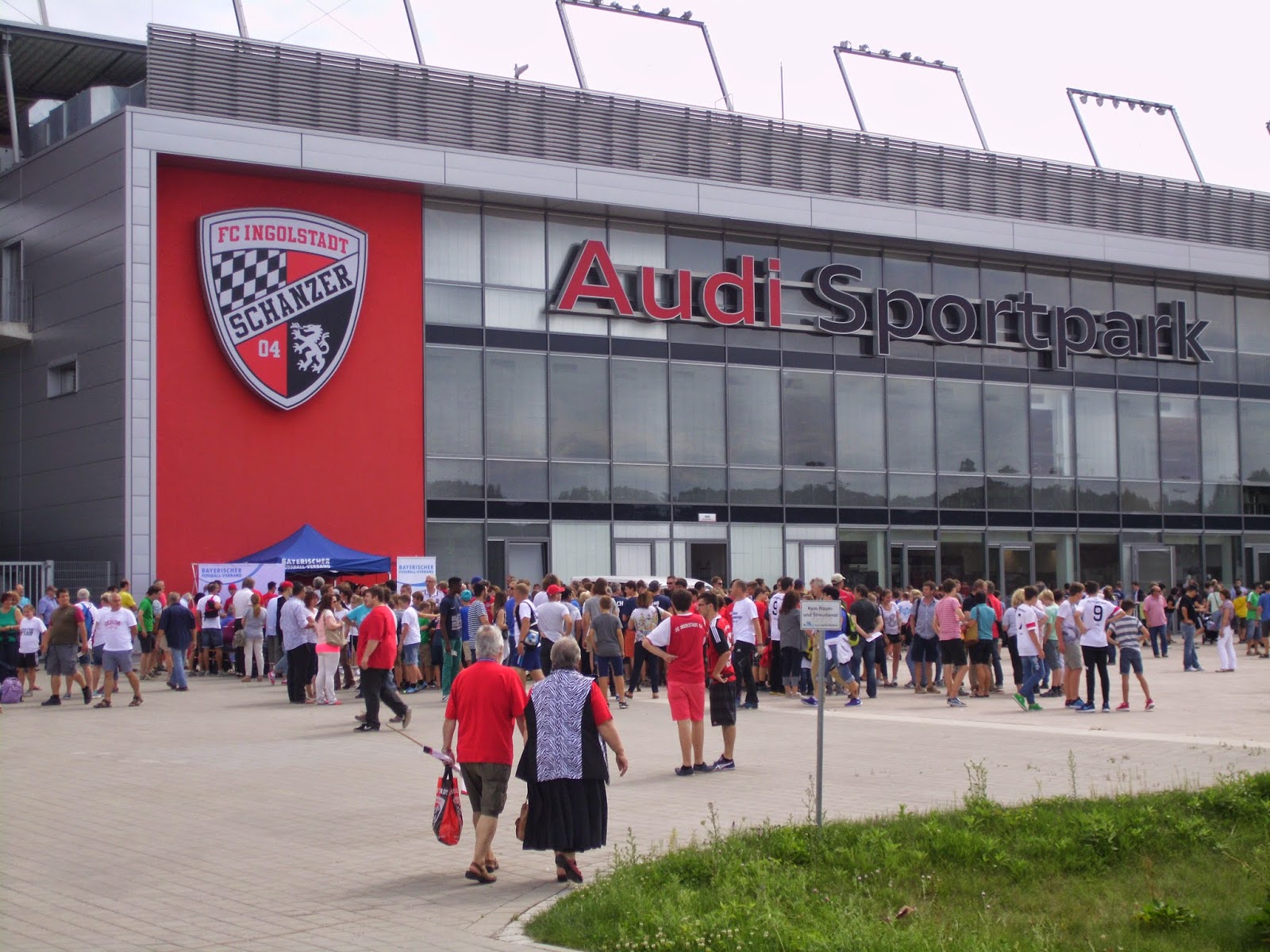 Eine knappe Viertelstunde Spezialführung endet dann am Audi Sportpark, einer Allerweltsarena im Ingolstädter Nirgendwo. Der FC – erst 2004 durch Ausgliederung der Fußballabteilung von zwei Ingolstädter Vereinen entstanden – spielt hier seit der Saison 2010/11. Außen mehr als unauffällig, wird es innen nicht viel besser. Hinter beiden Toren befinden sich im Stadion Stehplatzbereiche, der Rest der 15.000 Plätze besteht aus Sitzen. 9.000 Zuschauer kommen zu diesem Spiel gegen den Aufsteiger – ein nicht kleiner Teil durch Freikarten an Jugend-Meistermannschaften aus Bayern. Rund 1.000 Darmstädter haben zudem auf den Weg nach Ingolstadt gemacht.