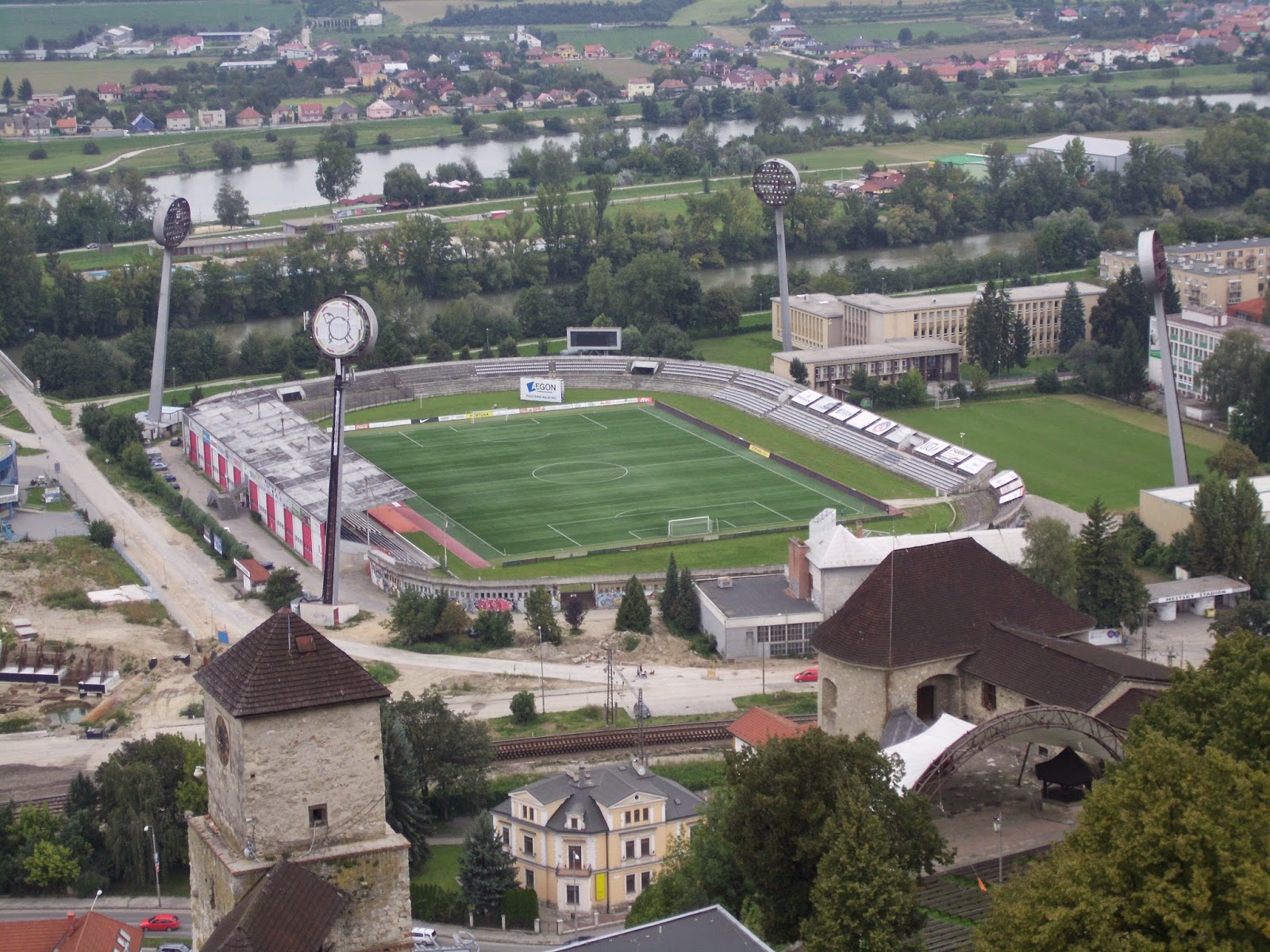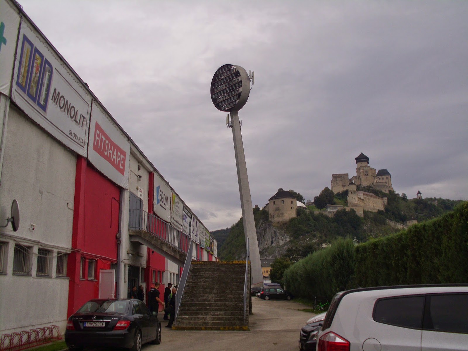 Das Stadtbild des slowakischen Trencin prägen vor allem zwei Bauwerke (wobei die Reihenfolge durchaus auch die Dominanz widerspiegelt): Zum einen die auf einem Felsen errichtete drittgrößte Burganlage des Landes, zum anderen das städtische Stadion, bzw. da vor allem die extrem auffälligen Flutlichtmasten. Ersteres nehme ich bei einem Spaziergang am Nachmittag genauer unter die Lupe.