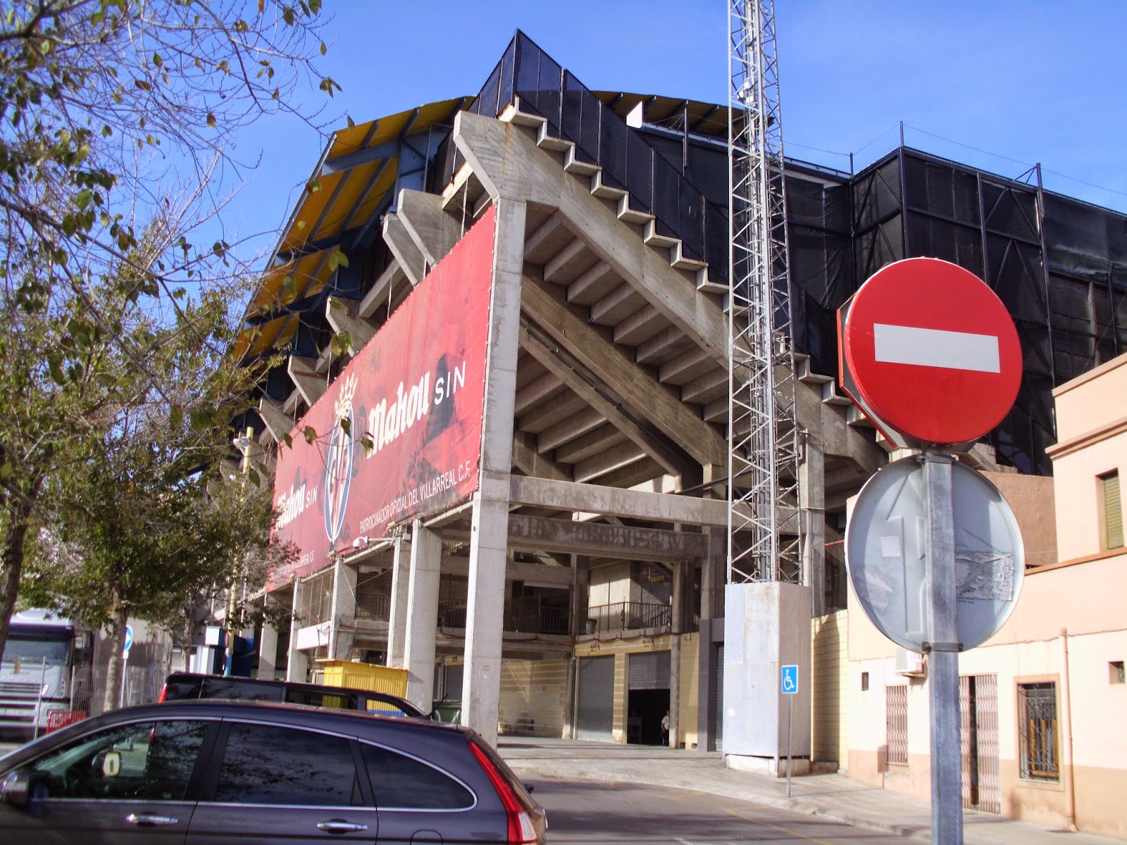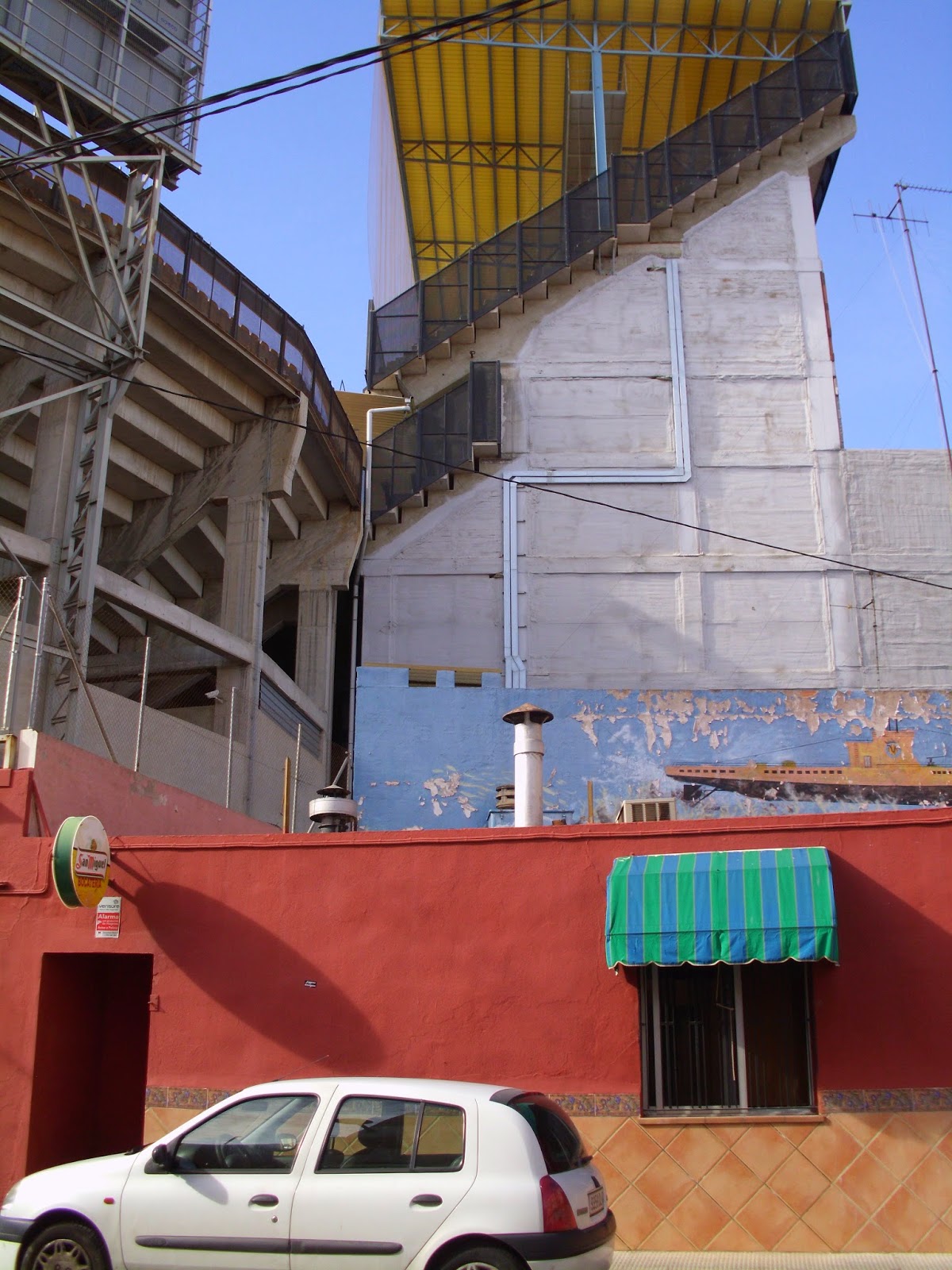 Das Madrigal wollte ich ja schon vor zwei Jahren bei meinem Aufschlag in Valencia besuchen, ging sich damals aber wegen einem fast zeitgleichen Spiel im Mestalla nicht aus. Was ich damals versäumte konnte ich nun dank meiner frühen Ankunft am Stadion in vollen Zügen genießen. Direkt ins umgebende Viertel und sogar teilweise in die dort befindlichen Häuser integriert ist El Madrigal schon ein Ereignis für sich selbst. So knapp an Wohnhäuser heran hab ich wirklich selten ein Stadion gesehen (Vielleicht noch die Loftus Road in London, oder das mittlerweile abgerissene Ali Sami Yen in Istanbul).