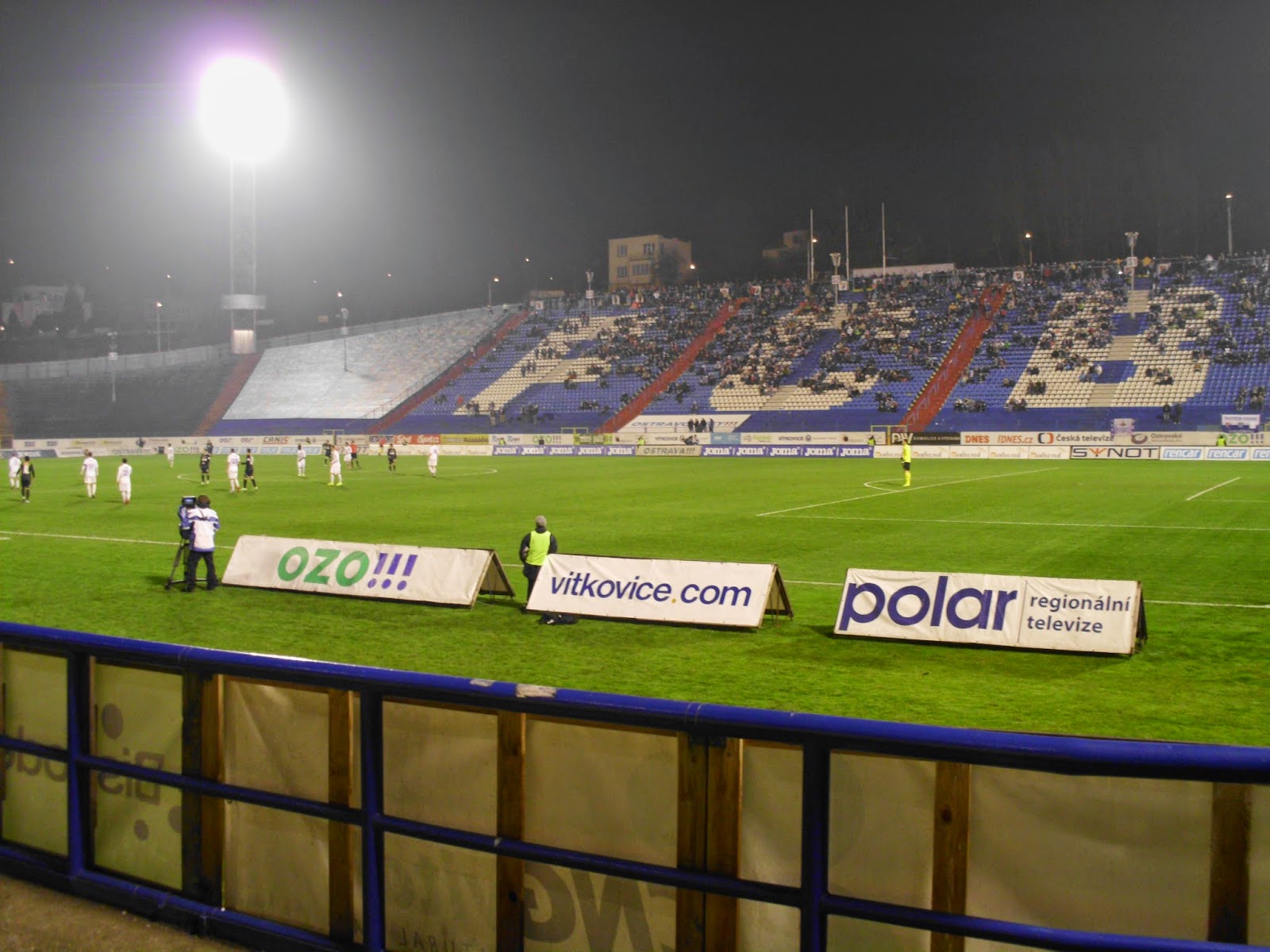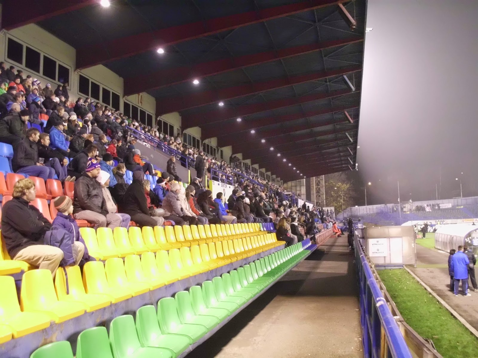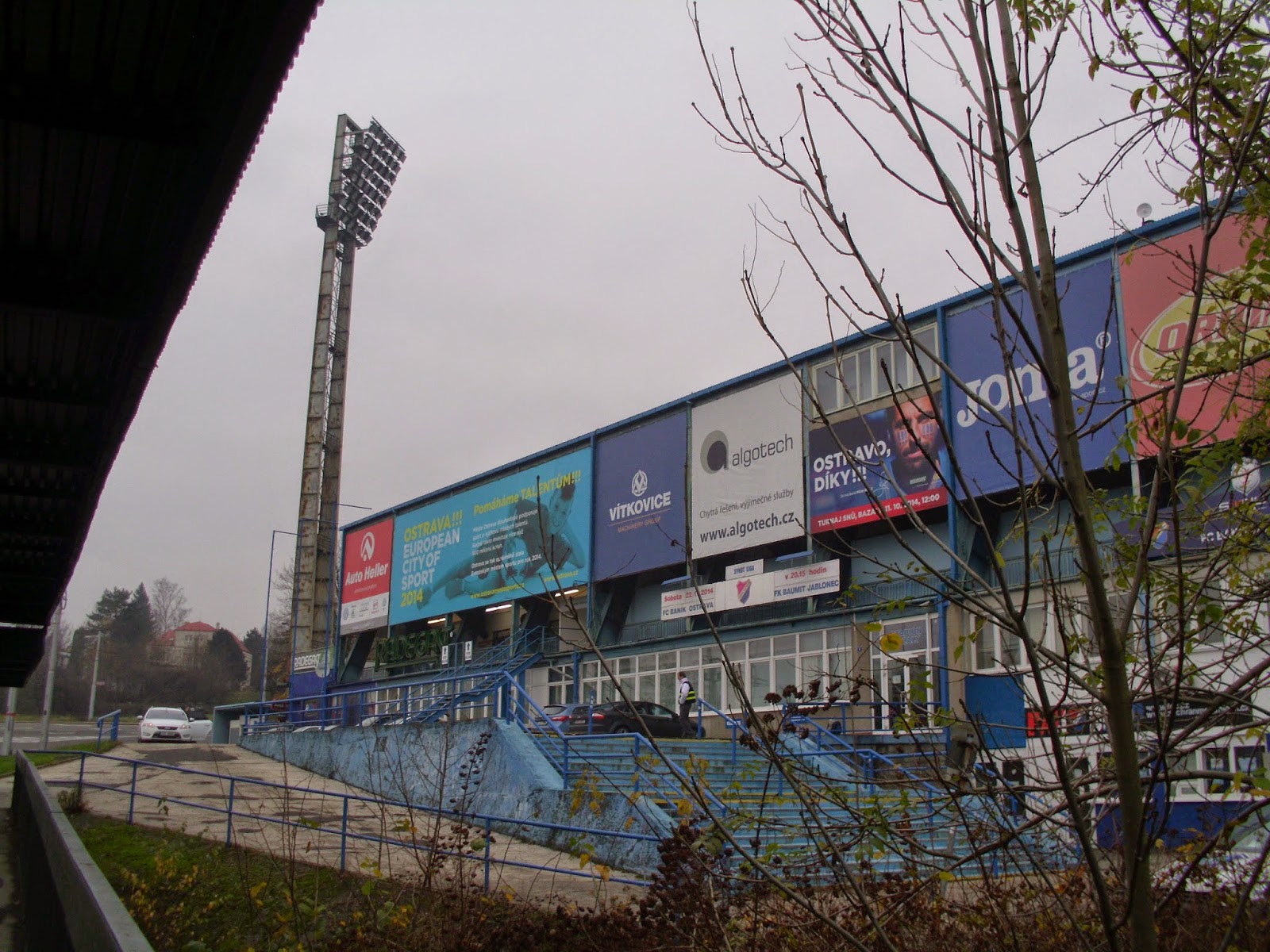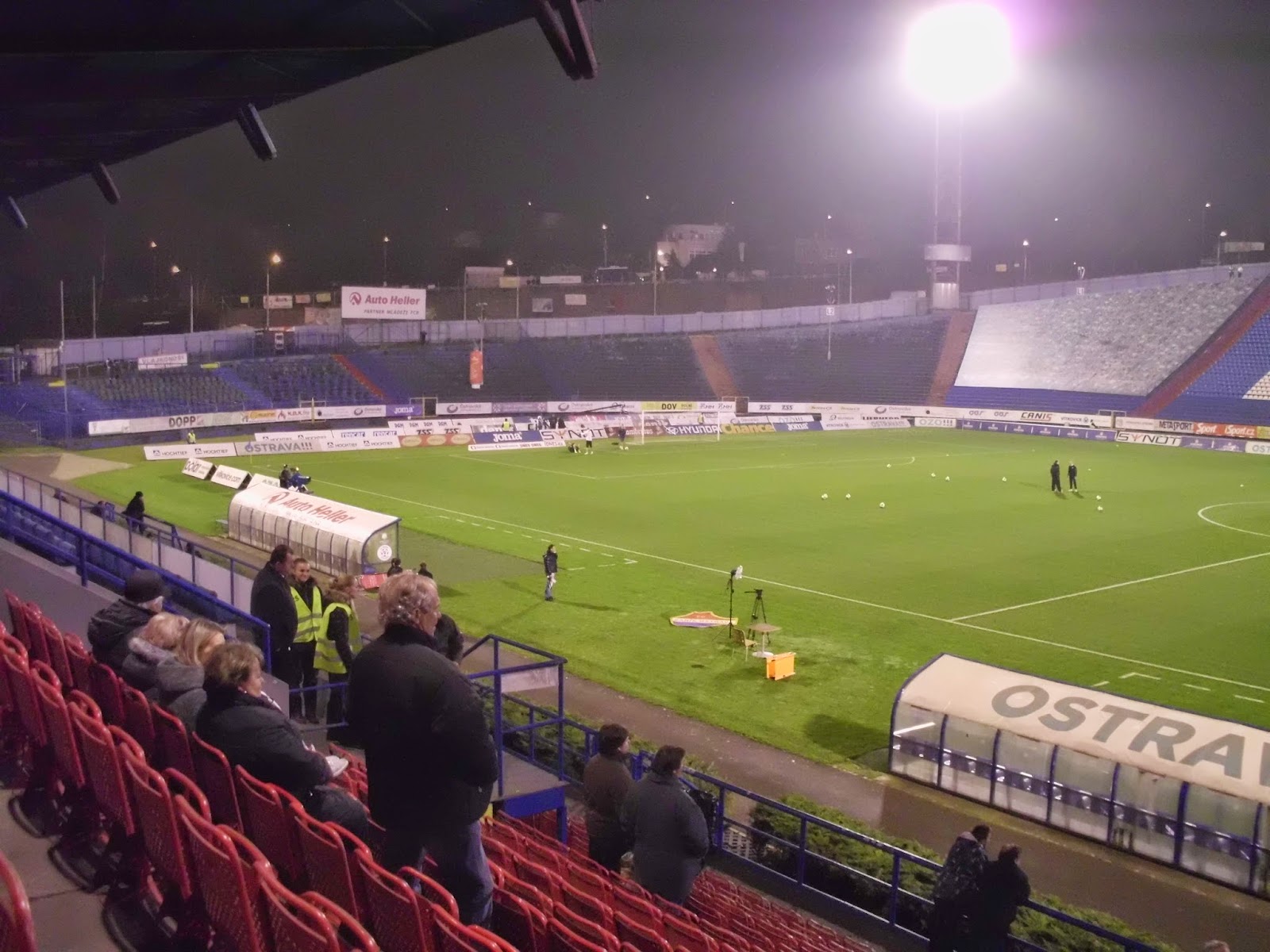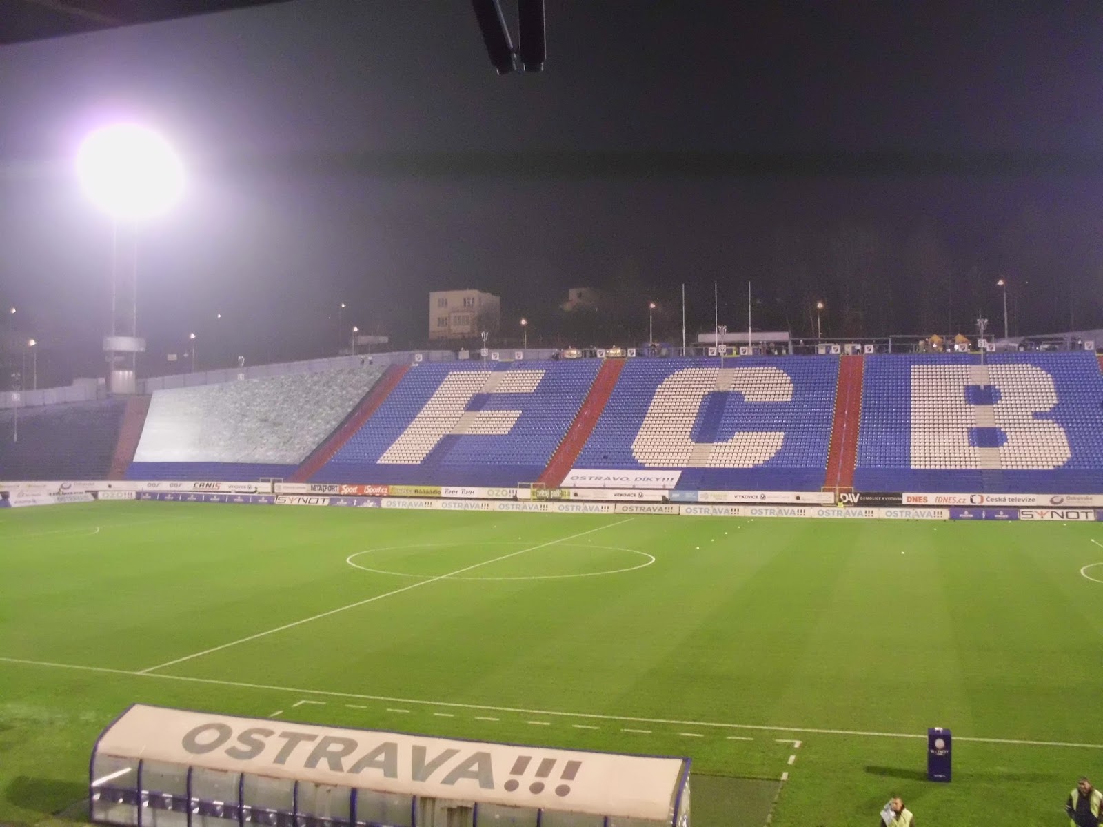 Bereits im schlesischen Teil der Stadt, auf dem anderen Ufer der Ostravice befindet sich das Stadion Bazaly, dessen Flutlichtmasten einen Konterpunkt zum markanten Turm des Rathauses setzen. Entlang der Haupttribüne direkt an der Stadtautobahn und gegenüberliegend in einen Hügel reingehauen passt es sich durchaus an den Eindruck der restlichen Stadt an – dennoch ist es durchaus wert, das Bazaly auch mal am Tag zu sehen. Viele andere Ablenkungen gibt es hier ja sowieso nicht.