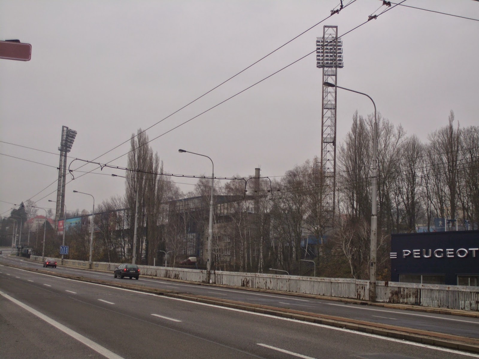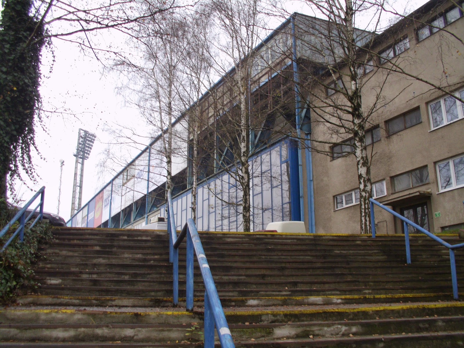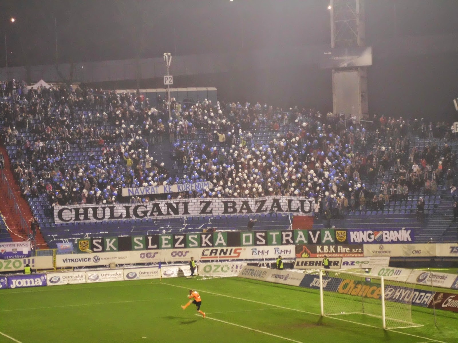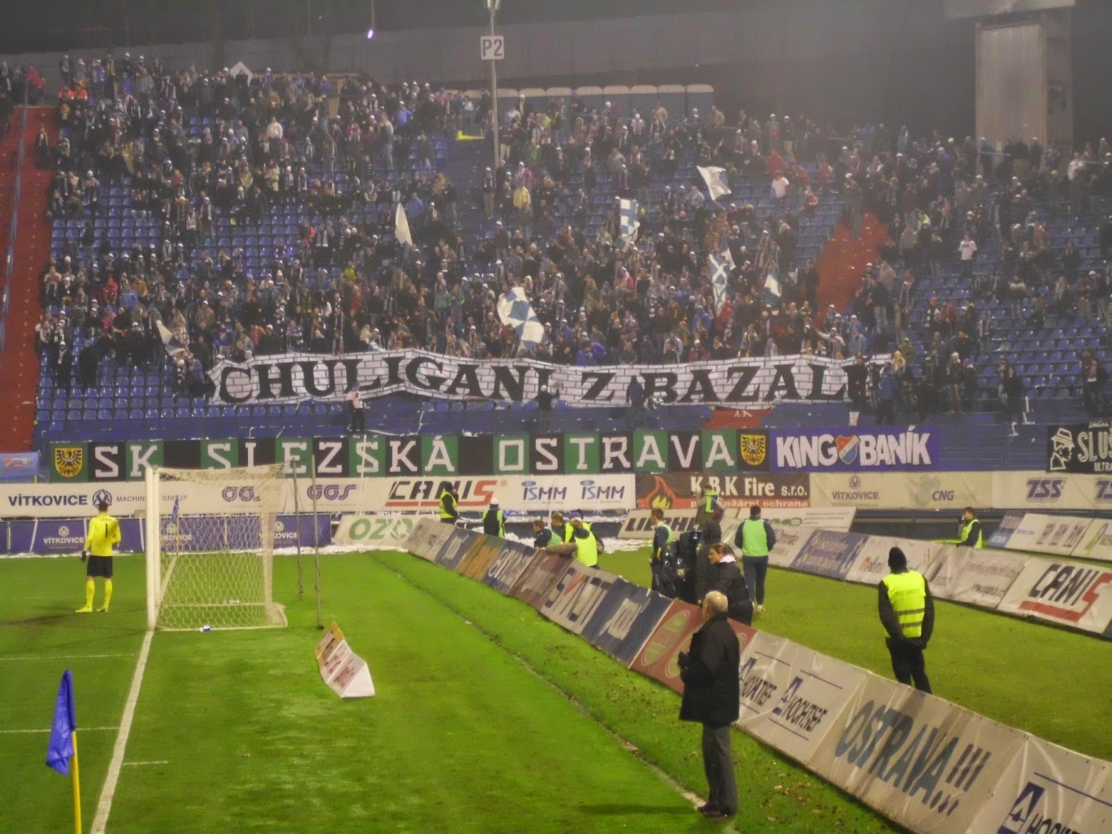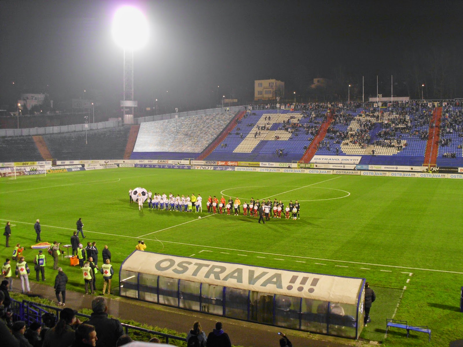 Bereits im schlesischen Teil der Stadt, auf dem anderen Ufer der Ostravice befindet sich das Stadion Bazaly, dessen Flutlichtmasten einen Konterpunkt zum markanten Turm des Rathauses setzen. Entlang der Haupttribüne direkt an der Stadtautobahn und gegenüberliegend in einen Hügel reingehauen passt es sich durchaus an den Eindruck der restlichen Stadt an – dennoch ist es durchaus wert, das Bazaly auch mal am Tag zu sehen. Viele andere Ablenkungen gibt es hier ja sowieso nicht.