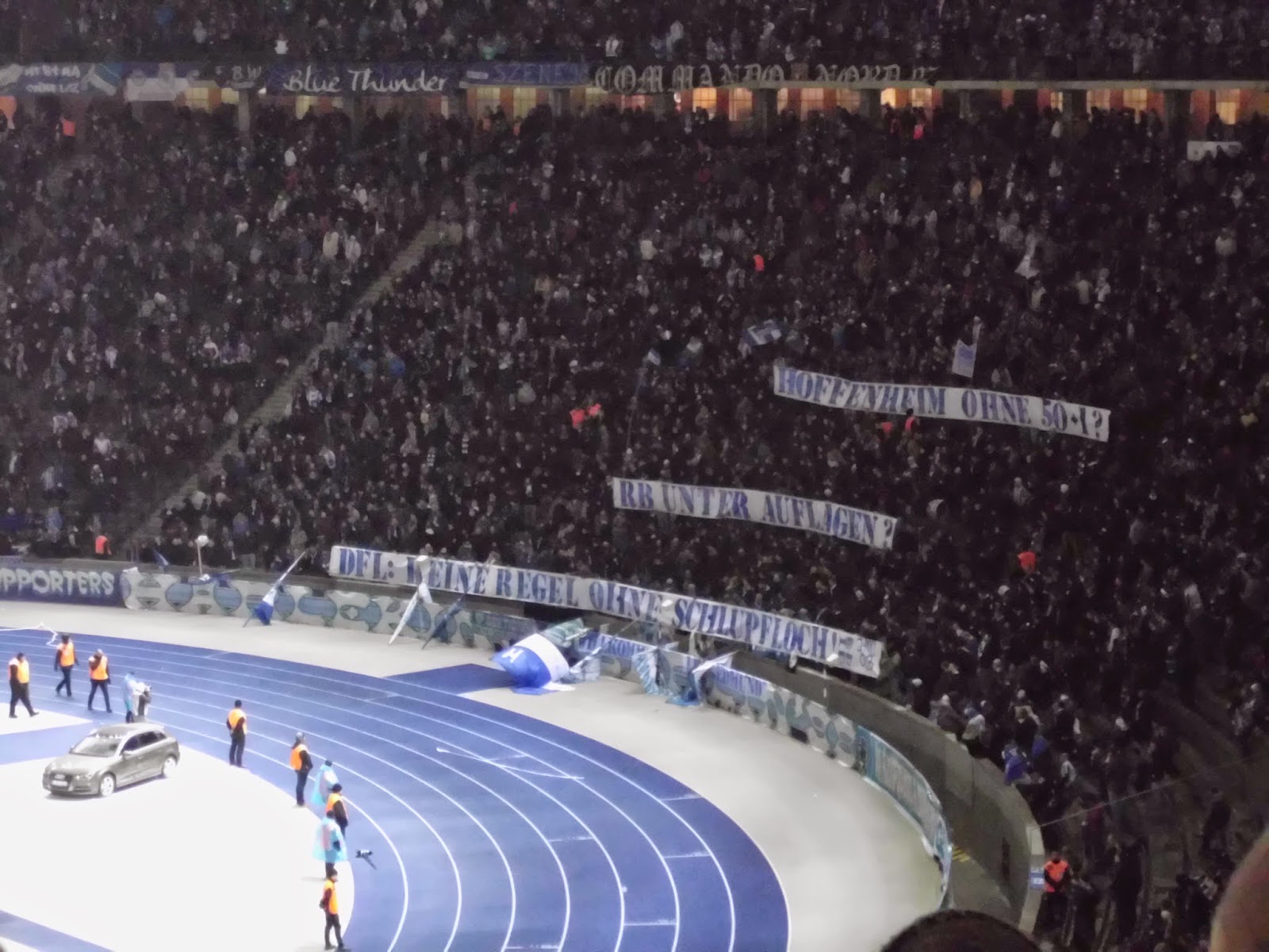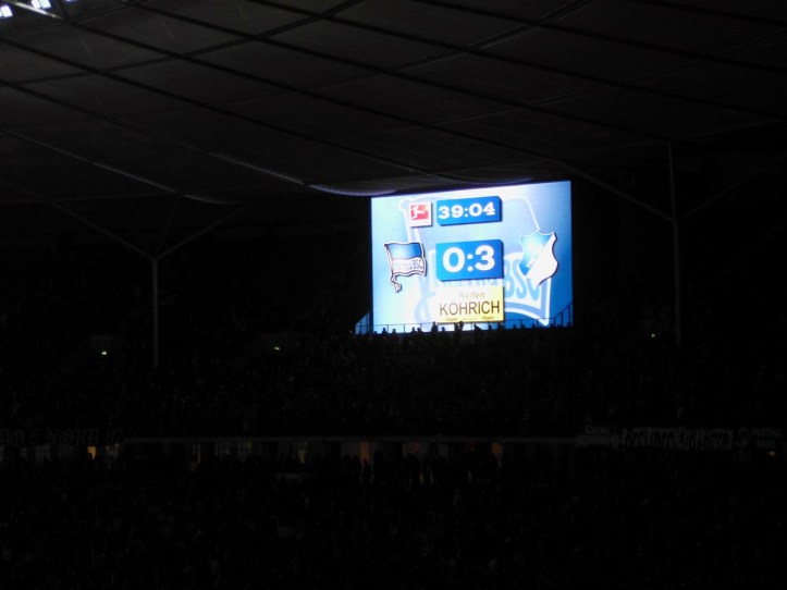 Die Leistung der Mannschaft lässt die Fans aber relativ rasch verstummen – und dann sogar den kleinen Haufen an Hoffenheim-Anhängern laut werden: Durch ein dummes Eigentor und zwei Elfmeter liegt Hertha bereits nach 45 Minuten 0:3 zurück – der Leistung entspricht dies durchaus. Nur zu Beginn der zweiten Halbzeit kommt kurz Hoffnung auf, dass die Berliner das Spiel doch noch drehen können. Zwei gute Konter (dabei einmal ein katastrophaler Abwehrfehler dazukommend) der Hoffenheimer machen aber dann endgültig damit Schluss.