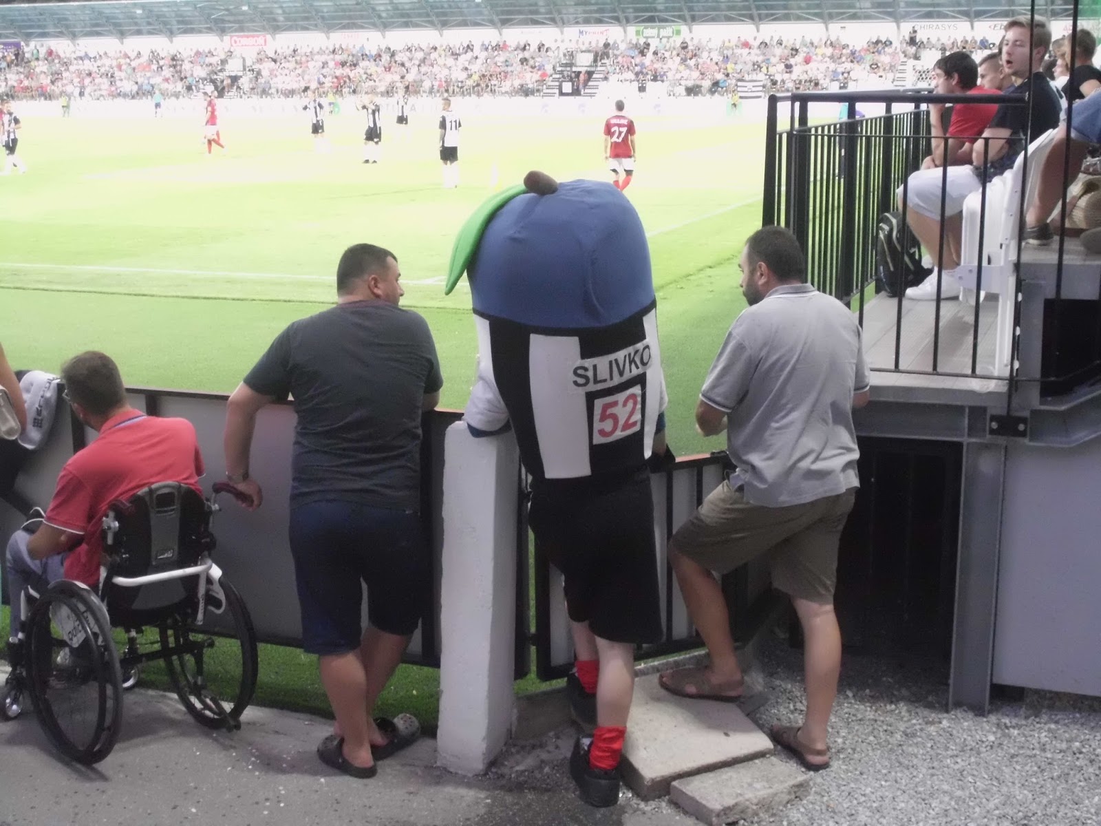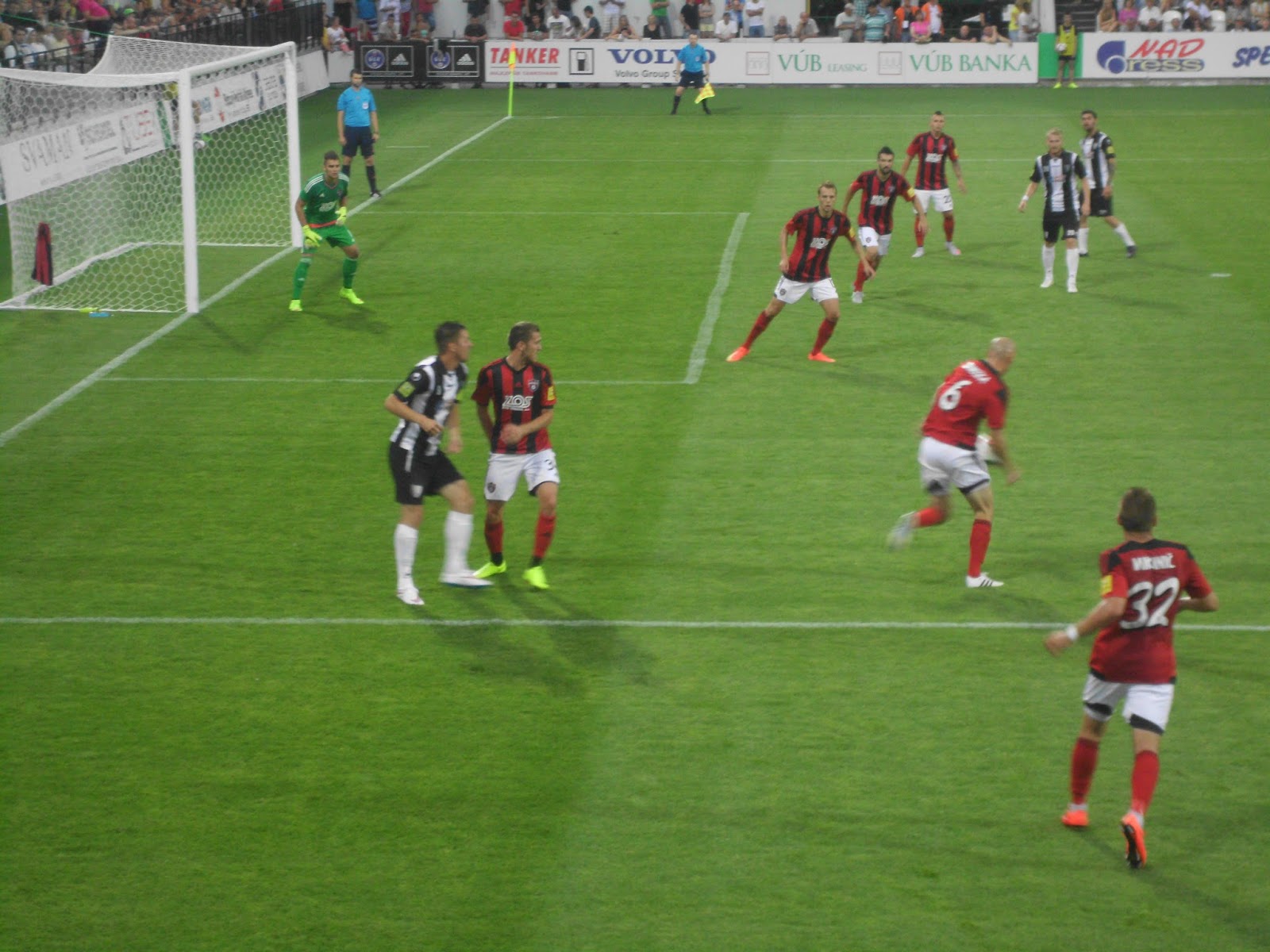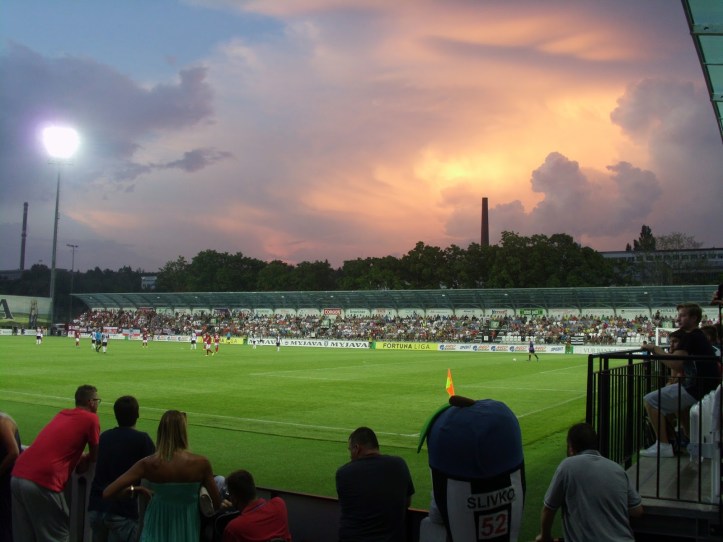 Auf den Rängen merkt man jedenfalls rasch, dass Trnava neben Slovan einer der beliebtesten Vereine der Slowakei ist: Zwar sind sehr viele Heimfans ebenfalls ausstaffiert, im Endeffekt werden sich aber wohl beide Seiten ziemlich die Waage halten. Mit zwei bummvollen Fansektoren sind die Gäste allerdings supportmässig eindeutig überlegen, auch wenn das Stadion ein Stimmungskiller par construction ist.