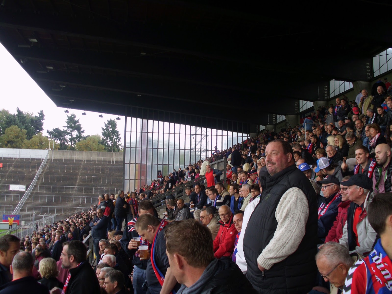 Die Grotenburg besteht aus zwei mächtigen Geraden und einer beeindruckenden Wand aus Stehplätzen hinter einem der Tore. Um das andere schmiegt sich eine Kurve im alten Stil herum. Stimmung ist hier trotz bei weitem nicht voller Auslastung um Hausecken besser als in Oberhausen. Verantwortlich dafür sind aber vor allem die blau-roten Fans der gastgebenden Gäste. Mit etwas Pech wäre ihnen allerdings das Singen im Hals stecken geblieben: Denn KFC ist zwar vor allem in der ersten Halbzeit drückend überlegen, hätte aber im Verlauf der zweiten Halbzeit auch locker in Rückstand geraten können. Das 2:0 wird erst spät hergestellt, Idrissou steuert dazu einen Treffer bei.