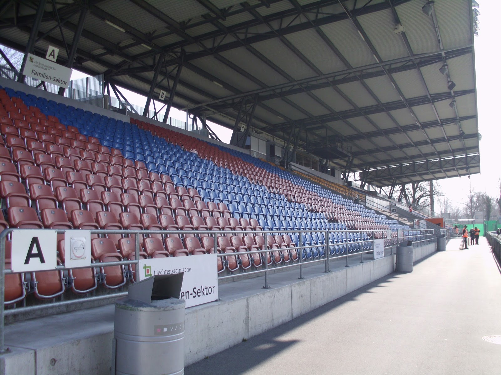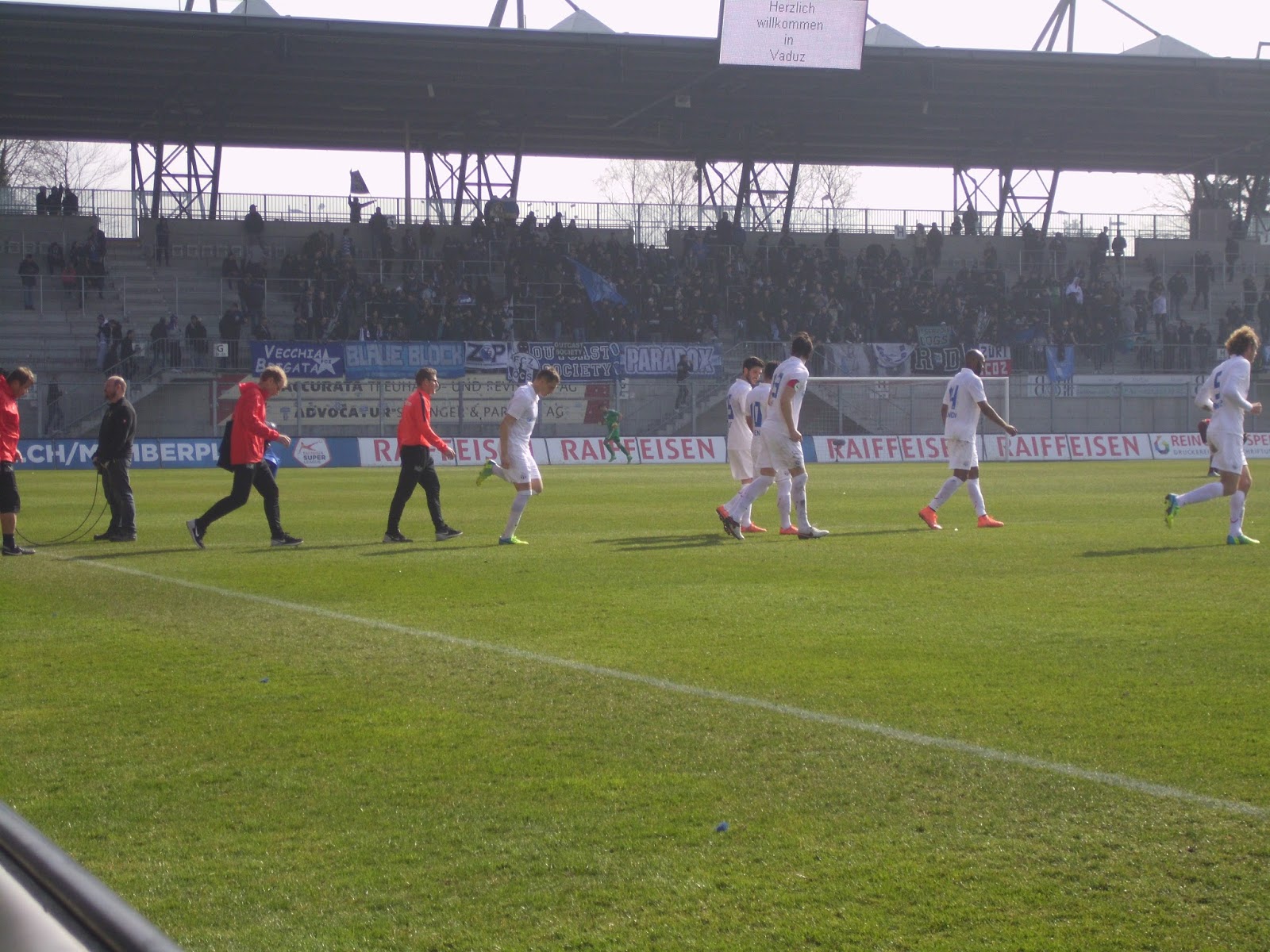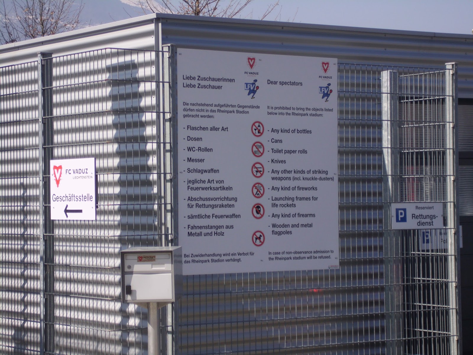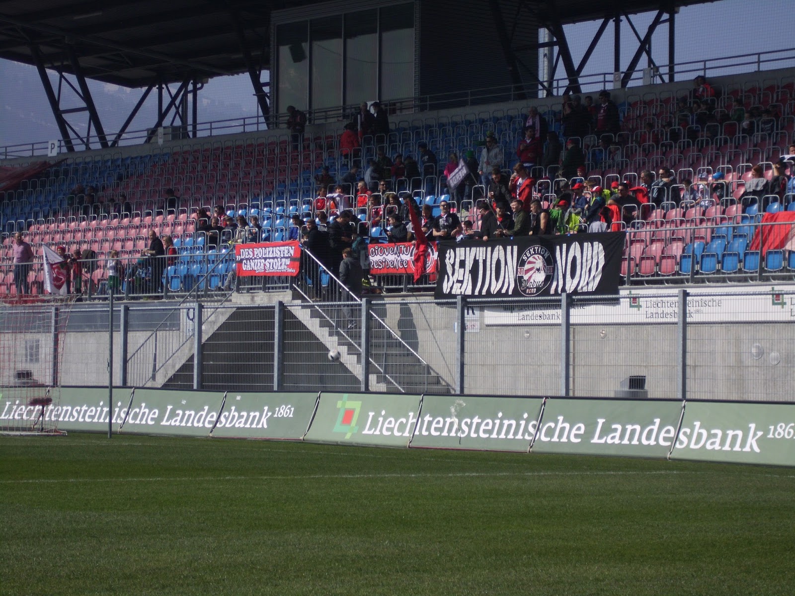 Das Stadion befindet sich etwas abseits des Vaduzer Stadtzentrums, dem Namen entsprechend direkt am Rhein. Die vier Tribünen sind für ein Kleinstadion durchwegs okay, wenn auch nicht gerade stimmungsfördernd weit auseinandergebaut. Wenn, dann sorgen aber wohl meist eh eher die Gästefans dafür, wie heute die sicher knapp über 1.500 Züricher. Der fürstentümliche Fansektor ist nämlich höchstens als bemüht zu bezeichnen, auch wenn er mit dem Transparent „Des Polizisten ganzer Stolz“ durchaus Ironiepunkte abstauben kann.