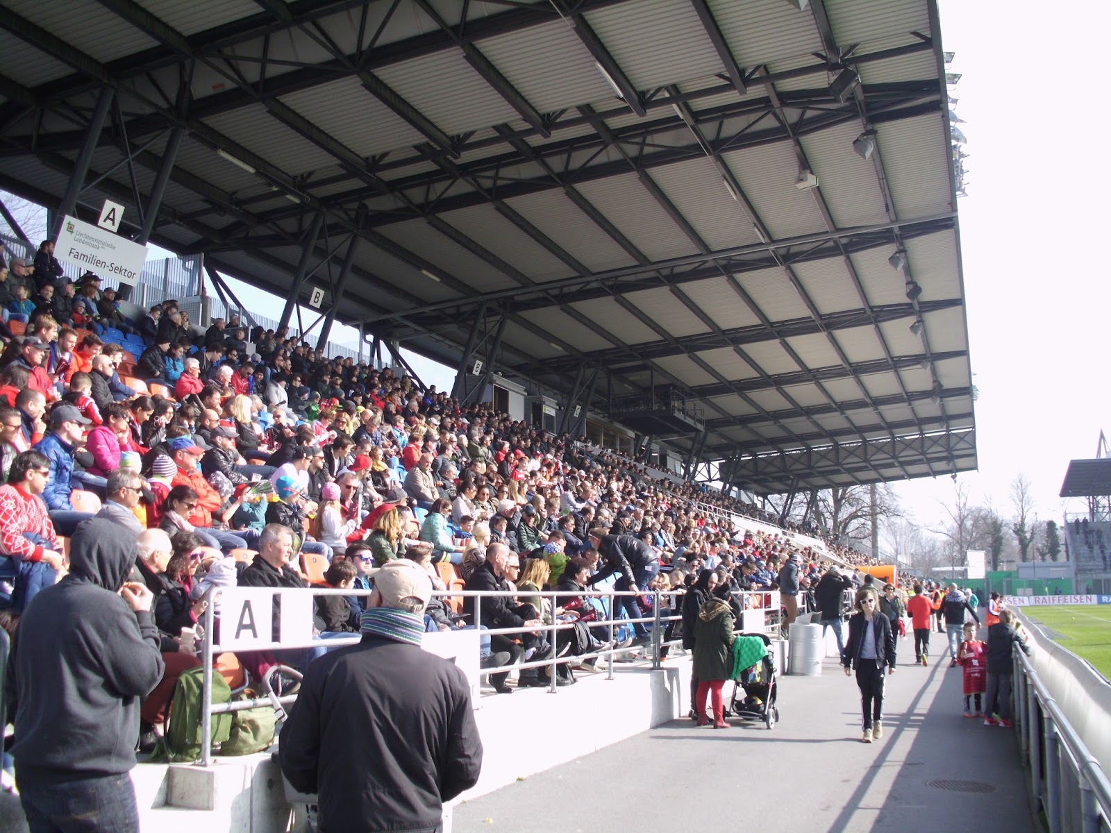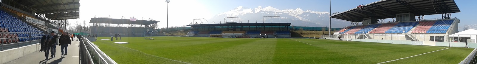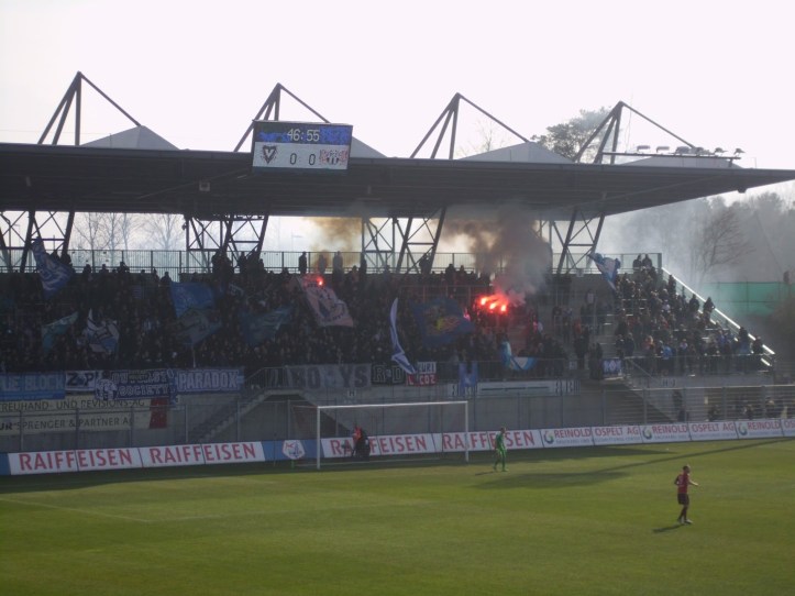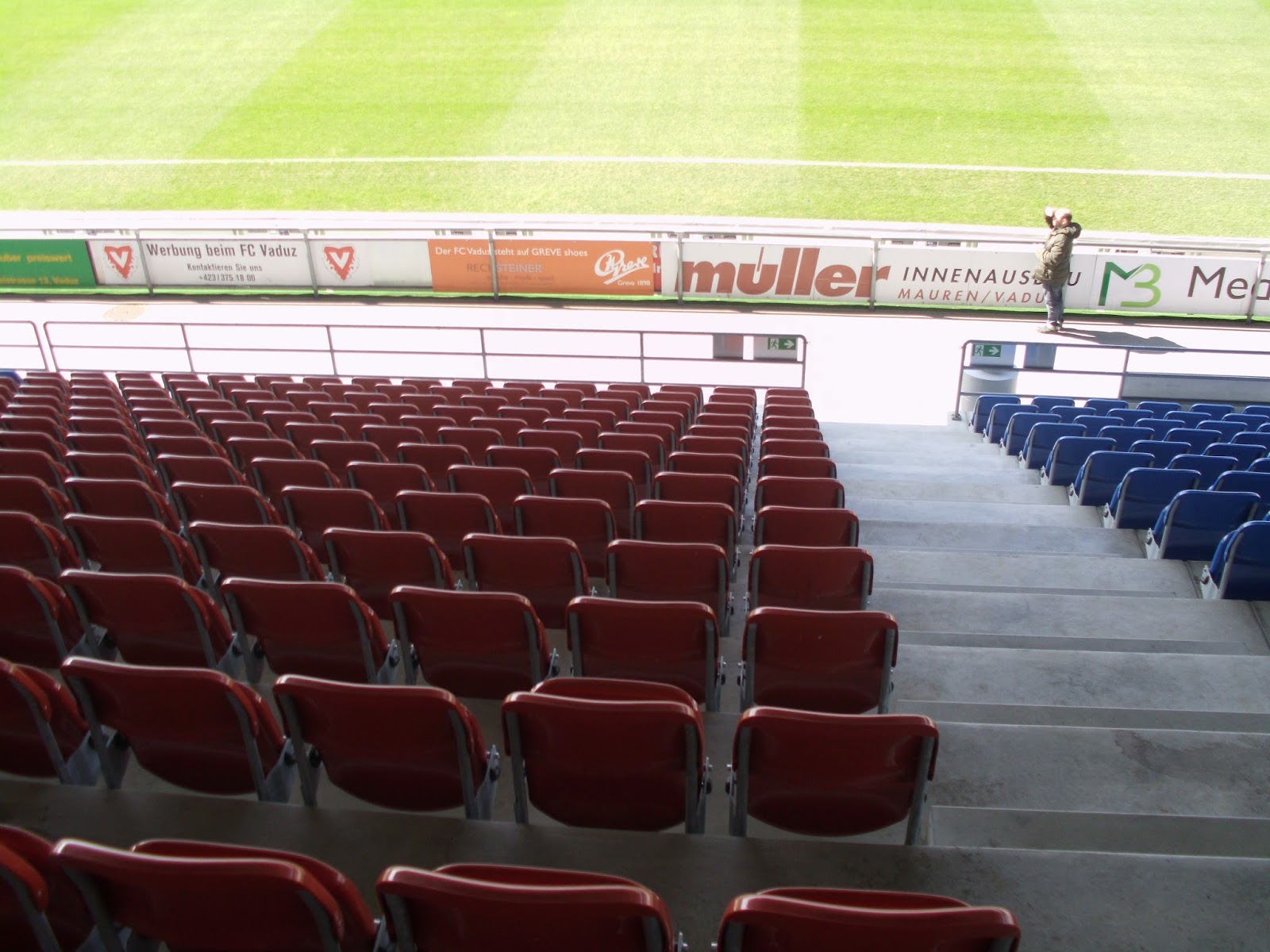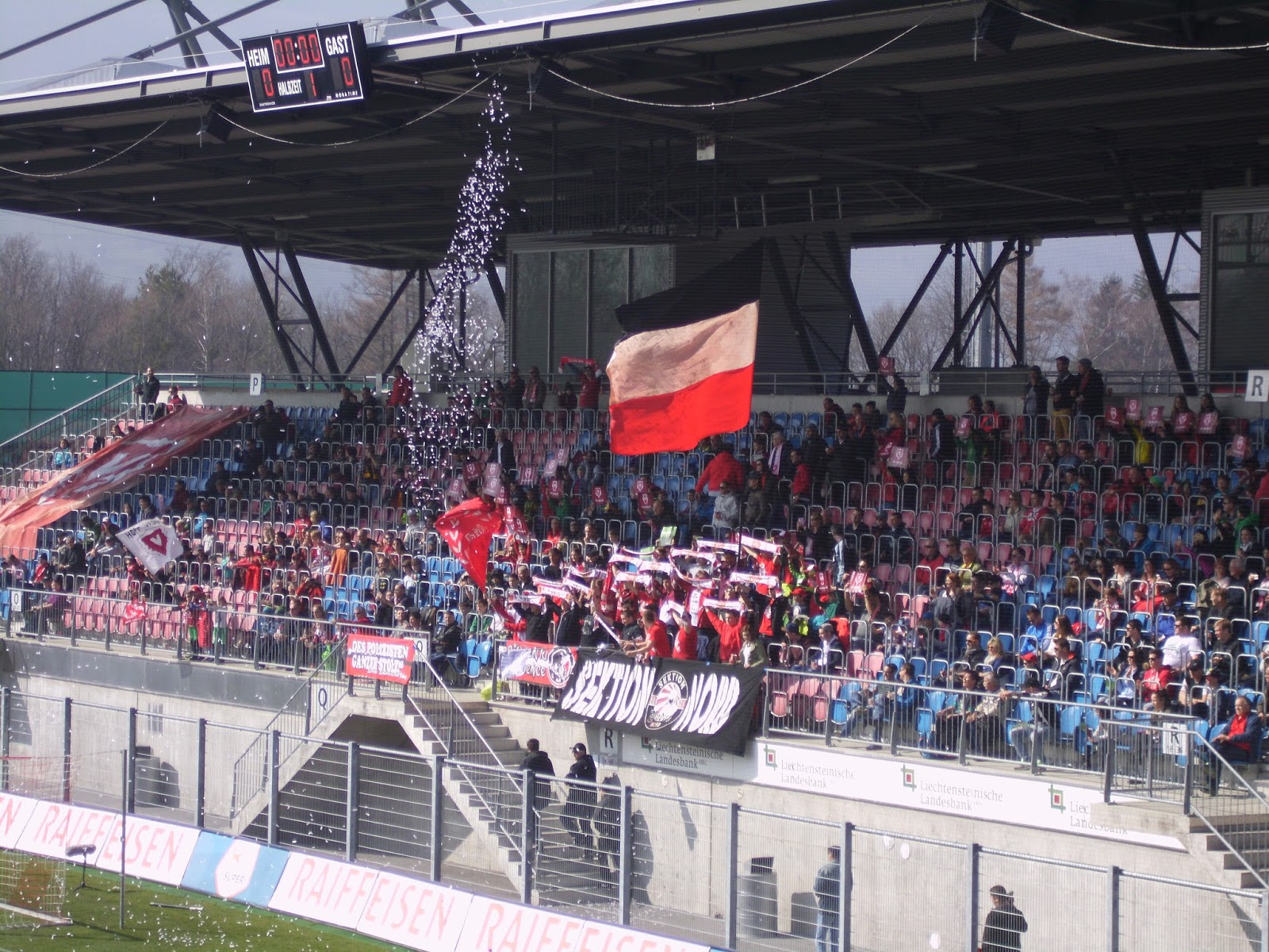 Das Stadion befindet sich etwas abseits des Vaduzer Stadtzentrums, dem Namen entsprechend direkt am Rhein. Die vier Tribünen sind für ein Kleinstadion durchwegs okay, wenn auch nicht gerade stimmungsfördernd weit auseinandergebaut. Wenn, dann sorgen aber wohl meist eh eher die Gästefans dafür, wie heute die sicher knapp über 1.500 Züricher. Der fürstentümliche Fansektor ist nämlich höchstens als bemüht zu bezeichnen, auch wenn er mit dem Transparent „Des Polizisten ganzer Stolz“ durchaus Ironiepunkte abstauben kann.
