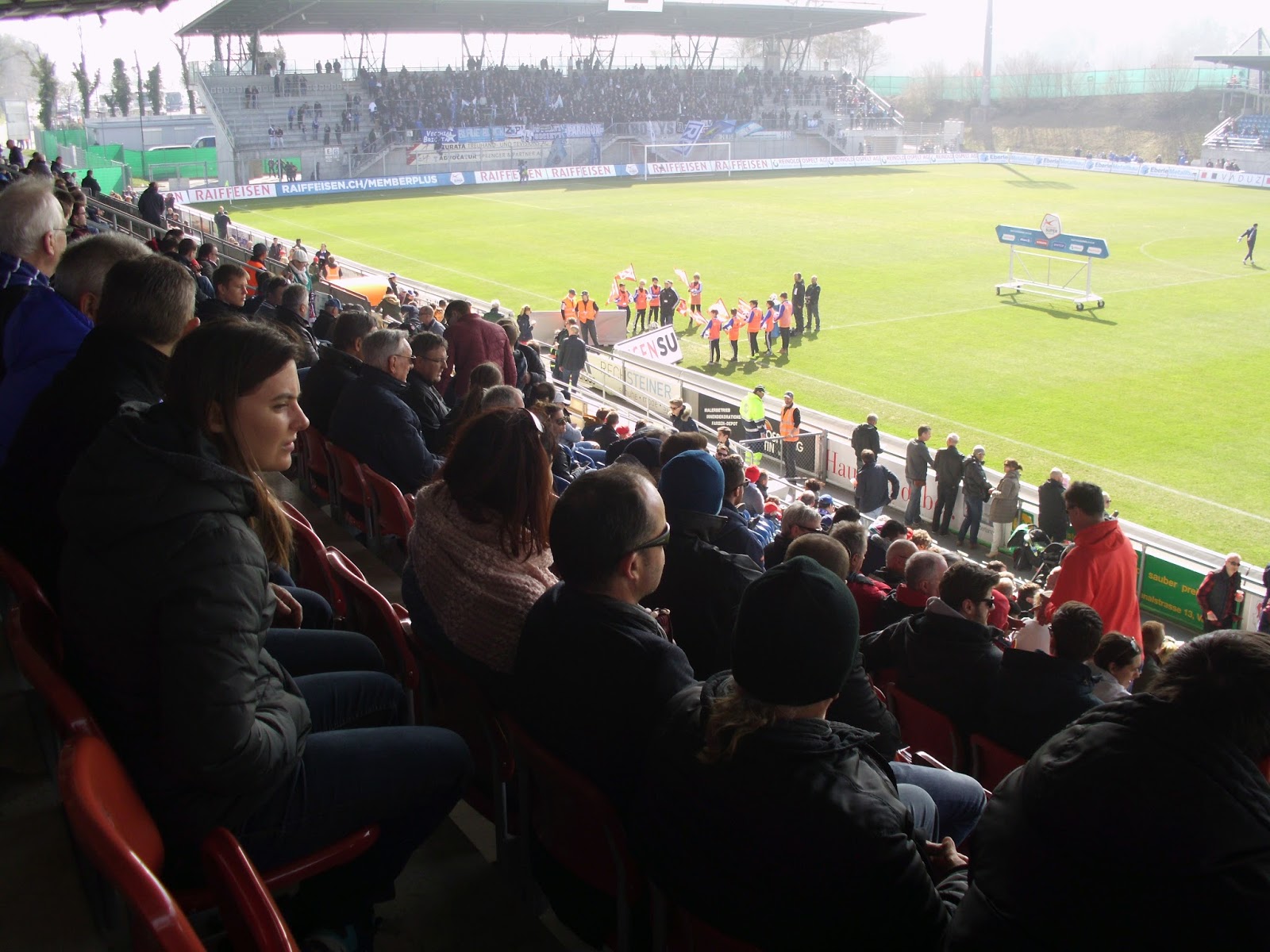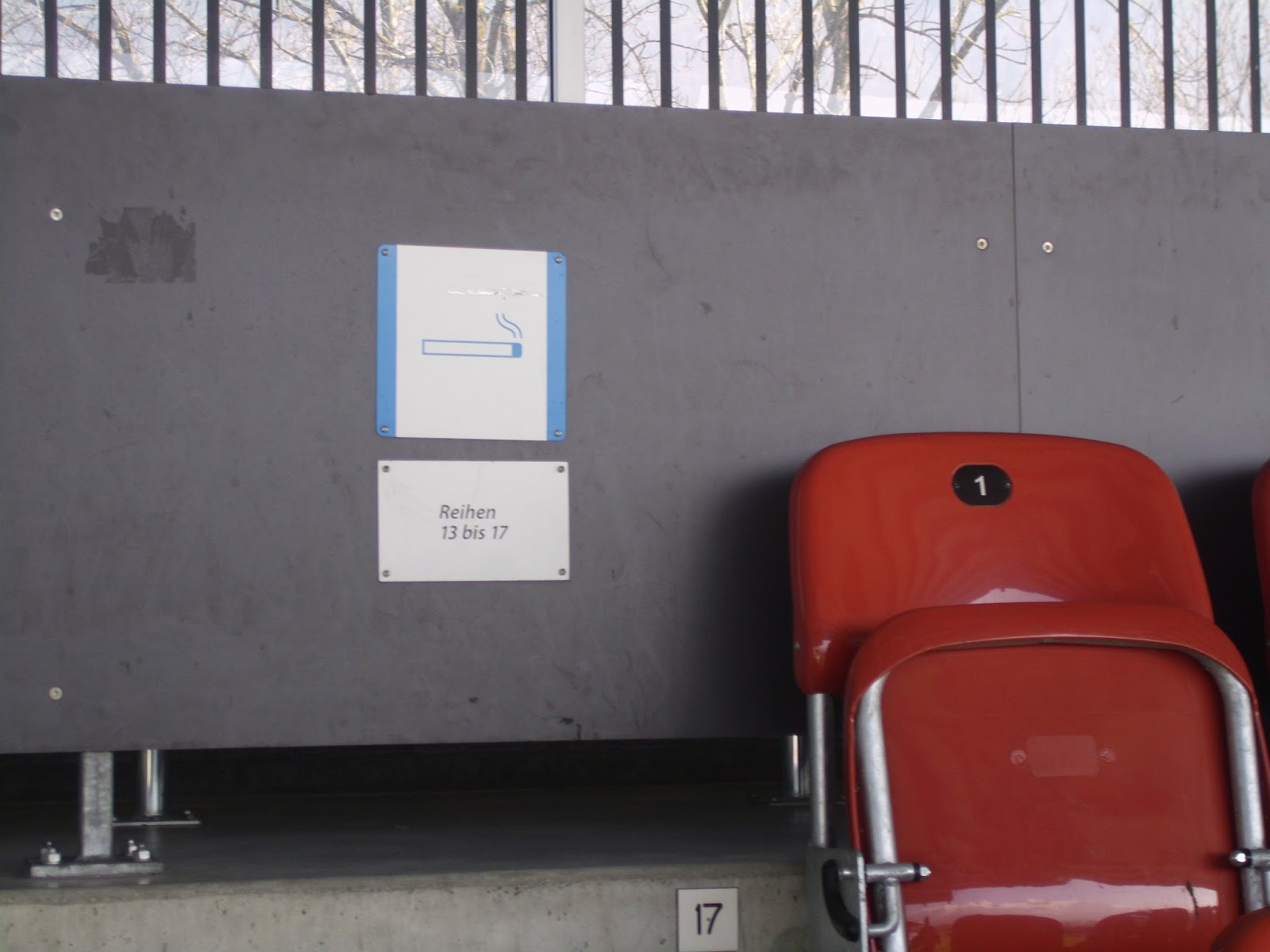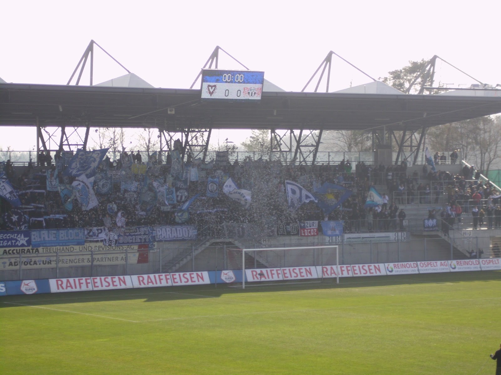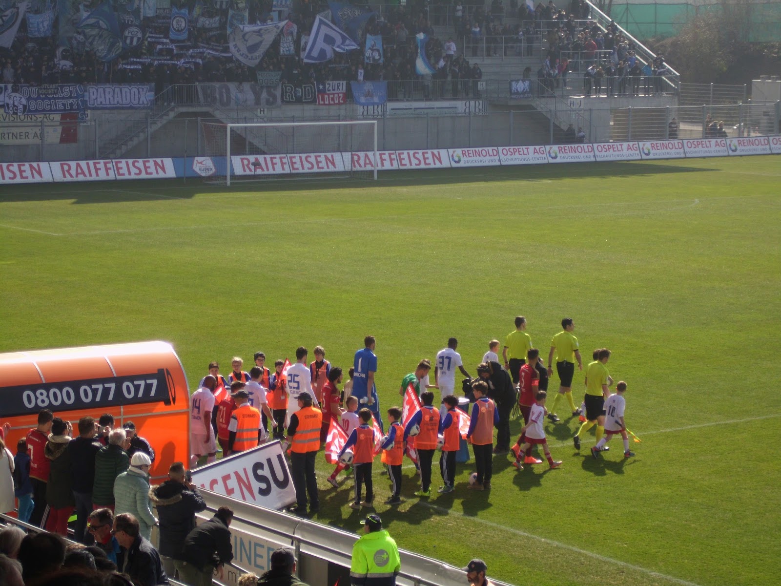 Das Stadion befindet sich etwas abseits des Vaduzer Stadtzentrums, dem Namen entsprechend direkt am Rhein. Die vier Tribünen sind für ein Kleinstadion durchwegs okay, wenn auch nicht gerade stimmungsfördernd weit auseinandergebaut. Wenn, dann sorgen aber wohl meist eh eher die Gästefans dafür, wie heute die sicher knapp über 1.500 Züricher. Der fürstentümliche Fansektor ist nämlich höchstens als bemüht zu bezeichnen, auch wenn er mit dem Transparent „Des Polizisten ganzer Stolz“ durchaus Ironiepunkte abstauben kann.