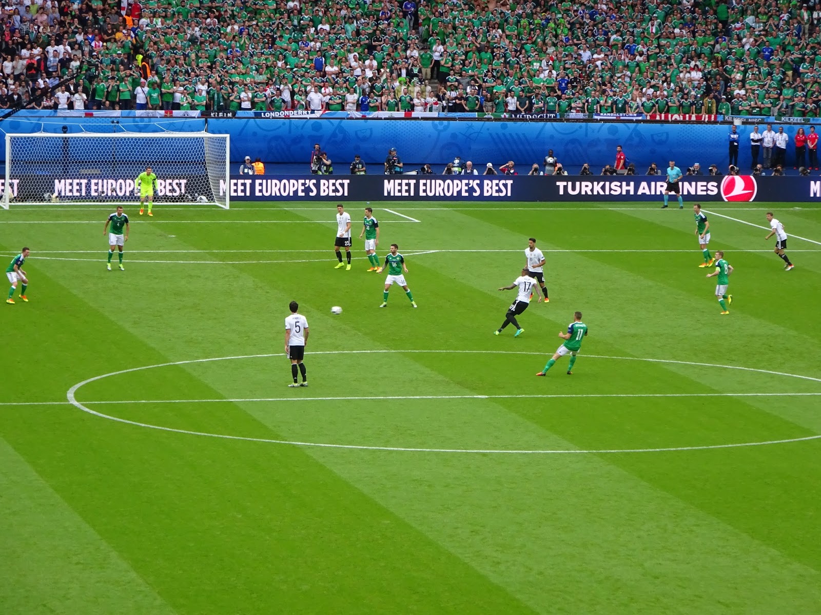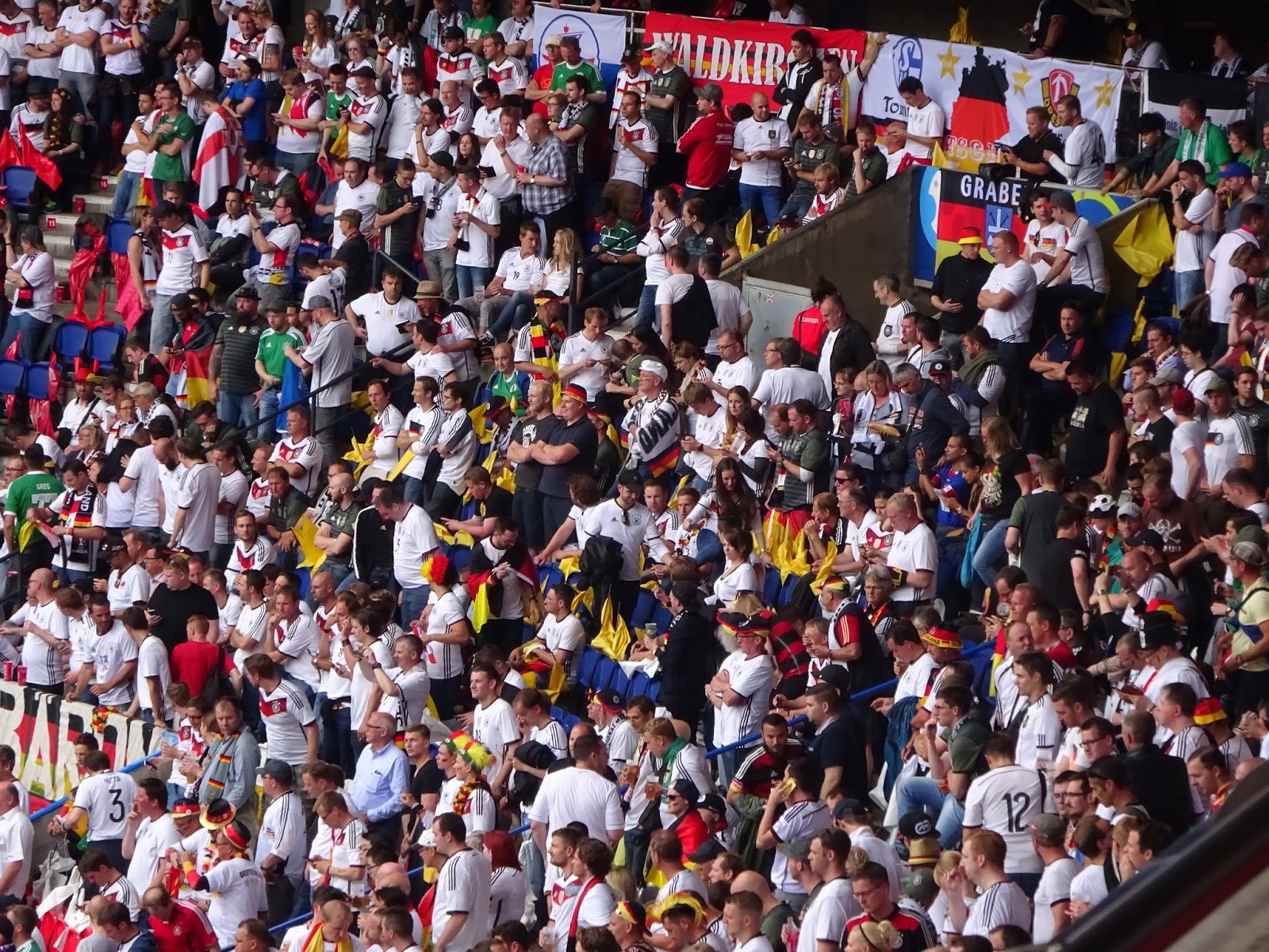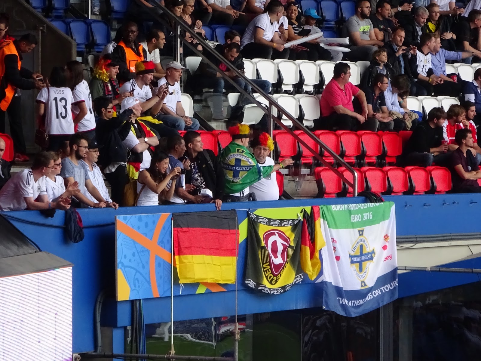 Für das Stadion muss man dann halt auch mal einen Platz neben dem deutschen Sektor ertragen. Zwar habe ich so freie Sicht auf den beeindruckenden nordirischen Sektor, der de facto 90 Minuten Stimmung macht (mit dem Dauerbrenner „Will Grigg’s on fire“, mit dem immerhin ein Spieler, der es in der Gruppenphase auf exakt 0 Einsatzminuten gebracht hat, besungen wird), die Trommeln des Weltmeisters nerven aber nicht nur den bald neben mich flüchtenden Englandfan („Fucking german drums, puhhh“) auf Dauer. Allzu laut beschweren darf man sich über Stimmung im deutschen Sektor allerdings bestimmt auch nicht. Zwar haben sie – nur unwesentlich schwächer ausgeprägt als bei Österreich – das Problem von nur wenigen und wenig melodischen Gesängen, diese kommen aber immer wieder mit durchaus beeindruckender Lautstärke. Den direkt aus den Pubs der britischen Inseln gefallenen Gästefans können sie aber mit Sicherheit nicht das Wasser reichen.