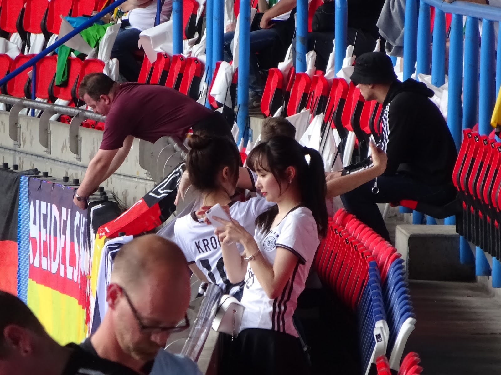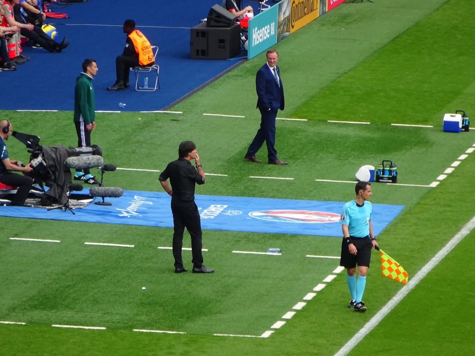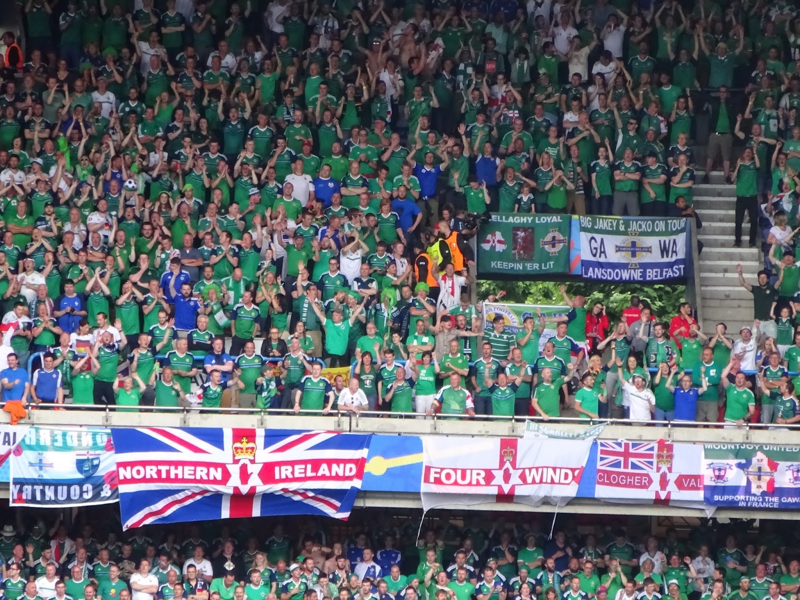 Für das Stadion muss man dann halt auch mal einen Platz neben dem deutschen Sektor ertragen. Zwar habe ich so freie Sicht auf den beeindruckenden nordirischen Sektor, der de facto 90 Minuten Stimmung macht (mit dem Dauerbrenner „Will Grigg’s on fire“, mit dem immerhin ein Spieler, der es in der Gruppenphase auf exakt 0 Einsatzminuten gebracht hat, besungen wird), die Trommeln des Weltmeisters nerven aber nicht nur den bald neben mich flüchtenden Englandfan („Fucking german drums, puhhh“) auf Dauer. Allzu laut beschweren darf man sich über Stimmung im deutschen Sektor allerdings bestimmt auch nicht. Zwar haben sie – nur unwesentlich schwächer ausgeprägt als bei Österreich – das Problem von nur wenigen und wenig melodischen Gesängen, diese kommen aber immer wieder mit durchaus beeindruckender Lautstärke. Den direkt aus den Pubs der britischen Inseln gefallenen Gästefans können sie aber mit Sicherheit nicht das Wasser reichen.