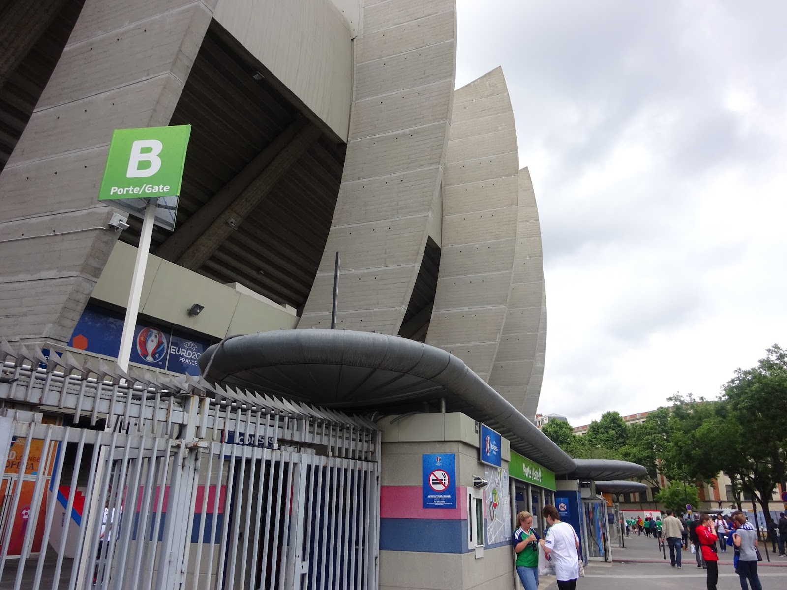 Den Quartierstress erstmal hinter mich gebracht, bleibt keine Zeit mehr für eventuelles Sightseeing, daher begebe ich mich gleich in die Nähe des Prinzenparkstadions, bei dem sich vor allem die nordirischen Fans bereits fleißig einsingen, und – wo geht – mit den deutschen Schlachtenbummlern verbrüdern. Getoppt wird diese Stimmung dann nur mehr im Stadion selbst. Das Prinzenpark ist eine in relativ dicht besiedeltem Gebiet liegende Betonschüssel, deren Außenpfeiler zwar für etwas Charme sorgen, besonders aufreizend ist es nun aber auch wieder nicht. Innen weiß es dagegen weit mehr zu gefallen, die bis zu vier Ränge ragen doch sehr steil und eng nach oben. Die Sitzschalen bilden zweifach das Emblem von Paris St. Germain, das hier seine Heimspiele austrägt.