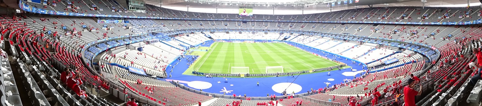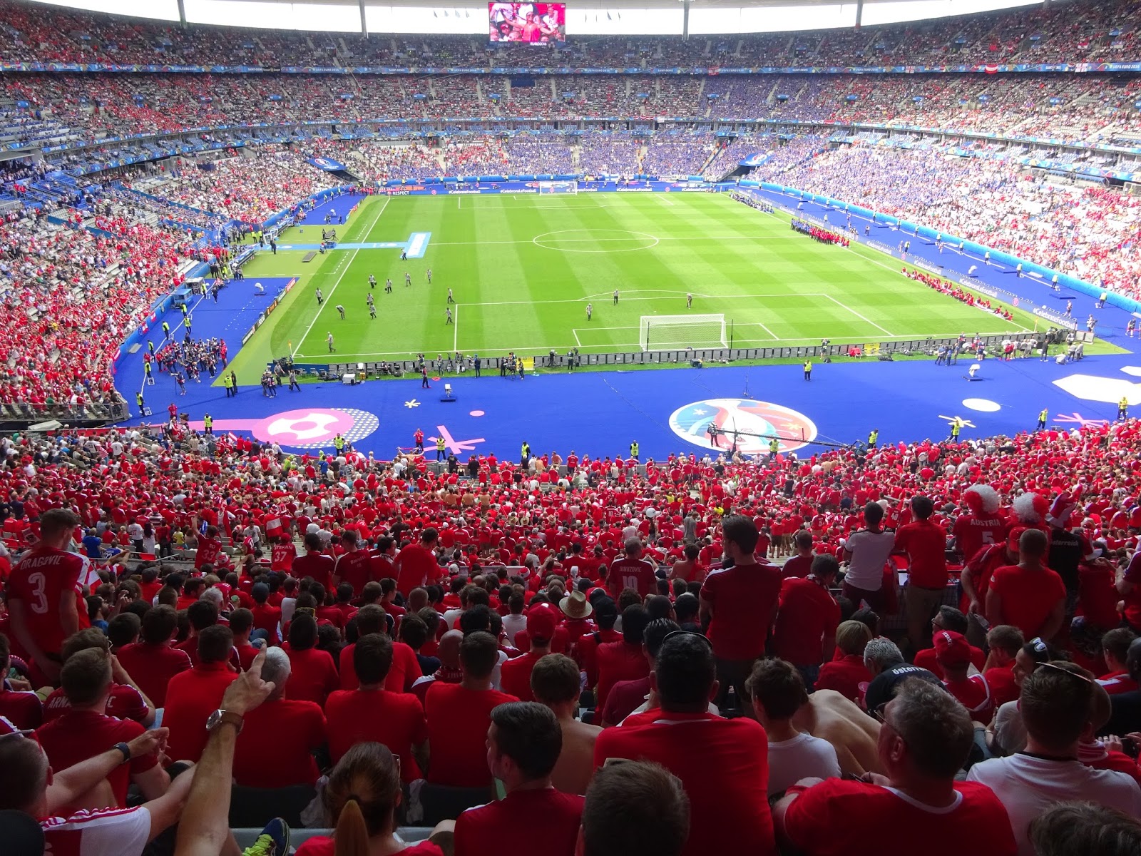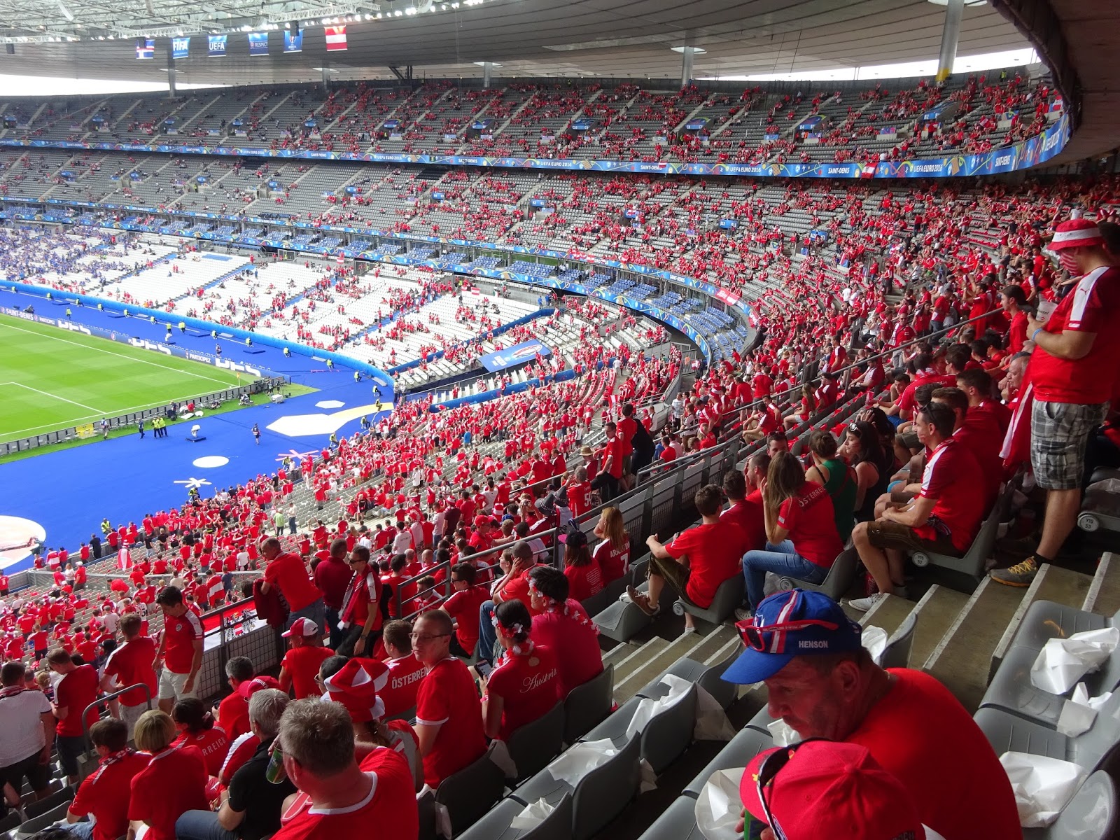 Das Stade de France liegt mitten in einer Neubaugegend, außer Büros ist hier nicht sehr viel, die meisten Fresshütten müssen bei Großveranstaltungen – wie eben der EURO – extra aufgebaut werden, weil ein durchgängiger Betrieb wohl schlicht nicht rentabel wäre. Die Anreise-, aber auch Abreisewege sind bestenfalls suboptimal, für ein sehr neues Stadion jedenfalls überraschend schlecht durchdacht. Das Stadion selbst wirkt allerdings durchaus imposant und ist auf schnelle Aufnahme und Abfertigung von bis zu 80.000 Zuschauern ausgelegt. Warum auf dem Weg zu den Öffis dann teils künstliche Nadelöhre geschaffen werden, erschließt sich mir überhaupt nicht.