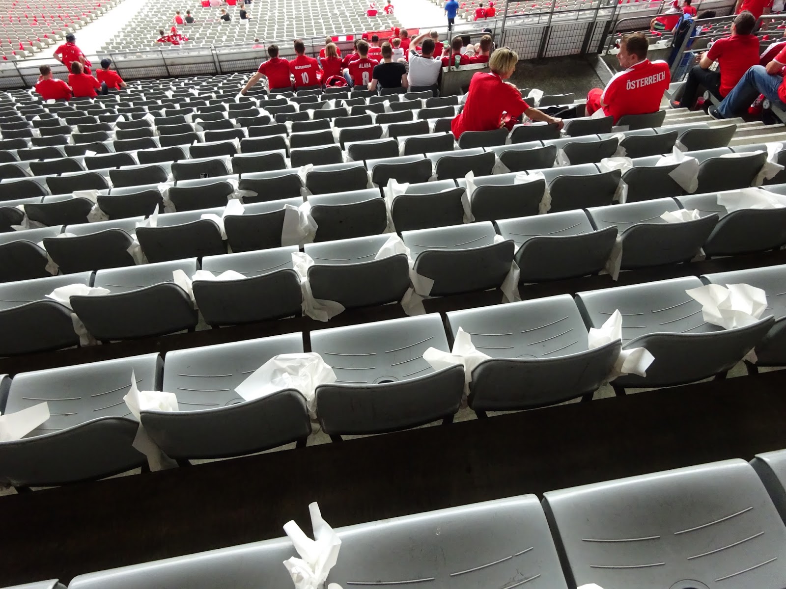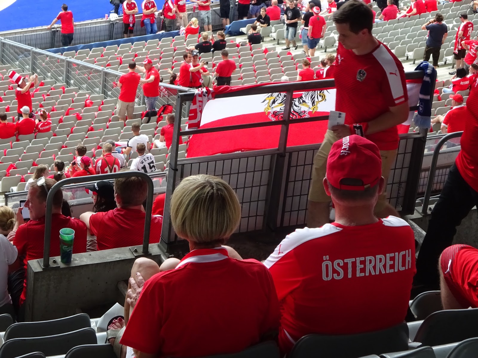 Im Inneren spannen sich drei Ränge rund um das Feld, das Dach ist etwas erhöht aufgesetzt, auch hier durchaus beeindruckend. Schon früh füllt sich der österreichische, aber auch der gegnerische Sektor, die „roten Flecken“ – gerade auch auf den Geraden – wachsen dabei immer mehr an. Die offizielle Verteilung von 30.000 österreichischem zu 20.000 isländischen Fans ziehe ich jedenfalls eindeutig in Zweifel, und halte ein Verhältnis von 40.000:10.000 (bis vielleicht 15.000) für wahrscheinlicher.