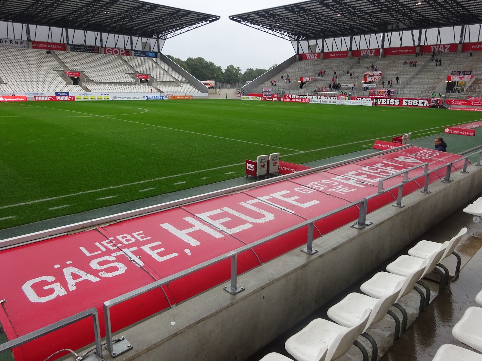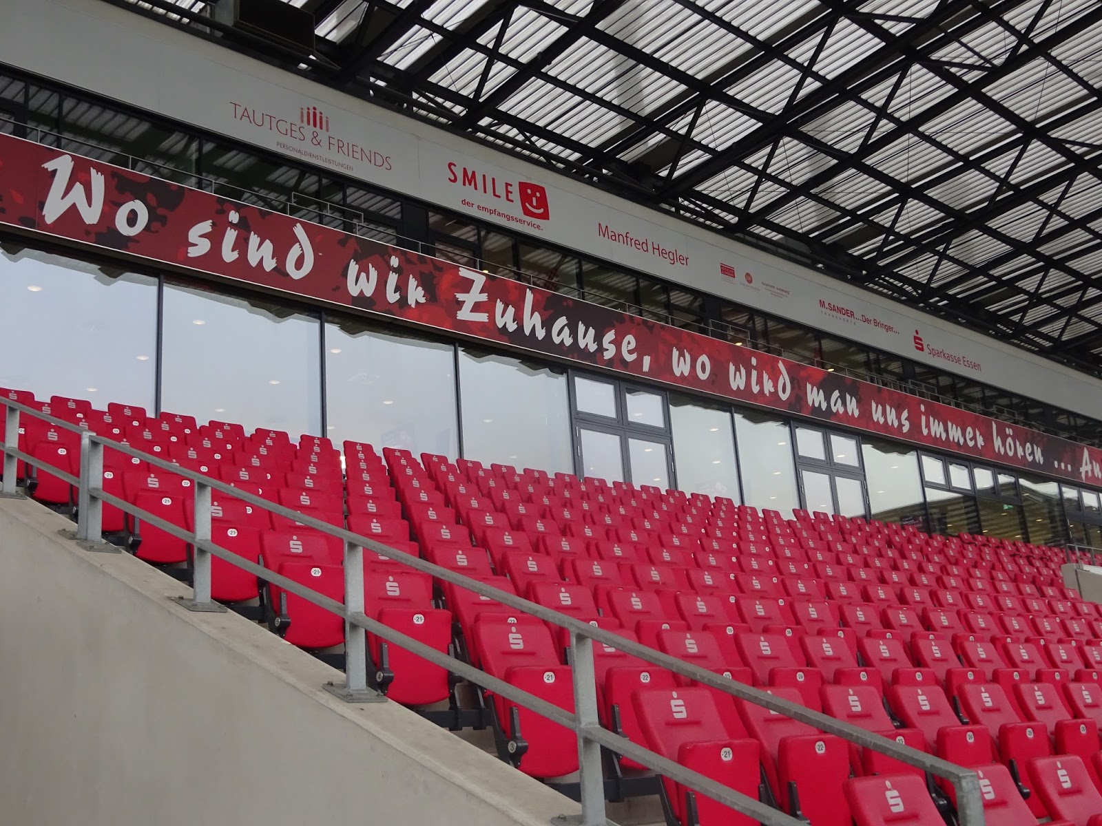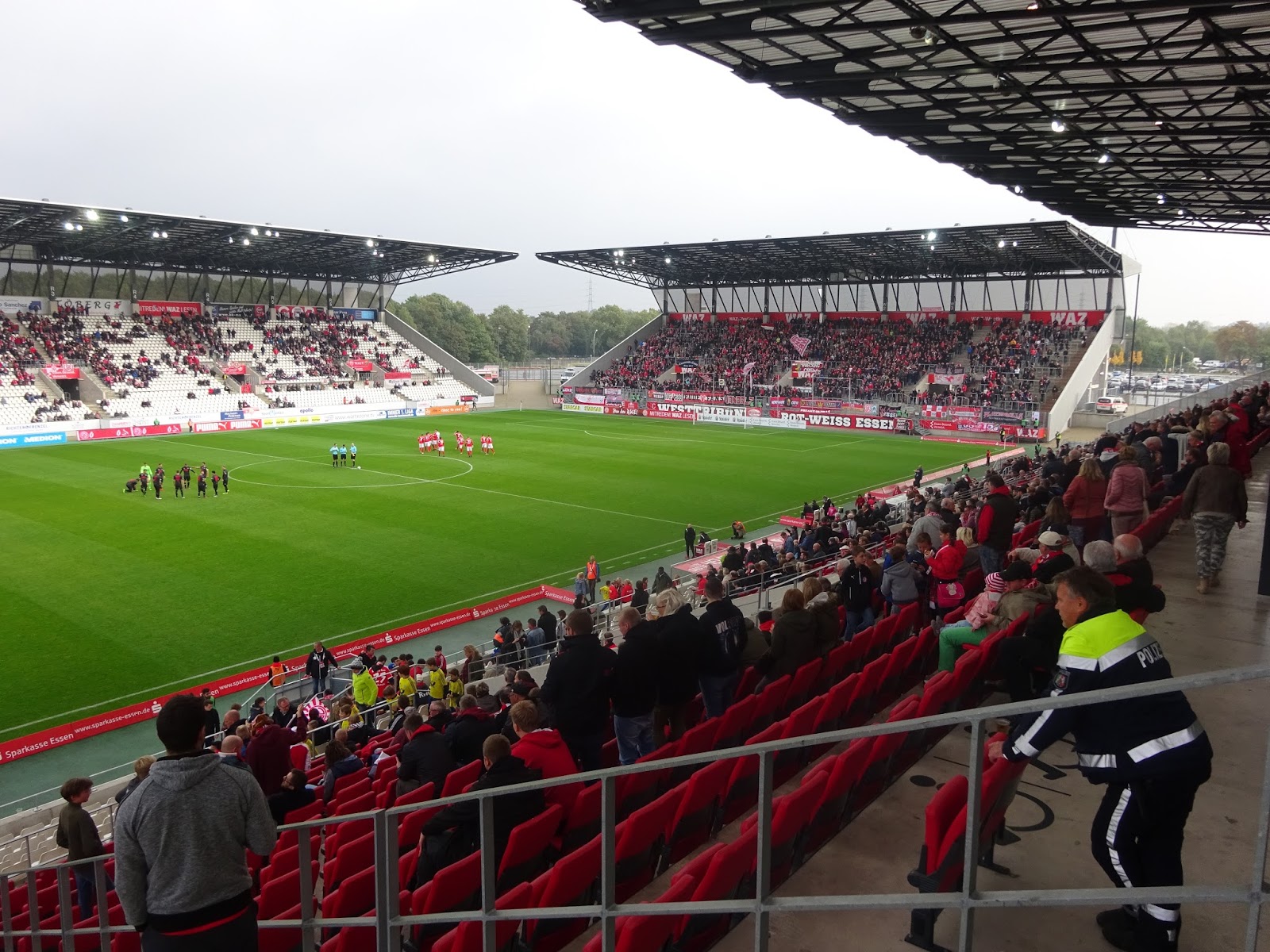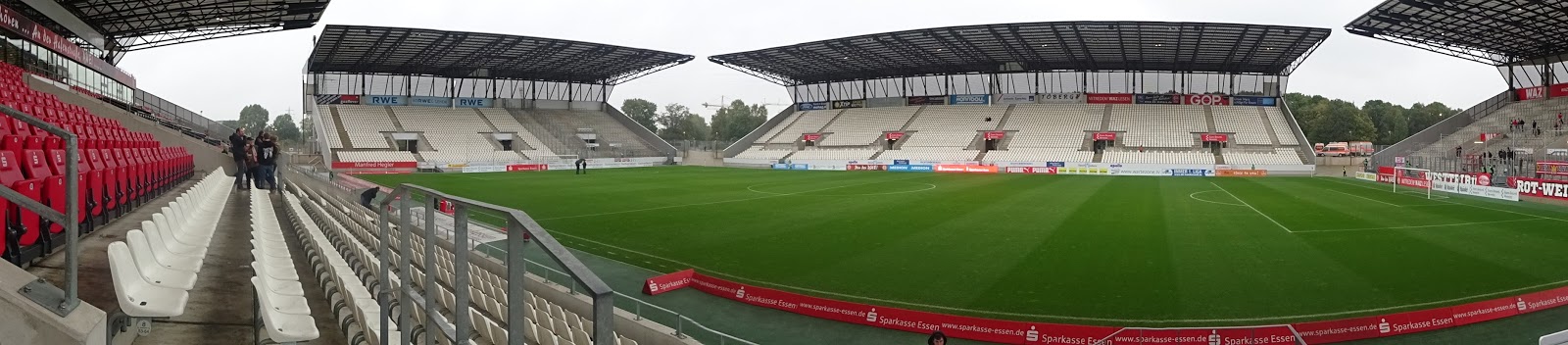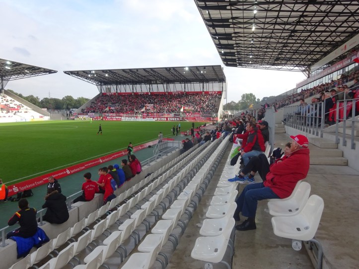 Das neu gebaute Stadion an der Hafenstrasse besteht aus vier separat stehenden Tribünen, vom altehrwürdigen Georg-Melches-Stadion blieb neben einer Gedenkstelle nur ein einsamer Flutlichtmasten an einer der Ecken. Der auch an anderen Problemen leidende Neubau verfügt aber überraschenderweise auf keiner der Seiten über eine Anzeigentafel, der Spielstand wird lediglich über einige der Werbebanden eingeblendet. Trotz Regionalliga, also vierter Spielklasse, lässt man sich die Tradition hier einiges kosten: Mit 28 Euro für einen Sitzplatz schlägt dies schon ganz ordentlich an…