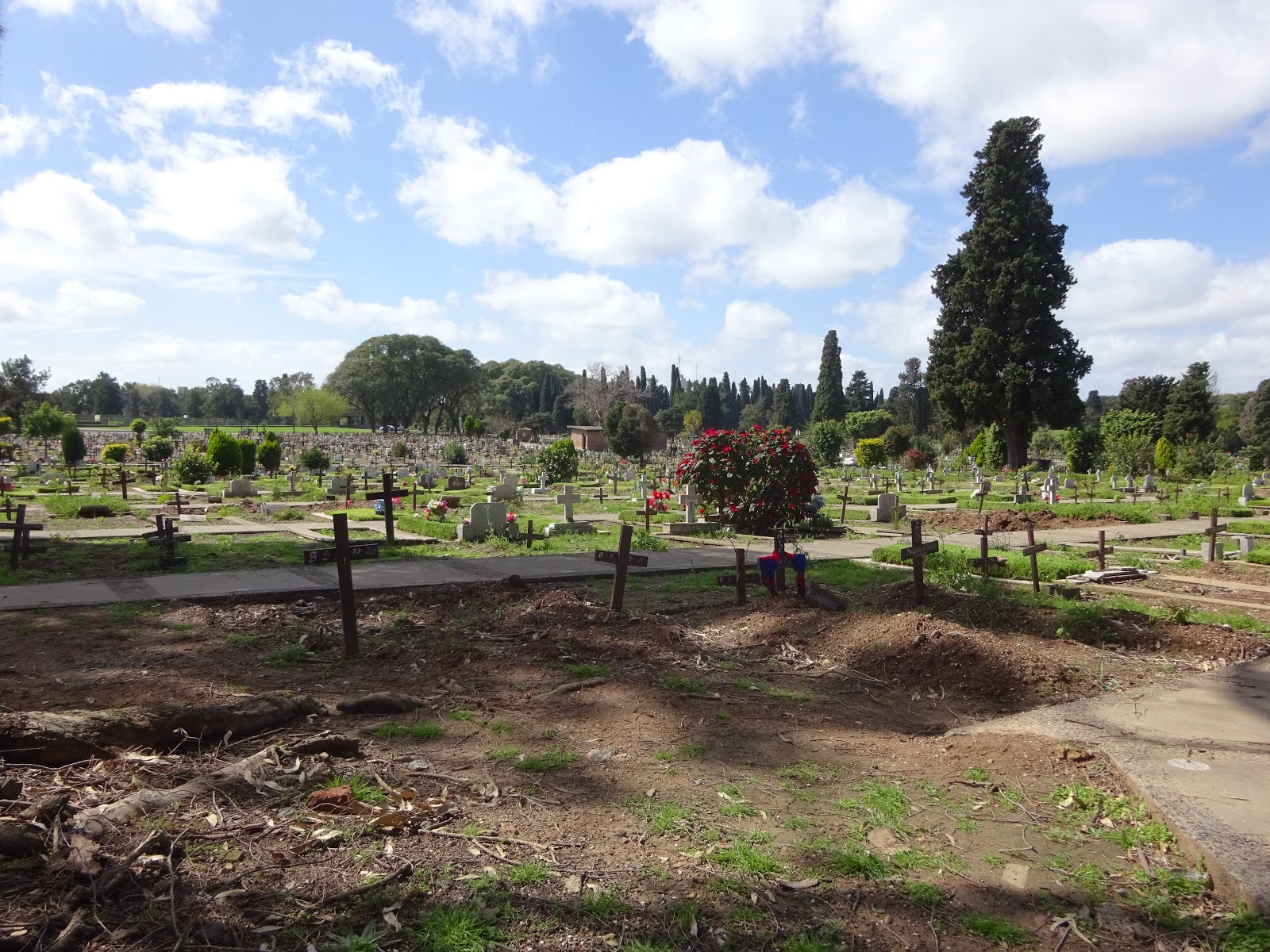Das Thema Tod hat mich allerdings auch bereits am Tag verfolgt, immerhin ging es da auf den, dem Stadion nahegelegenen argentinischen Nationalfriedhof Cementario de la Chacarita, der 1871 nach einer verheerenden Gelbfieberepidemie in der Stadt errichtet wurde. Er beeindruckt schon allein von der Größe der Anlage, aber auch durch seine unter- und überirdischen Urnenhaine und die zahlreichen Mausoleen, die ihn zu einer gewaltigen Stadt der Toten werden lassen. Und auch hier darf der Bezug zum Fußball nicht fehlen, sind doch an zahlreichen Gräbern Hinweise auf diverse Vereine zu finden – bis hin zu Schals auf einfachen Kreuzen.