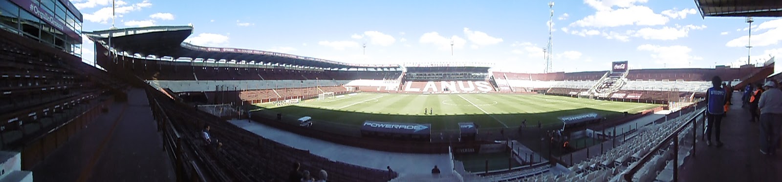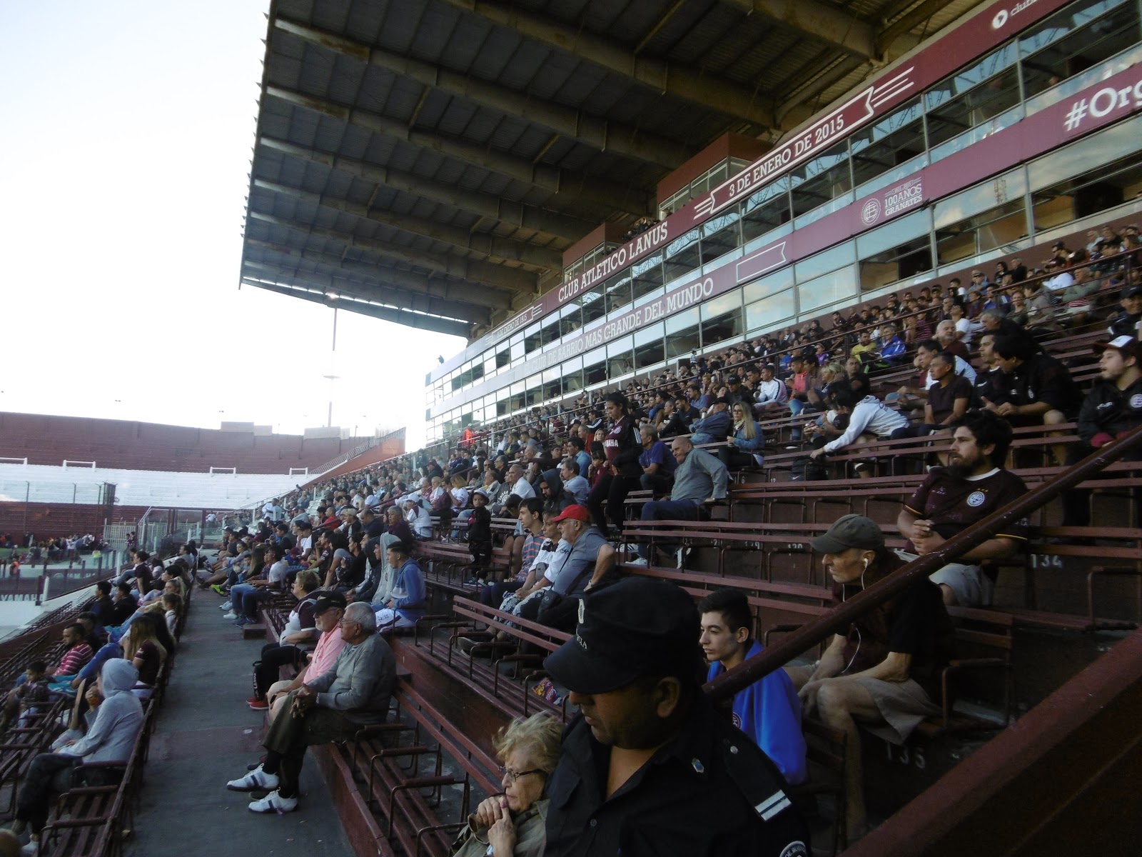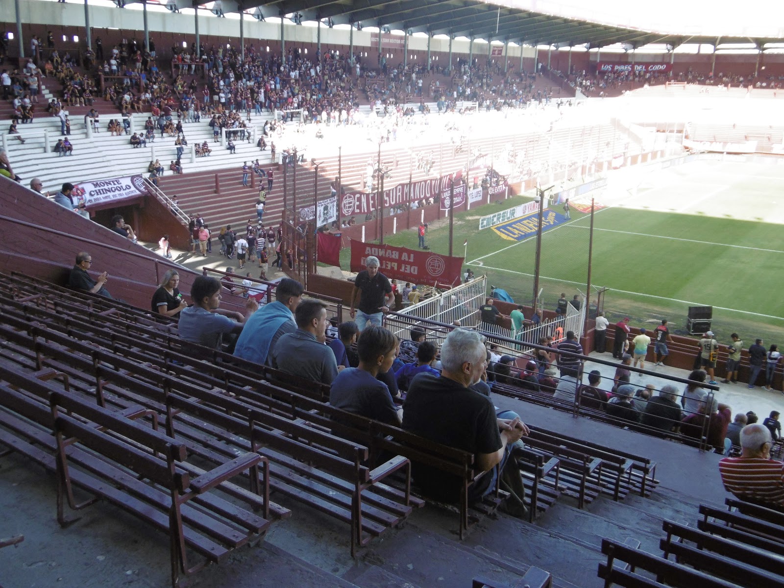 Das Estadio Perez verfügt über eine große Haupttribüne mit Sitz- und sonst lediglich Stehplätzen, selbst auf der Gegengeraden. Die Ränge sind dabei ganz in den Vereinsfarben Granatrot und Weiß gehalten. So richtig füllen wollen sie sich aber an diesem Tag nicht, obwohl die Anpfiffzeit mit 17 Uhr ja eigentlich ziemlich perfekt ist. Die offenbar an der Perfektion kratzende Akkustik lässt aber selbst die wenigen Zuschauer zwischenzeitlich durchaus laut werden.
