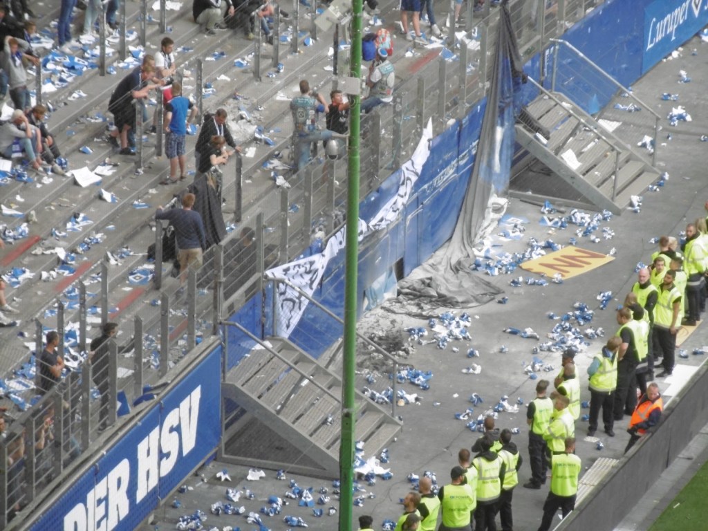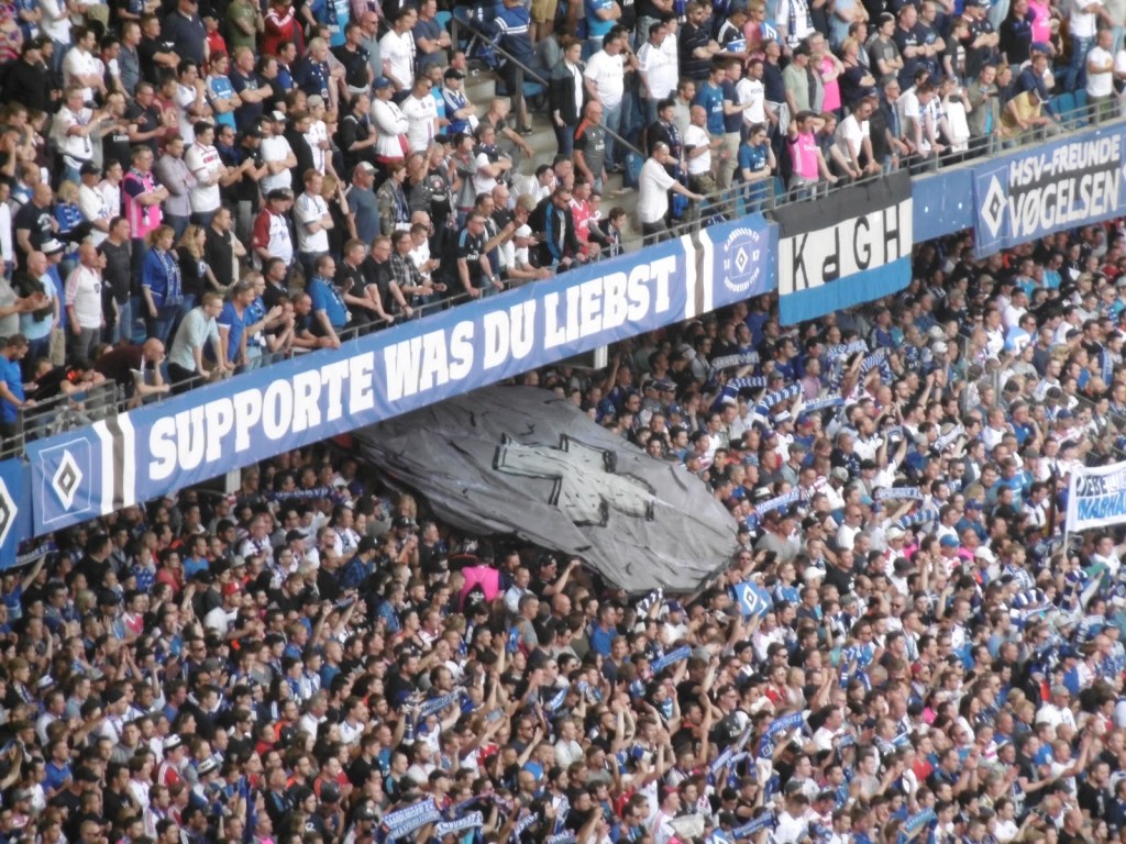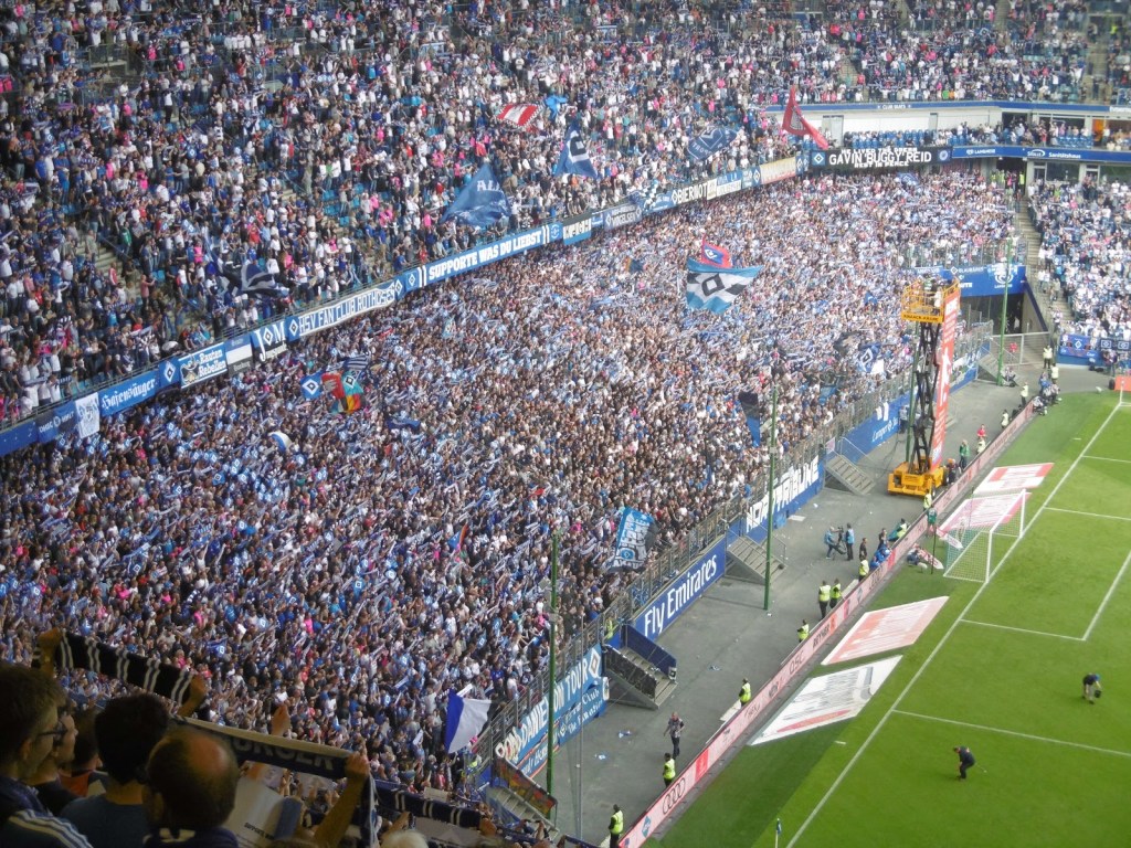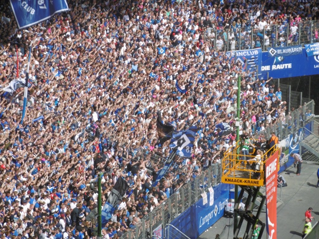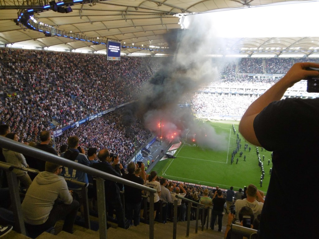 Sehr früh sammeln sich bereits Fans vor den Eingangstoren, die Stimmung ist überraschend entspannt. Nach den jahrelangen Rettungen in letzter Minute ist ein Abstieg für viele, wenn schon nicht erwünscht, dann offenbar zumindest nicht mehr das unglaublich große Drama (O-Ton eines Fans nach dem Spiel: „Dann spielen wir halt nächstes Jahr einmal in Aue, du meine Güte“). Sportlich gute Leistungen in den letzten acht Partien haben überhaupt erst dazu geführt, dass es am 34. Spieltag noch eine Chance auf Relegation gibt. Lange Zeit überwiegt daher im Stadion das Nachvornepeitschen einer durchaus ansehnlich kämpfenden HSV-Mannschaft. Überragend ist die Stimmung allerdings nicht wirklich. Auch die Choreographie mit 50.000 HSV-Rauten zu Beginn wirkt eher bemüht als besonders spektakulär.