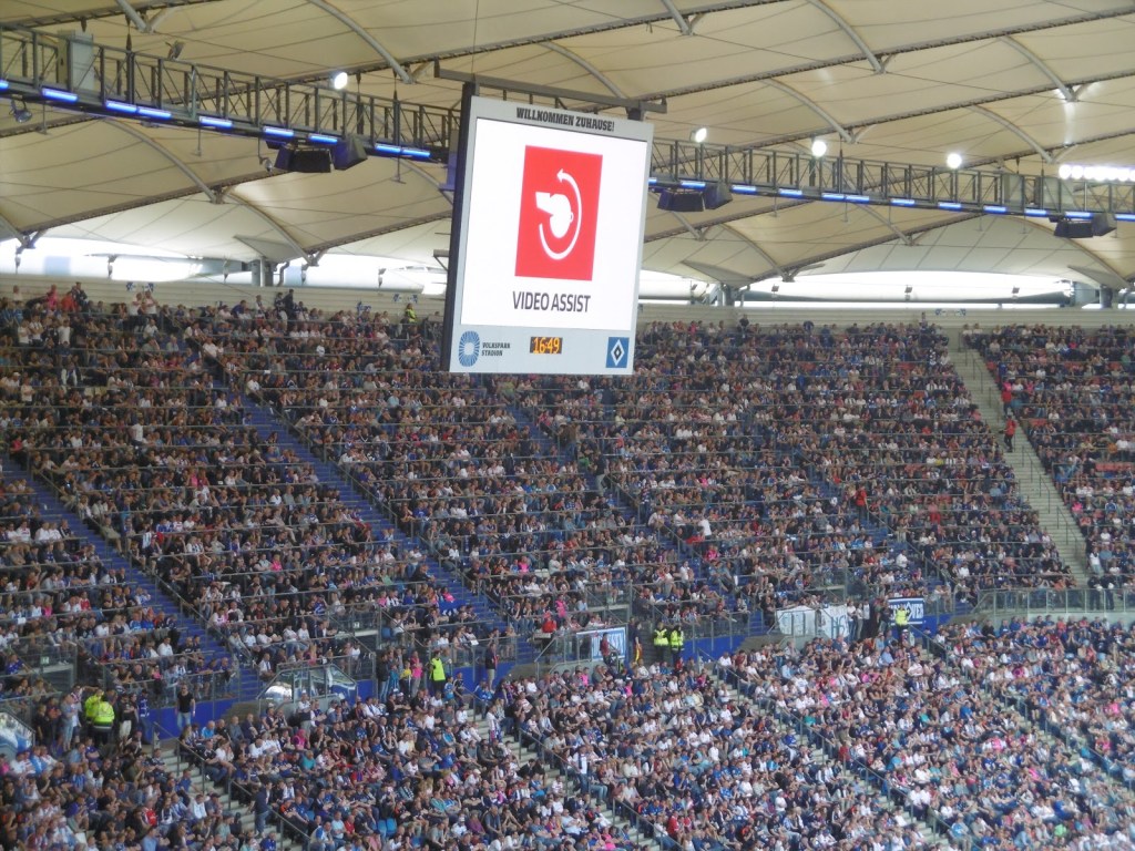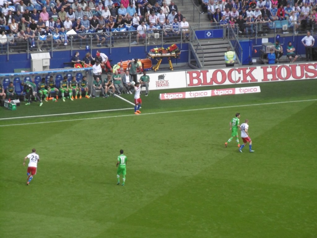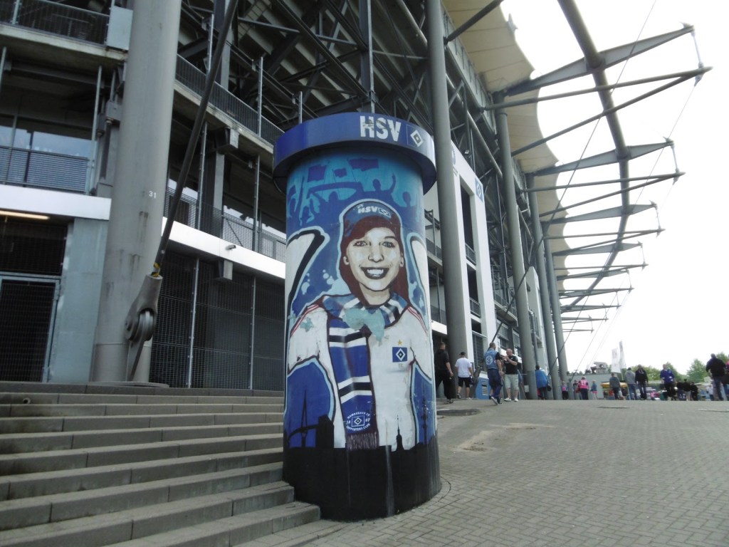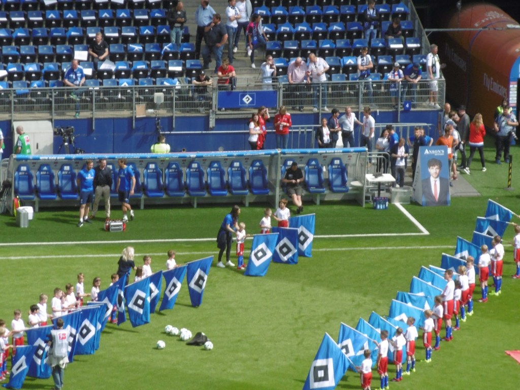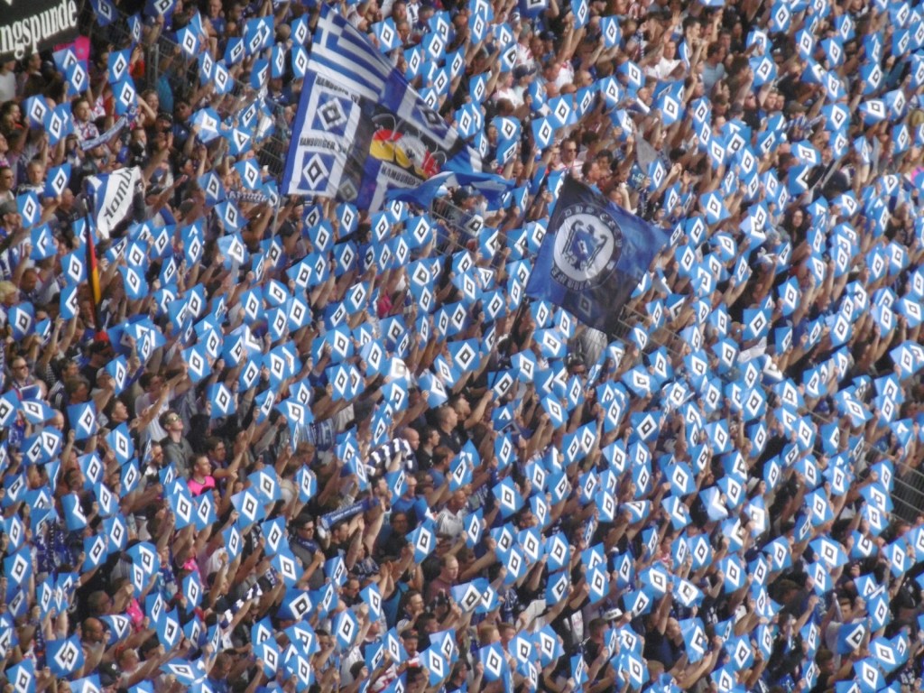Sehr früh sammeln sich bereits Fans vor den Eingangstoren, die Stimmung ist überraschend entspannt. Nach den jahrelangen Rettungen in letzter Minute ist ein Abstieg für viele, wenn schon nicht erwünscht, dann offenbar zumindest nicht mehr das unglaublich große Drama (O-Ton eines Fans nach dem Spiel: „Dann spielen wir halt nächstes Jahr einmal in Aue, du meine Güte“). Sportlich gute Leistungen in den letzten acht Partien haben überhaupt erst dazu geführt, dass es am 34. Spieltag noch eine Chance auf Relegation gibt. Lange Zeit überwiegt daher im Stadion das Nachvornepeitschen einer durchaus ansehnlich kämpfenden HSV-Mannschaft. Überragend ist die Stimmung allerdings nicht wirklich. Auch die Choreographie mit 50.000 HSV-Rauten zu Beginn wirkt eher bemüht als besonders spektakulär.