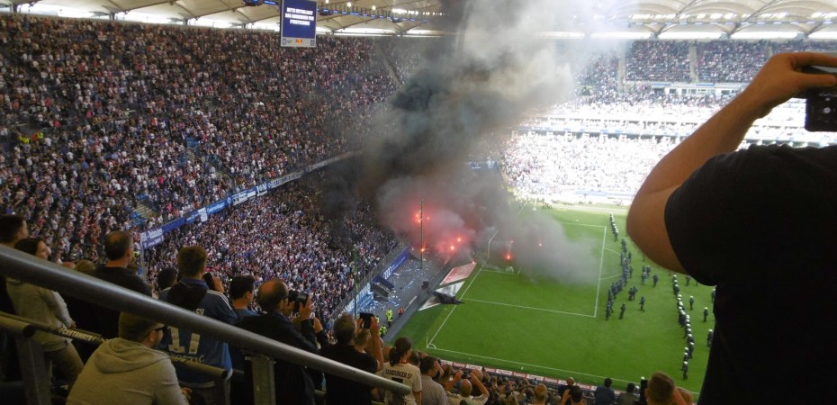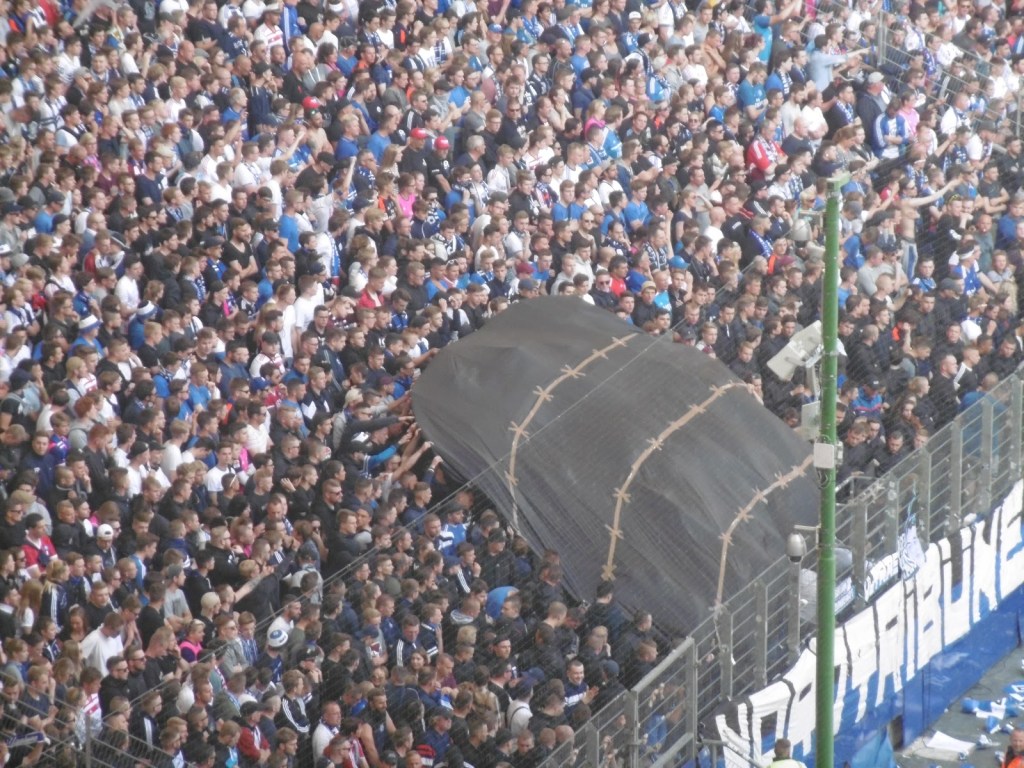Bereits länger war absehbar, dass sich im Fanblock der Hamburger einiges zusammenbraut. In den vorderen Reihen werden die Vereinsfarben zusehend abgelegt und immer mehr Menschen tragen offenbar nur mehr Schwarz. Kurz wird von den oberen Stehrängen eine Überollfahne in Form eines Sarges nach unten gezogen, diese verschwindet dann aber bald wieder. Fast gleichzeitig wird allerdings ein schwarzes Transparent mit goldenen (Stacheldraht?)-Linien zum Sichtschutz vorgezogen und über rund 100 Fans gehalten. Von dieser Stelle aus wird kurz vor der 90. Minute die Doppelreihe Ordner vor dem Sektor mit Rauchbomben, Bengalos und Leuchtraketen angegriffen.