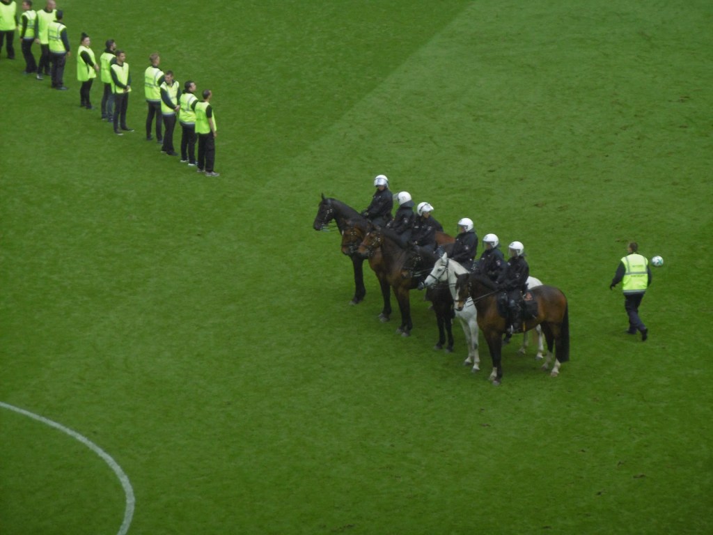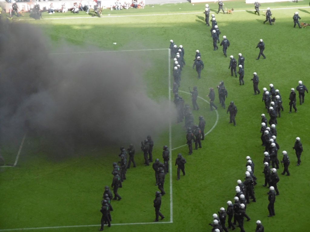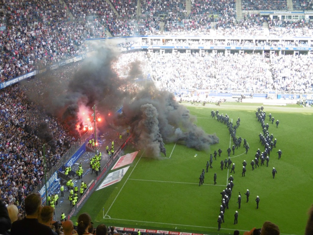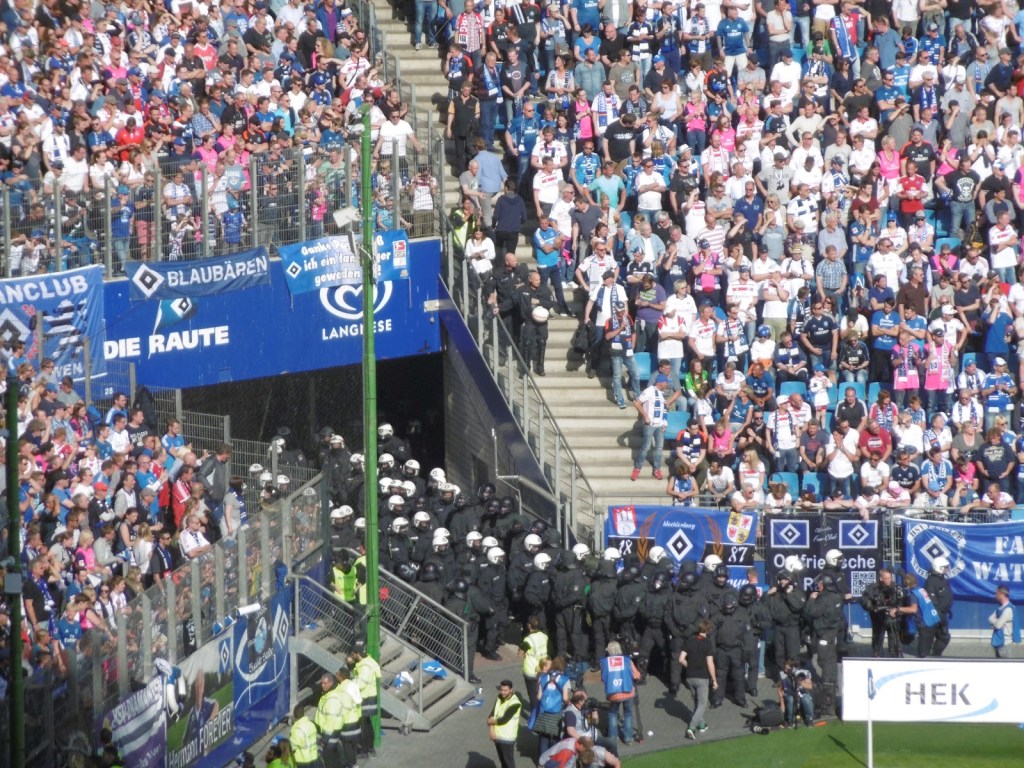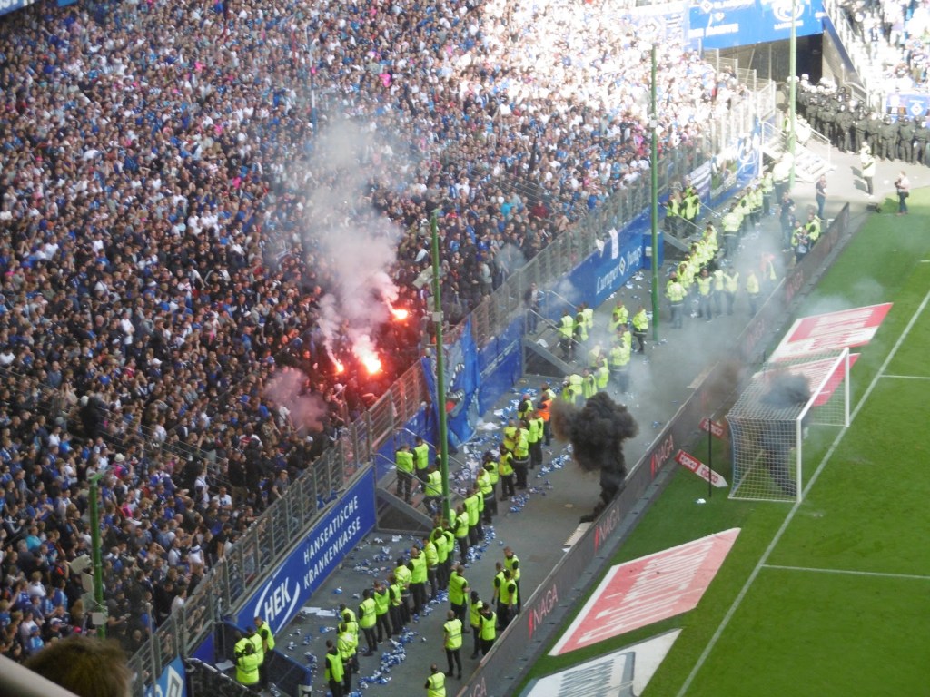Innerhalb weniger Sekunden ist das Spielfeld nicht nur in Rauch gehüllt, sondern auch voller Polizei, welche den zurückweichenden Securities zur Hilfe eilt, auch wenn es eigentlich nie wirklich nach einem drohenden Platzsturm aussieht. Im gegnerischen Strafraum werden sogar berittene Polizisten platziert. Relativ rasch zeigt das restliche Publikum seinen Unmut über die Spielunterbrechung und die Ereignisse im Fansektor. „Wir sind Hamburg und ihr nicht“ und „Holt sie raus“ als Aufforderung an die Polizei, den Sektor zu stürmen wechseln sich mit Pfiffen und dann auch angestimmten Positiv-Sprechchören ab. Große Teile der Fantribüne beteiligen sich ebenfalls an den Gesängen bzw. starten diese sogar.
