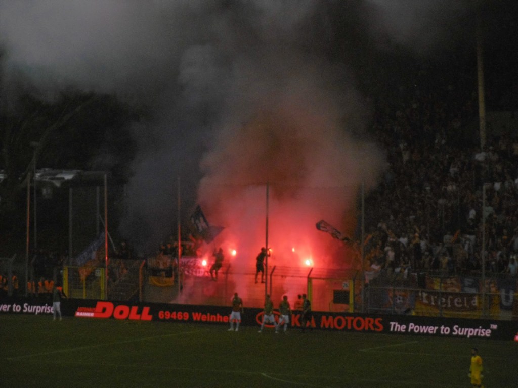Dass das Spiel eher nicht regulär zuendegebracht werden wird, zeichnet sich eigentlich ebenso früh ab. Zuerst gibt es einige Schlägereien auf der Gästetribüne, wo auch rund 700 Heimfans untergebracht sind. In der 82. Minute unterbrechen schließlich die Waldhof-Fans mit Böller, Rauchbomben und Bengalos die Partie. Der Schiedsrichter versucht zwar daraufhin, die restlichen Minuten noch spielen zu lassen. Nachdem sich die Situation aber weiterhin nicht beruhigt, wird beim Stand von 1:2 endgültig abgebrochen. Spätestens da hatte Giuseppe aber ohnehin alles nur mehr „Scheißä“ gefunden.