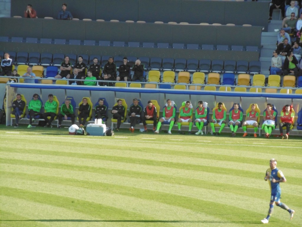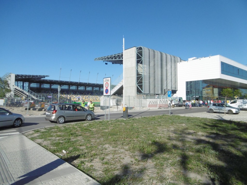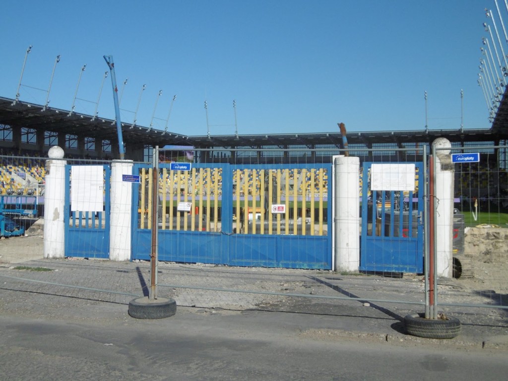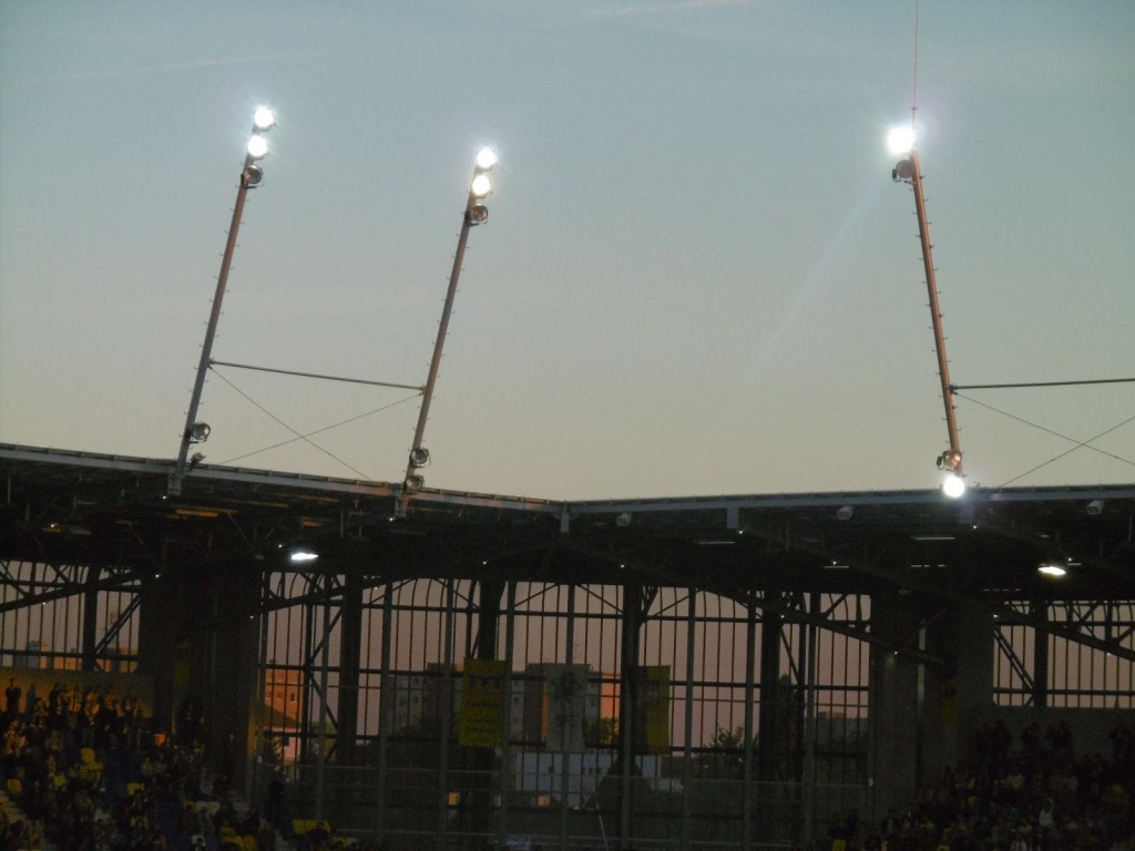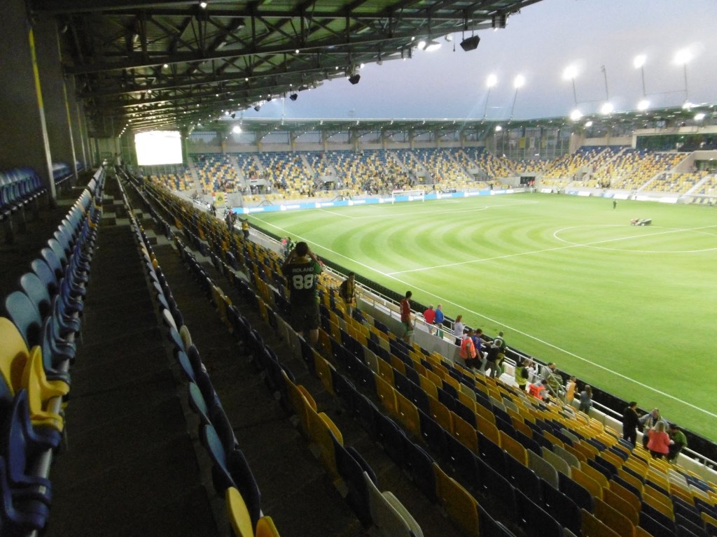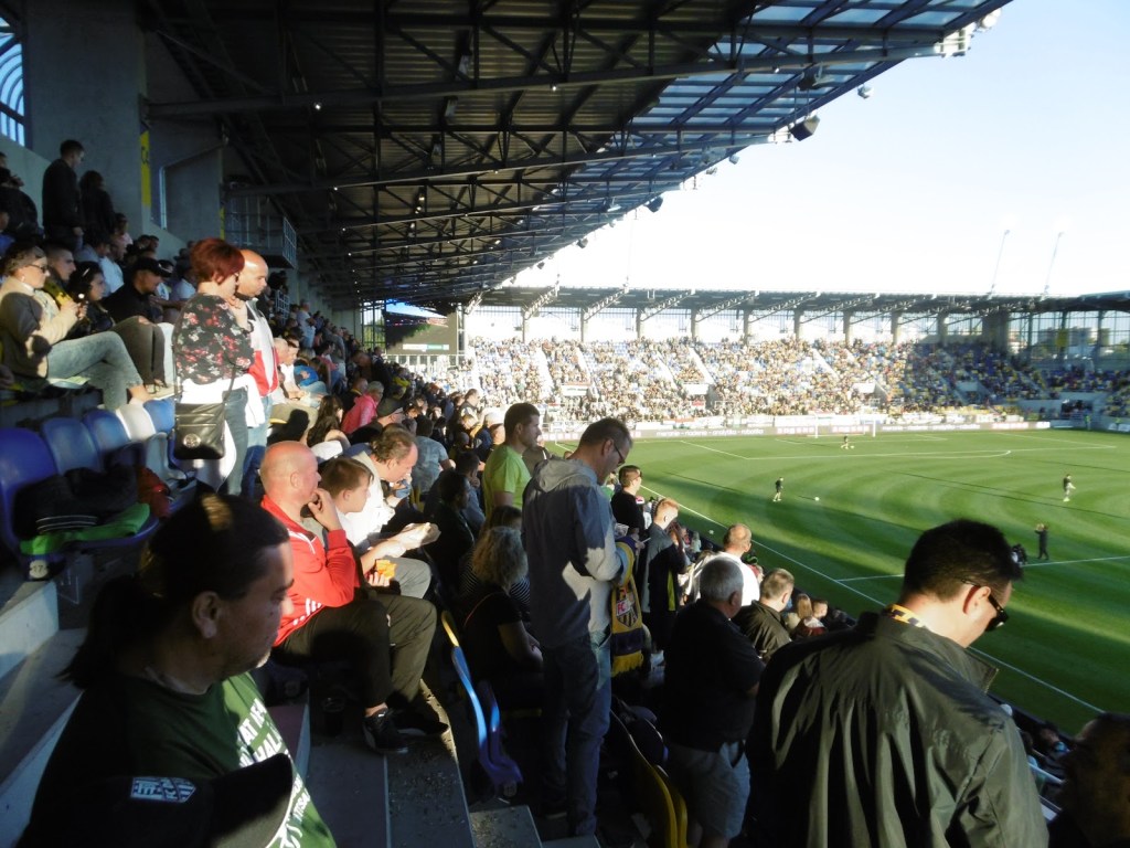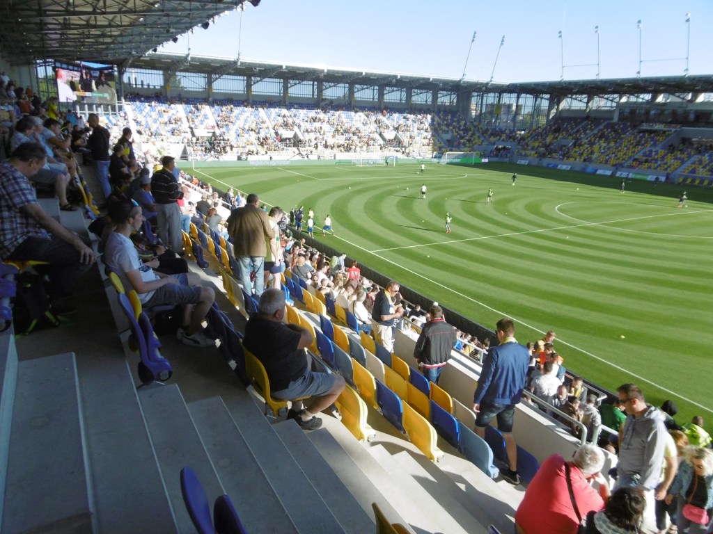 Vor sechs Jahren wurde die südslowakische Stadt schon einmal besucht. Damals hatten sie zwar gerade einen (bekannten) neuen Trainer, aber das Stadion war noch sehr, sehr alt. In den letzten Jahren wurde dieses schrittweise abgetragen, das Spielfeld um 90 Grad gedreht und schön langsam rundherum eine neue Spielstätte errichtet. Diese weiß zu gefallen und hebt sich angenehm von den sonst in der Slowakei üblichen, immer gleich ausschauenden Baukasten-Stadien ab. Fertig ist sie aber noch immer nicht ganz, eine kleine Hintertortribüne wird wohl im Lauf der Zeit das Rund noch schließen.