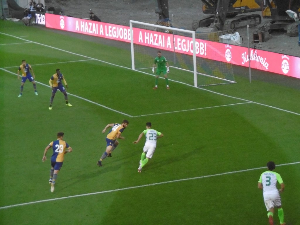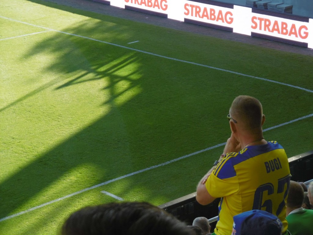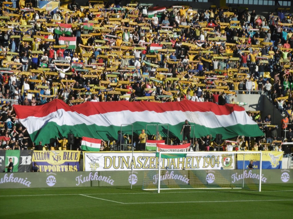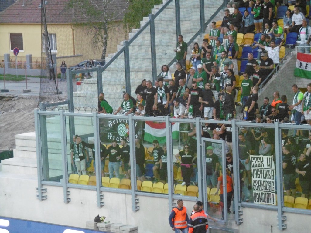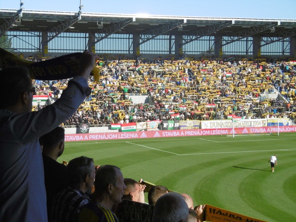 Die offizielle Zuschauerzahl ist zwar meiner Meinung nach zu hoch gegriffen, die Stimmung bei diesem eher sommerlich ruhigen Gekicke aber wirklich gut. Slowakisch hört man hier aus den Stadionlautsprechern gar nicht, auf den Tribünen lediglich vereinzelt. Stattdessen wird – nach dem feierlichen Aufziehen der entsprechenden Fahne im Sektor der Heimfans – inbrünstig die ungarische Hymne angestimmt. „Ria, ria – Hungaria!“-Rufe von beiden Fansektoren sind zudem die bei Weitem lautesten des gesamten Repertoires.