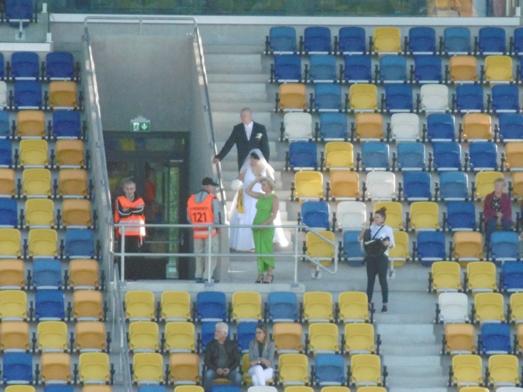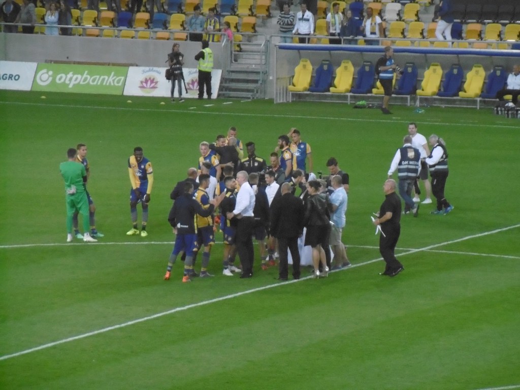 Den 1:0-Heimsieg feiert die Heimmannschaft, nachdem Ferencvaros von allen Tribünen abgefeiert und verabschiedet worden war, gemeinsam mit einem ebenfalls beim Spiel anwesenden Brautpaar – Mannschaftsfoto auf dem Rasen inklusive! So romantisch ist halt dann doch nur der Fußball…