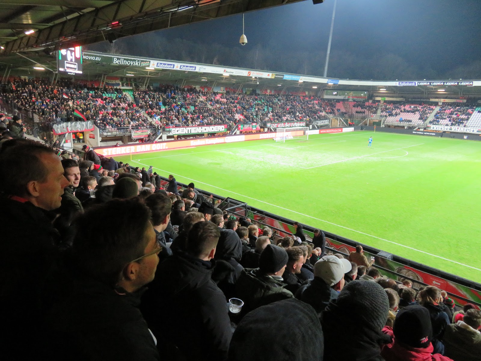 Hier also jene Erlebnisse, die wir laut deutschem Zoll nur angeblich hatten: Das Goffertstadion empfängt uns am frühen Nachmittag, gerade rechtzeitig, um davon noch einige Bilder bei Tageslicht machen zu können. Der Weg in die Innenstadt von Nijmegen wirkte zwar am Plan nicht allzu weit, stellt sich dann in der Realität aber doch als länger heraus. Mehr als belanglose Wohnstraße bekommen wir nicht zu sehen, bevor wir uns in einer Eckpizzeria für den Rückmarsch und das folgende Match stärken.