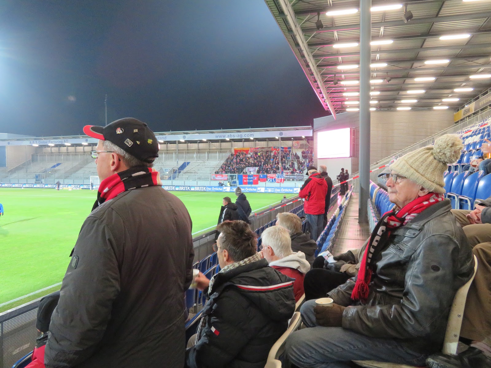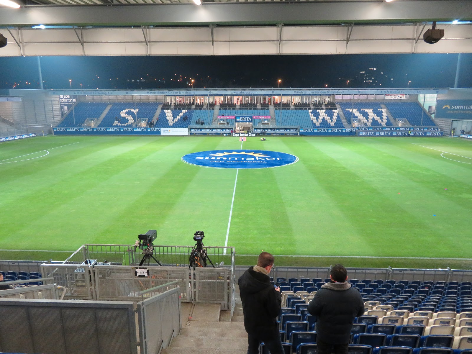 Die Brita Arena befindet sich rund zehn Minuten Fußmarsch vom Bahnhof entfernt auf einem kleinen Hügel. Von Außen wirkt sie eigentlich ziemlich adrett, ähnlich wie in Paderborn wirft sie aber jegliche Verlockung im Inneren abrupt ab. Dort stellt sie sich nämlich als reine Kombination von Stahlrohrgerüsten heraus, die leider nicht nur eine Übergangslösung sondern trauriger Dauerzustand sind.