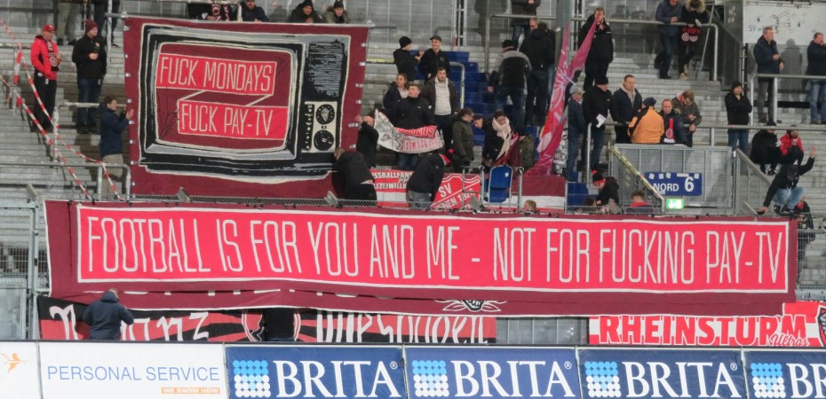 Auch fantechnisch wird es heute nicht besser, obwohl beide Lager mit Protestaktionen gegen die Montagsspiele durchaus Sympathien sammeln können. Höhepunkt davon ist ein „Scheiß DFB“-Wechselgesang zwischen beiden Kurven.