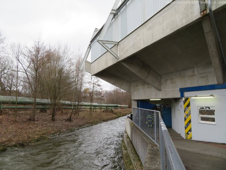 Das Stadion liegt idyllisch an der die Stadt durchfließenden Neiße. Eine der Geraden hängt sogar über den kleinen Fluß drüber – während die gegenüberliegende Seite direkt in den Berg hineingebaut ist. Diese Mischung ergibt einen Bau mit ganz eigenem Charakter, auch wenn die fast doppelt so hohe Haupttribüne dem Stadion etwas das Gleichgewicht raubt.