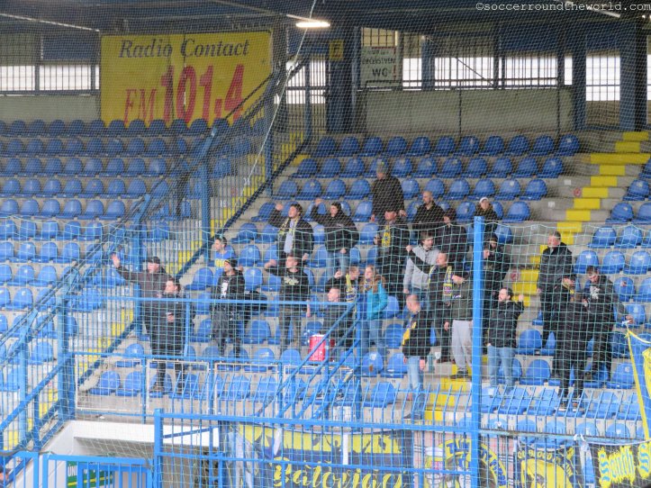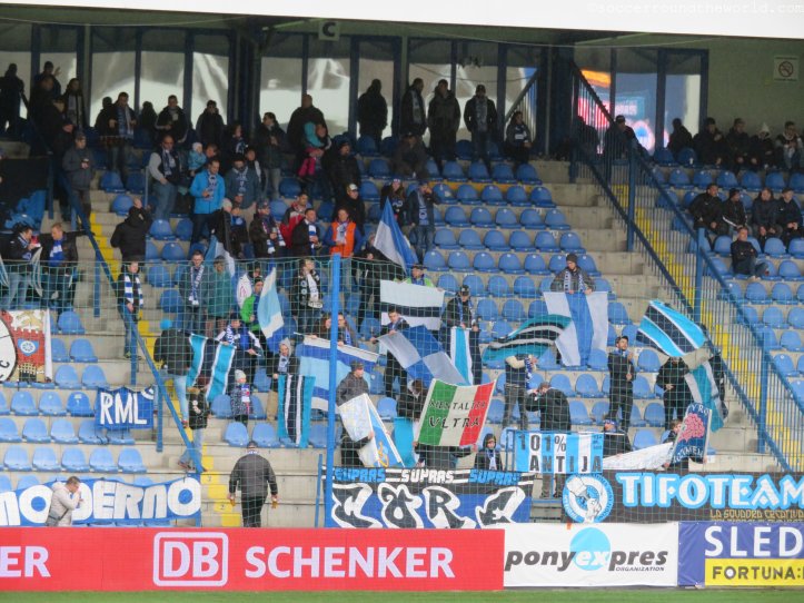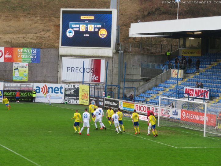 Heute zu Gast sind die „Sevci“ (Schuster) aus Zlin, deren Mannschaft ich vor knapp zwei Jahren besucht hatte. Die Handvoll mitgereister Anhänger macht durchgehend Stimmung, und kann sich gegen die zwar durchaus motivierten, aber nicht sonderlich lauten Heimfans auch immer wieder durchsetzen. Auf die anderen Tribünen springen meist nur die „Liberec“-Sprechchöre über. Ansonsten beschränkt sich der Heimsupport auf einen kleinen Sektor direkt hinter dem Tor.